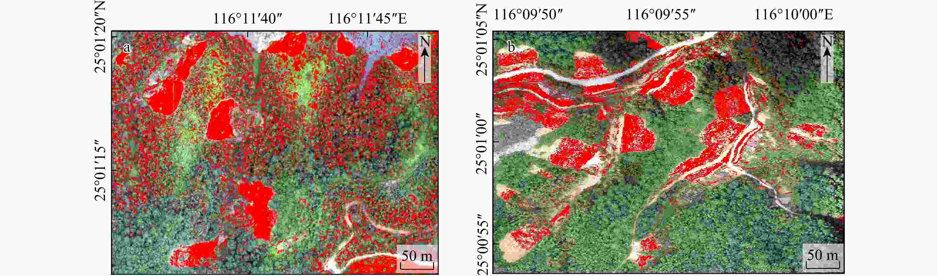 图 13  测试区早期识别模型的滑坡识别结果(a. 图4d测试区;b. 图4e测试区)