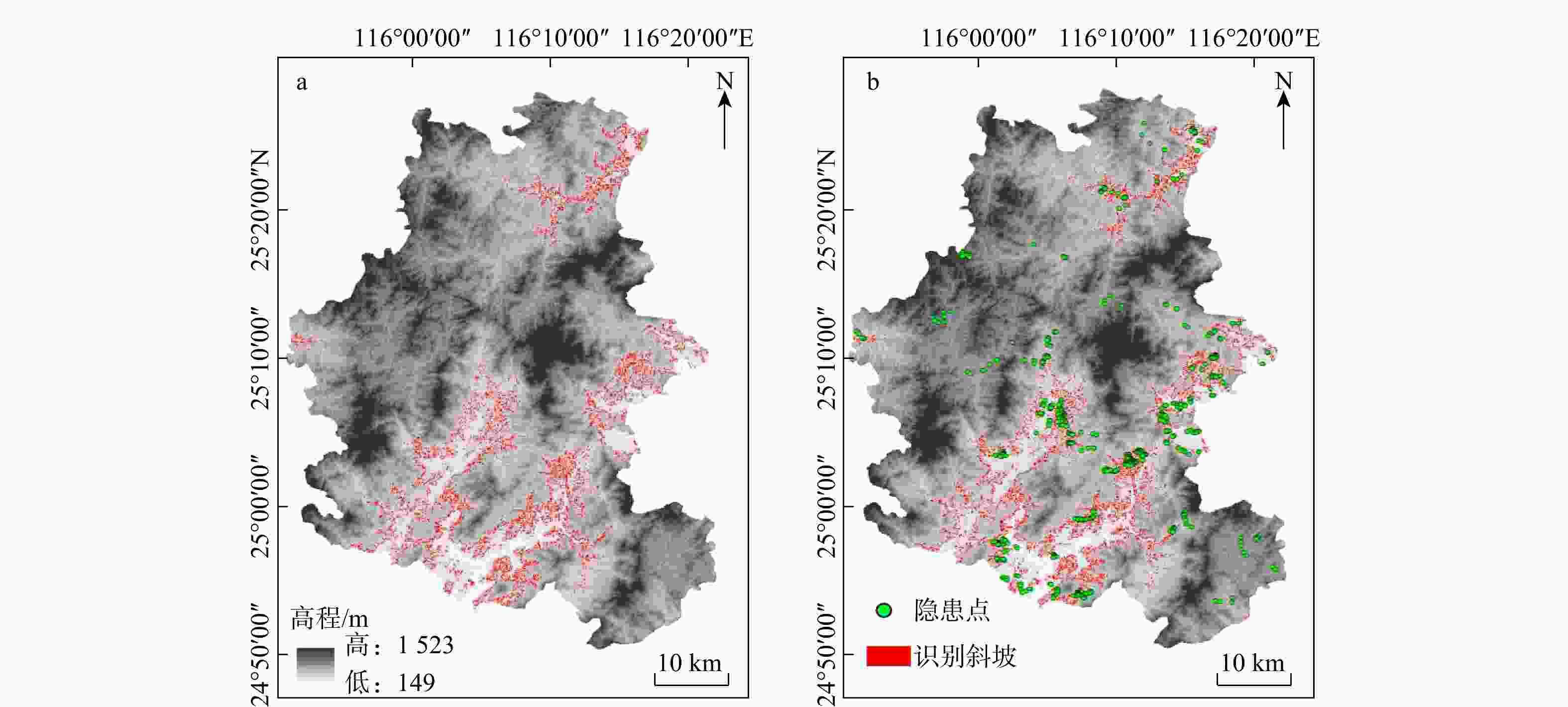 图 16  武平县斜坡灾害隐患点早期识别结果(a)与调查隐患点分布图(b)