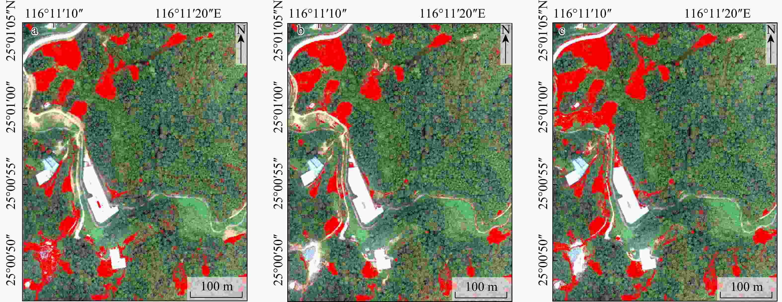 图 7  3种特征组合模型的滑坡识别结果对比图(a. 组合1;b. 组合2;c. 组合3;红色区域为识别滑坡;下同)