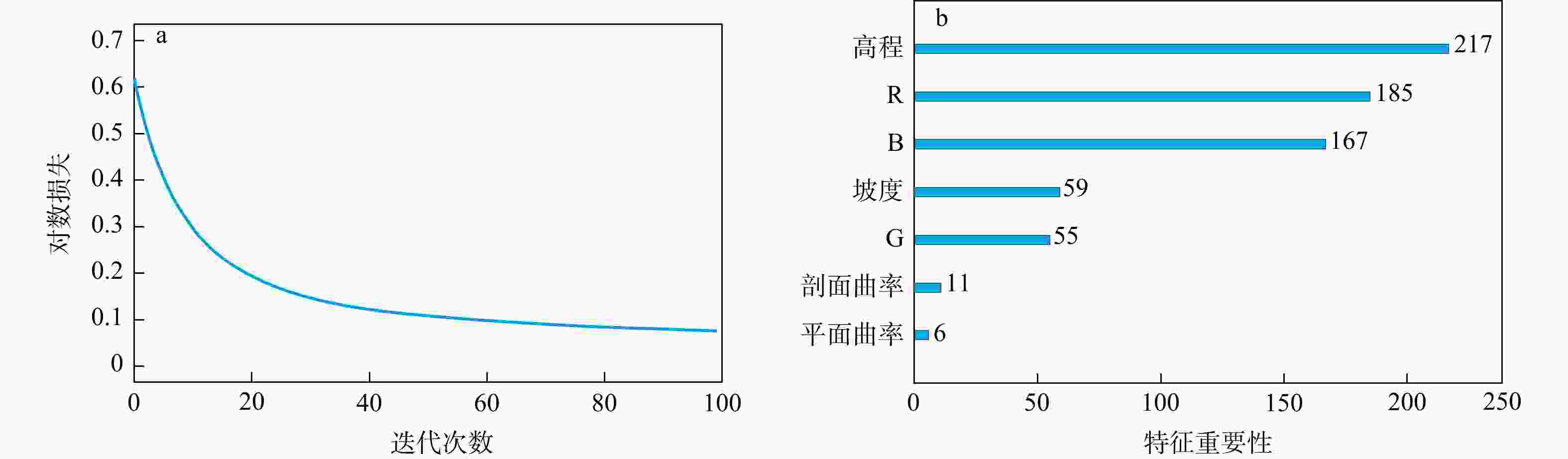 图 8  最佳特征组合模型的损失函数统计图(a)和各特征重要性输出图(b)
