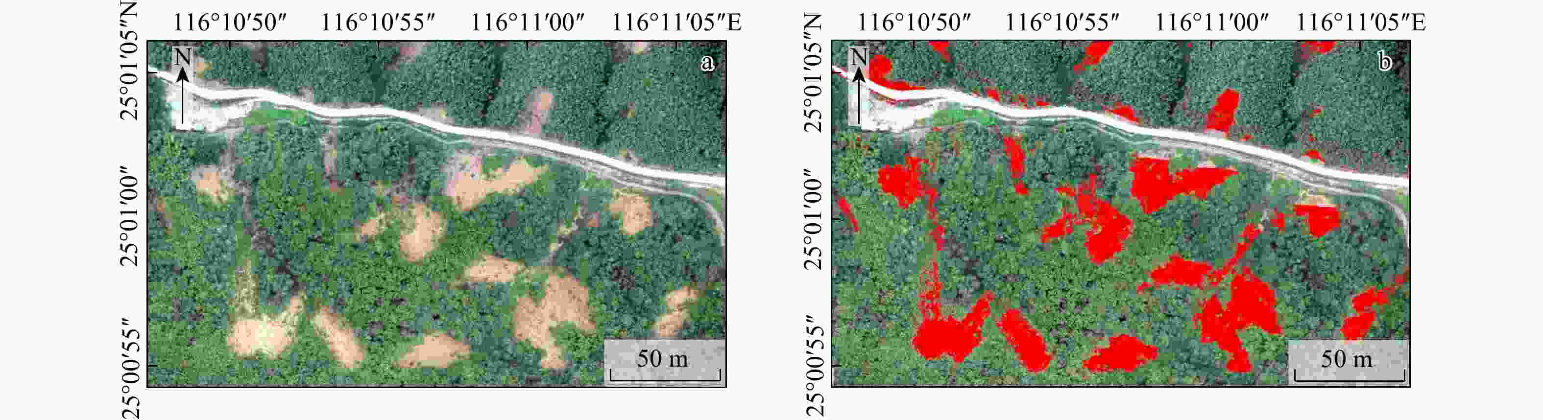 图 9  测试区原始影像 (a) 和最佳识别模型的滑坡自动识别结果 (b)(测试区见图4c