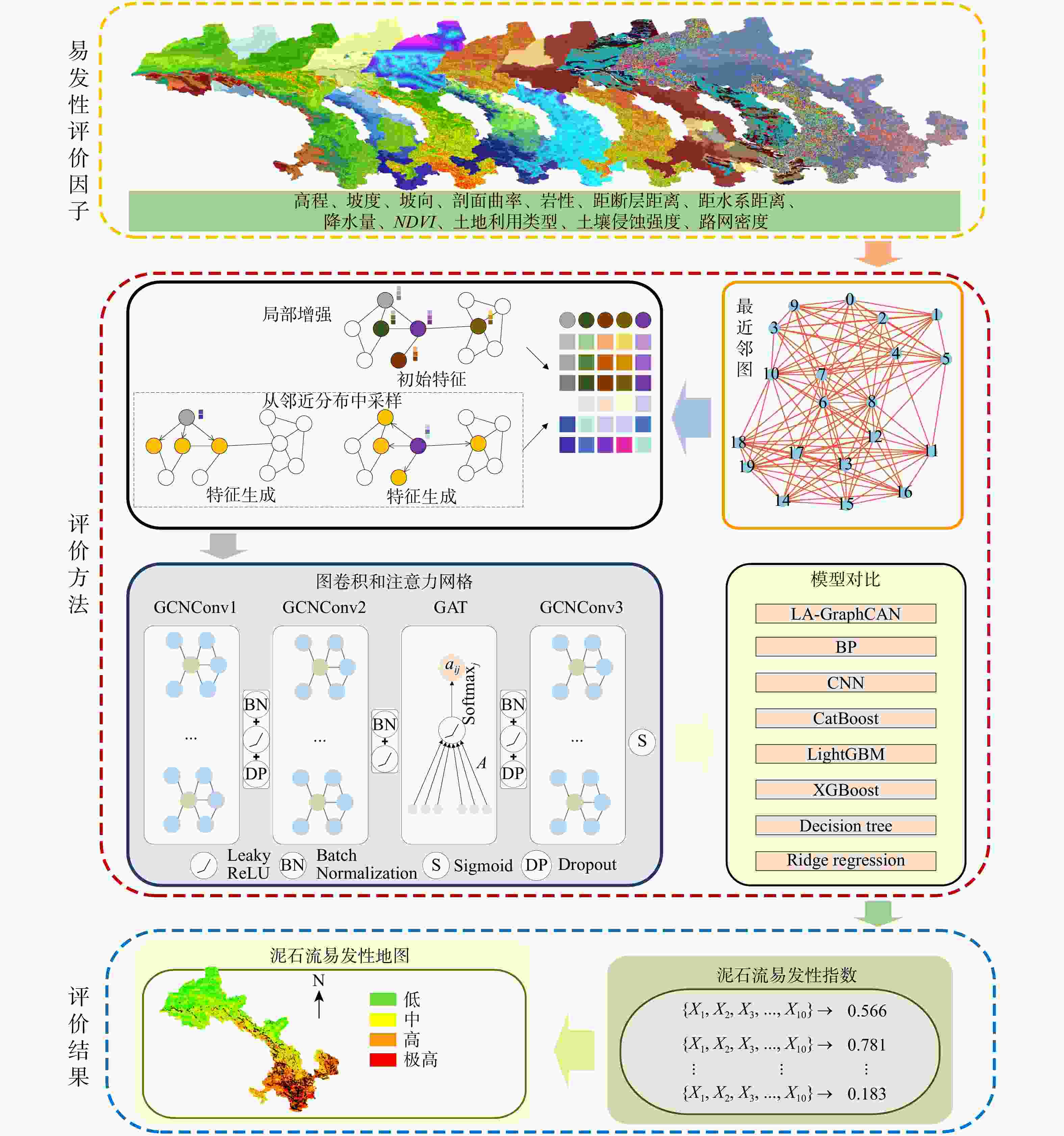 4286 个正样本点和5912 个负样本点的甘肃省泥石流数据集,提出了一种基于LA-GraphCAN(local augmentation graph convolutional and attention network)的泥石流易发性评价方法。首先,以样本点的经纬度投影坐标为基础,利用KNN(K-nearest neighbors)构建最近邻图,捕捉泥石流灾害点之间的复杂地理位置关系;其次,使用GCN(graph convolutional network)高效聚合局部邻域信息,提取关键地理和环境特征,不仅关注单个栅格所包含的信息,还深入探讨了相邻栅格之间空间结构的相互关系,从而使模型能够更精准地识别和理解样本中的局部空间特征。同时,引入GAT(graph attention network)添加动态注意力机制,细化特征表示;再次,验证所提方法的有效性,并从不同角度对比分析;最后,对甘肃省泥石流易发性进行评价。结果表明,考虑了泥石流灾害地理位置关系的LA-GraphCAN的ROC曲线下面积(AUC )、准确率、精确率、召回率以及F 1分数分别为0.9868 ,0.9458 ,0.9436 ,0.9228 和0.9331 ,与主流机器学习模型CNN(convolutional neural networks)、Decision tree等相比最优。基于LA-GraphCAN评价的甘肃省泥石流极高易发区中历史泥石流灾害点数量为4055 个,占甘肃省历史泥石流总数的95%,与历史灾害分布基本一致。性能评估和甘肃省泥石流易发性评价结果均表明考虑泥石流灾害空间依赖性的LA-GraphCAN方法的评价结果更优,在泥石流易发性评价研究中有较好的适用性。-