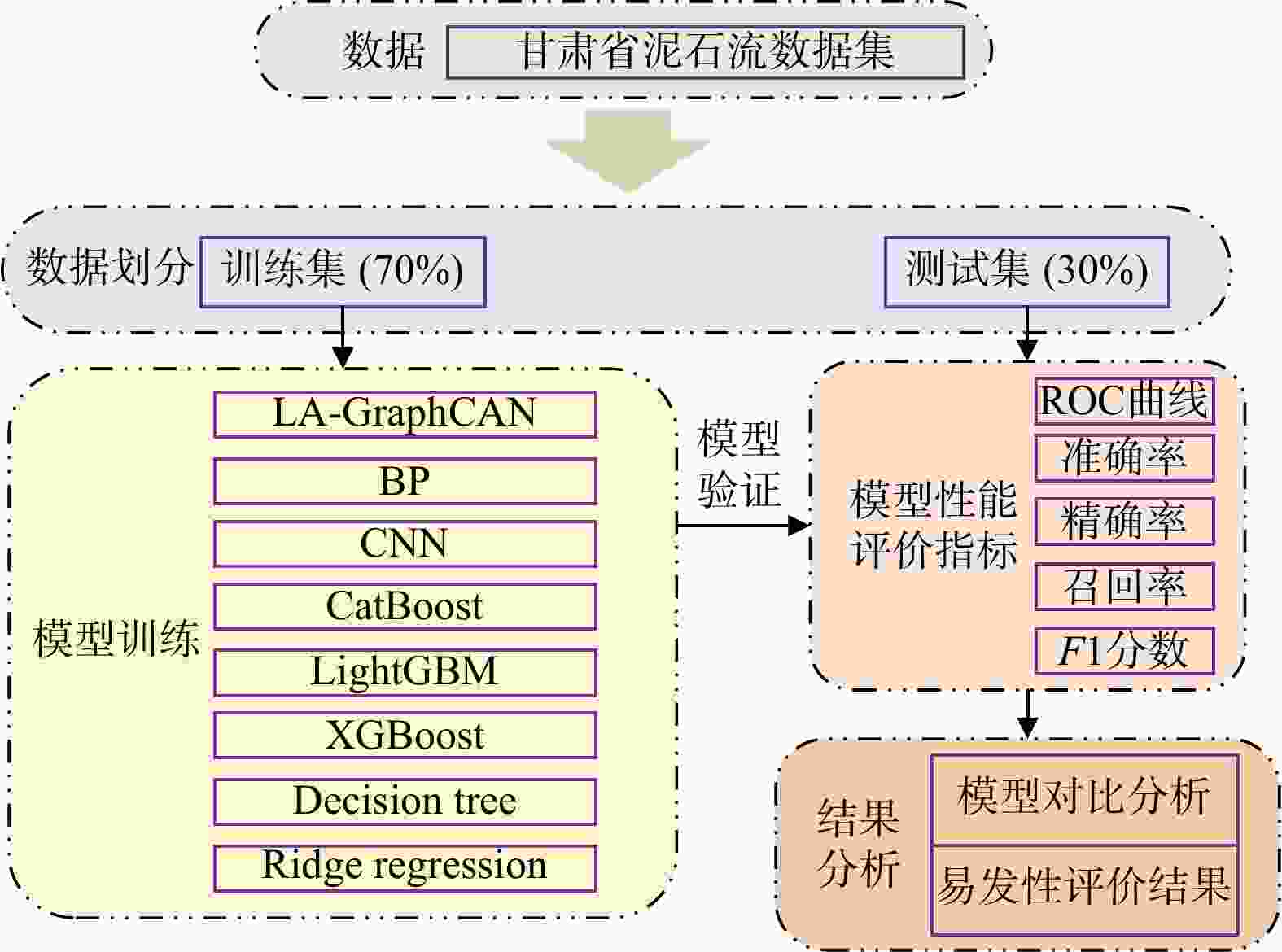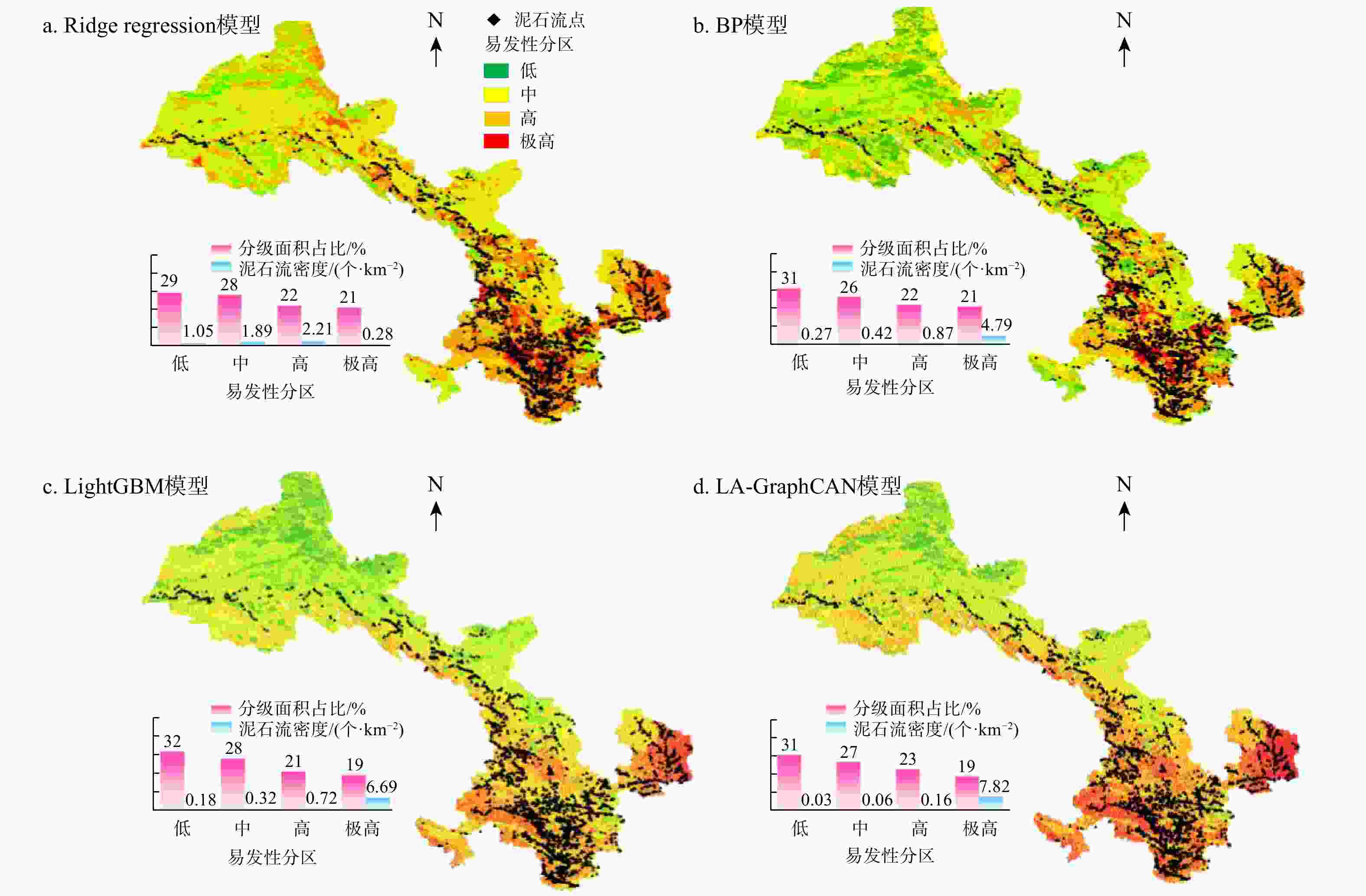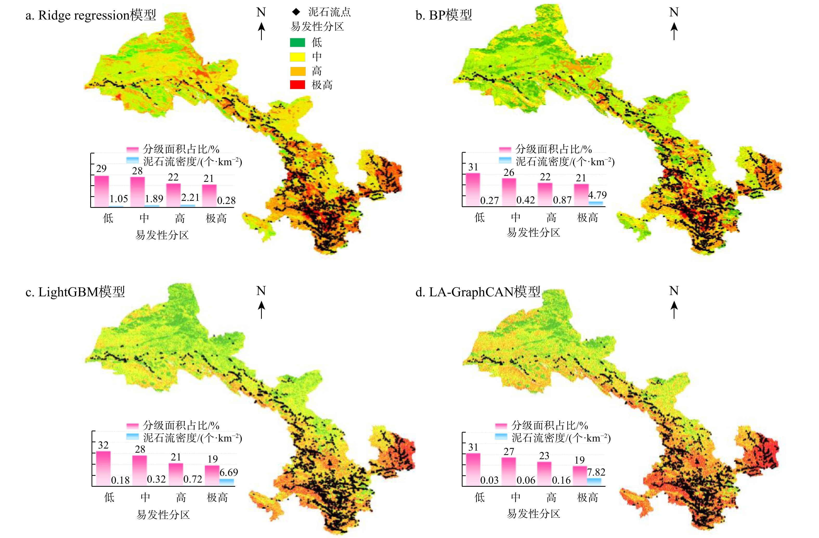 F 1score of the LA-GraphCAN model, which considers the geographical location relationship of debris flow disasters, are0.9868 ,0.9458 ,0.9436 ,0.9228 , and0.9331 , respectively, outperforming models such as CNN and Decision tree.Conclusion Both the performance evaluations and the assessment results of debris flow susceptibility in Gansu Province indicate that the LA-GraphCAN method, which takes into account the spatial dependence of debris flow disasters, yields superior assessment results and exhibits excellent applicability.