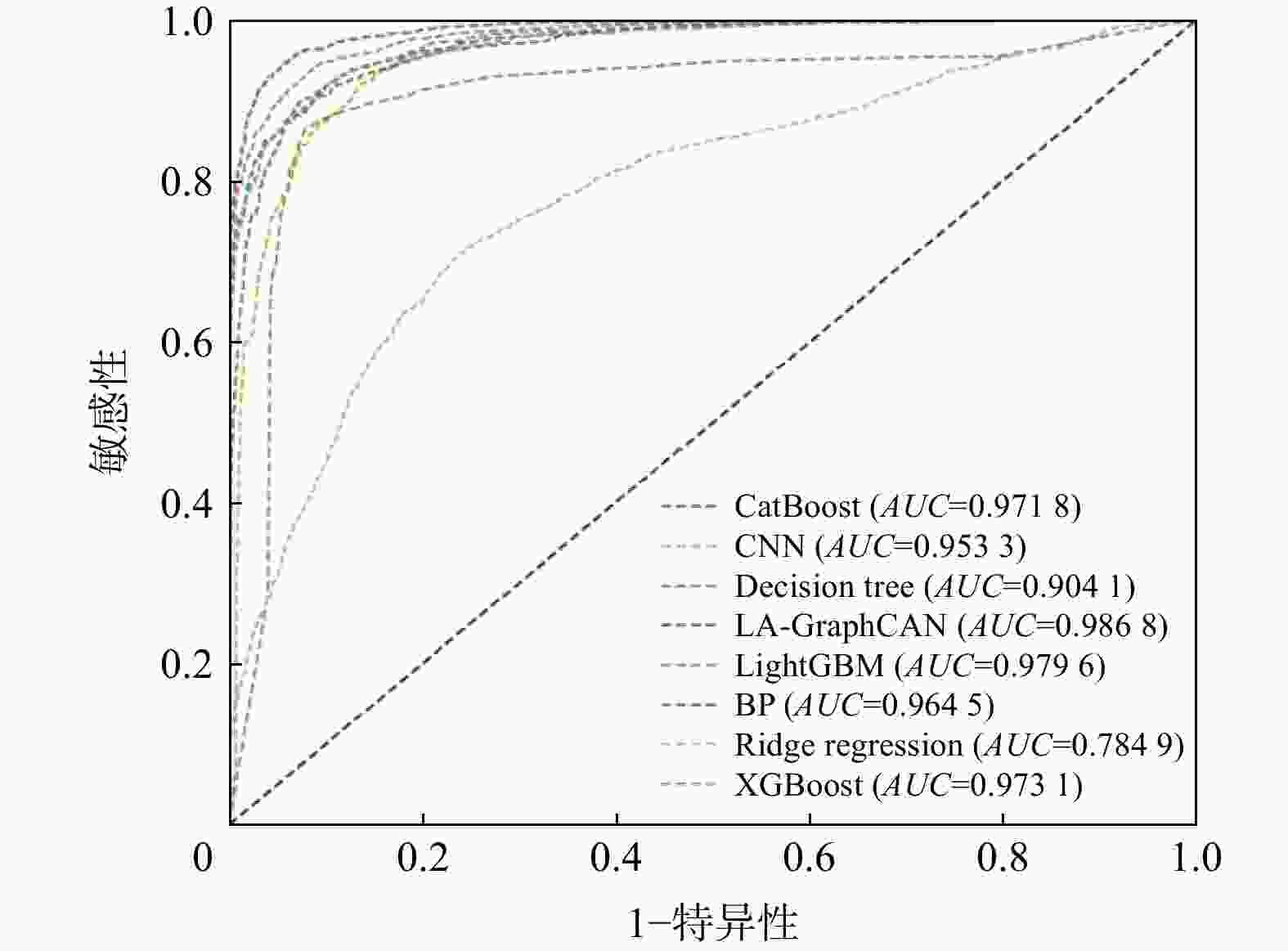 参数项 参数值 最近邻数 10 GCNConv1 out_channels(第1层图卷积输出通道) 32 GCNConv2 out_channels(第2层图卷积输出通道) 64 GAT out_channels(图注意力机制输出通道) 32 GAT Heads (图注意力机制头数) 4 GCNConv3 out_channels(第3层图卷积输出通道) 1 优化器 Adam 初始化学习率 0.01 Dropout率 0.5 损失函数 二元交叉熵损失 最大迭代次数 5000 表 2 不同模型对比