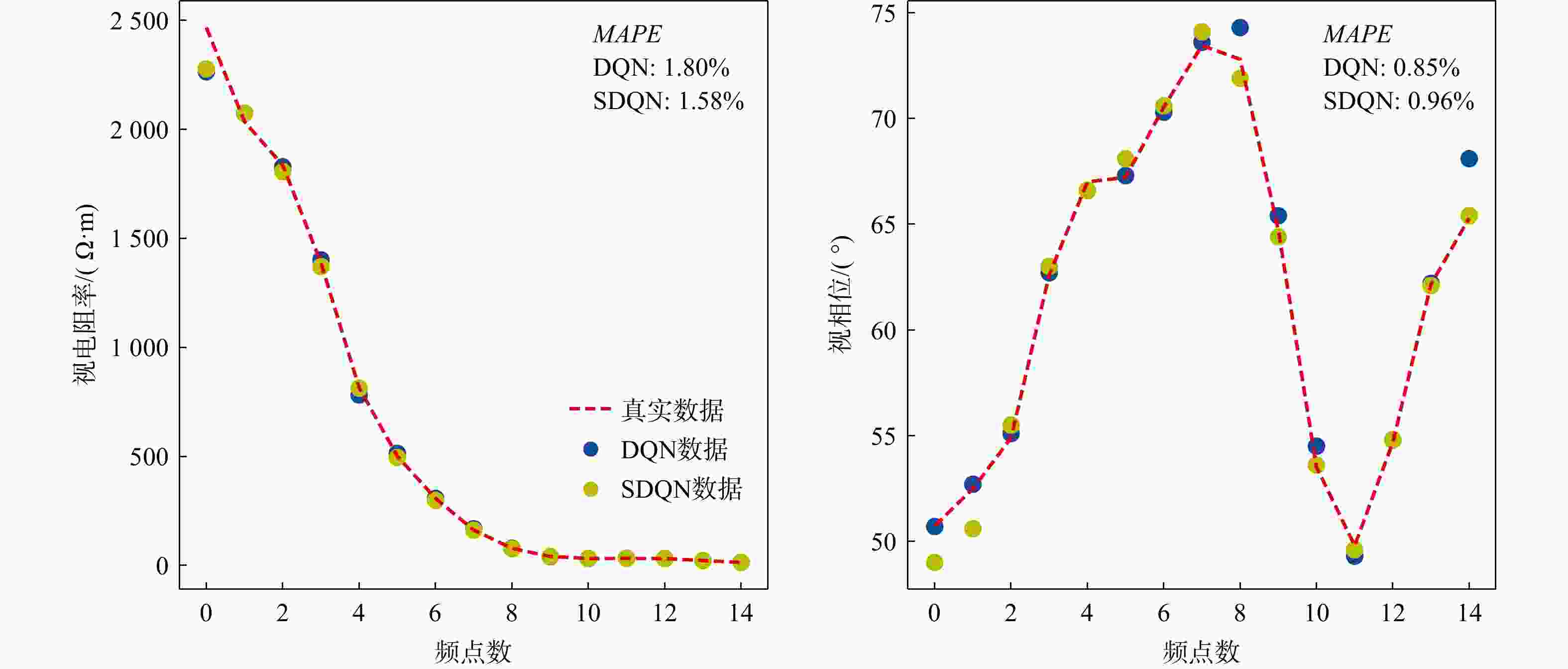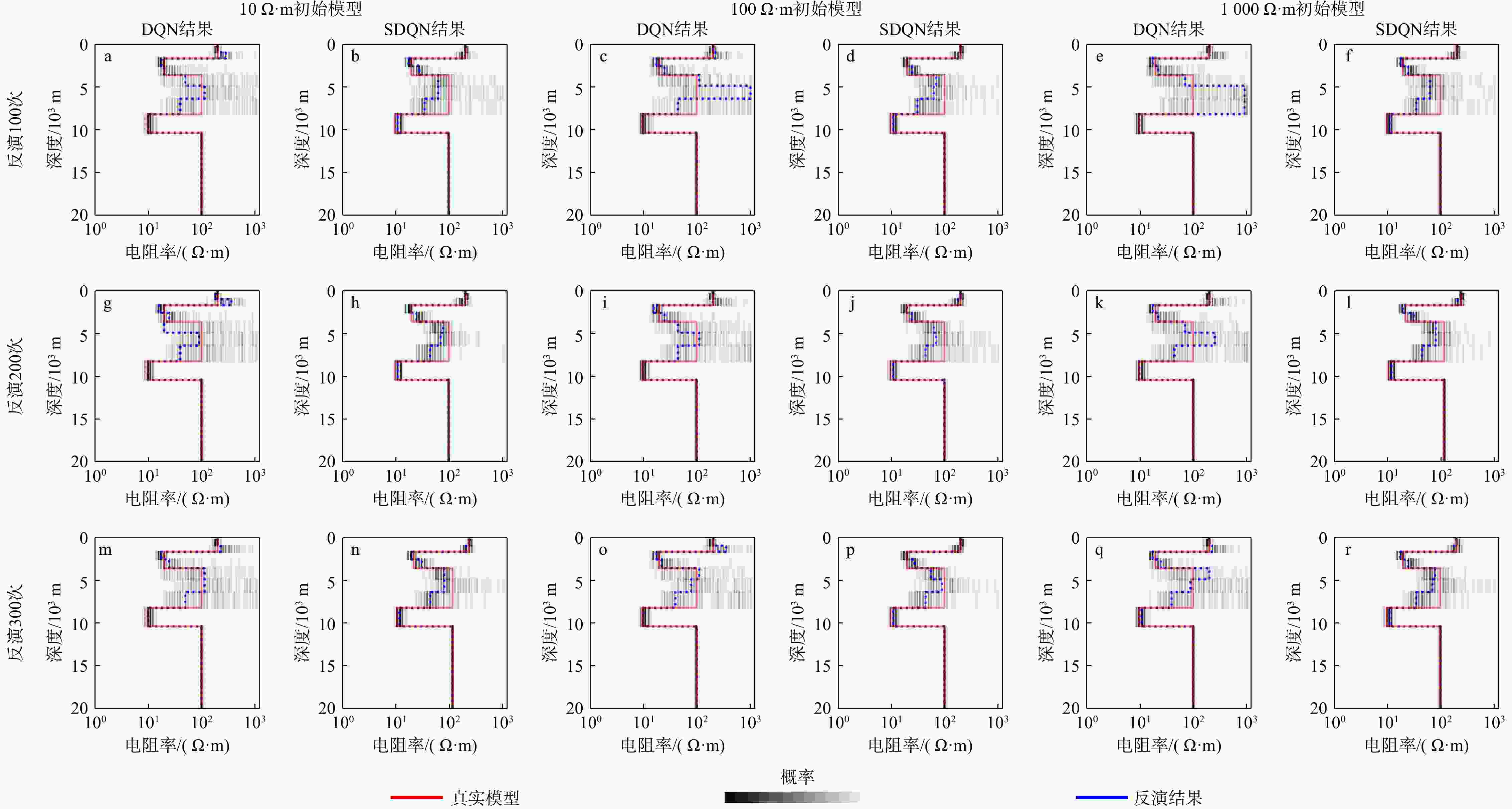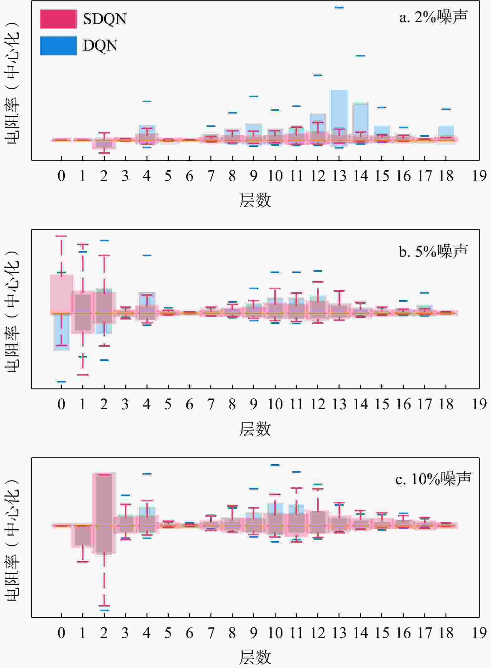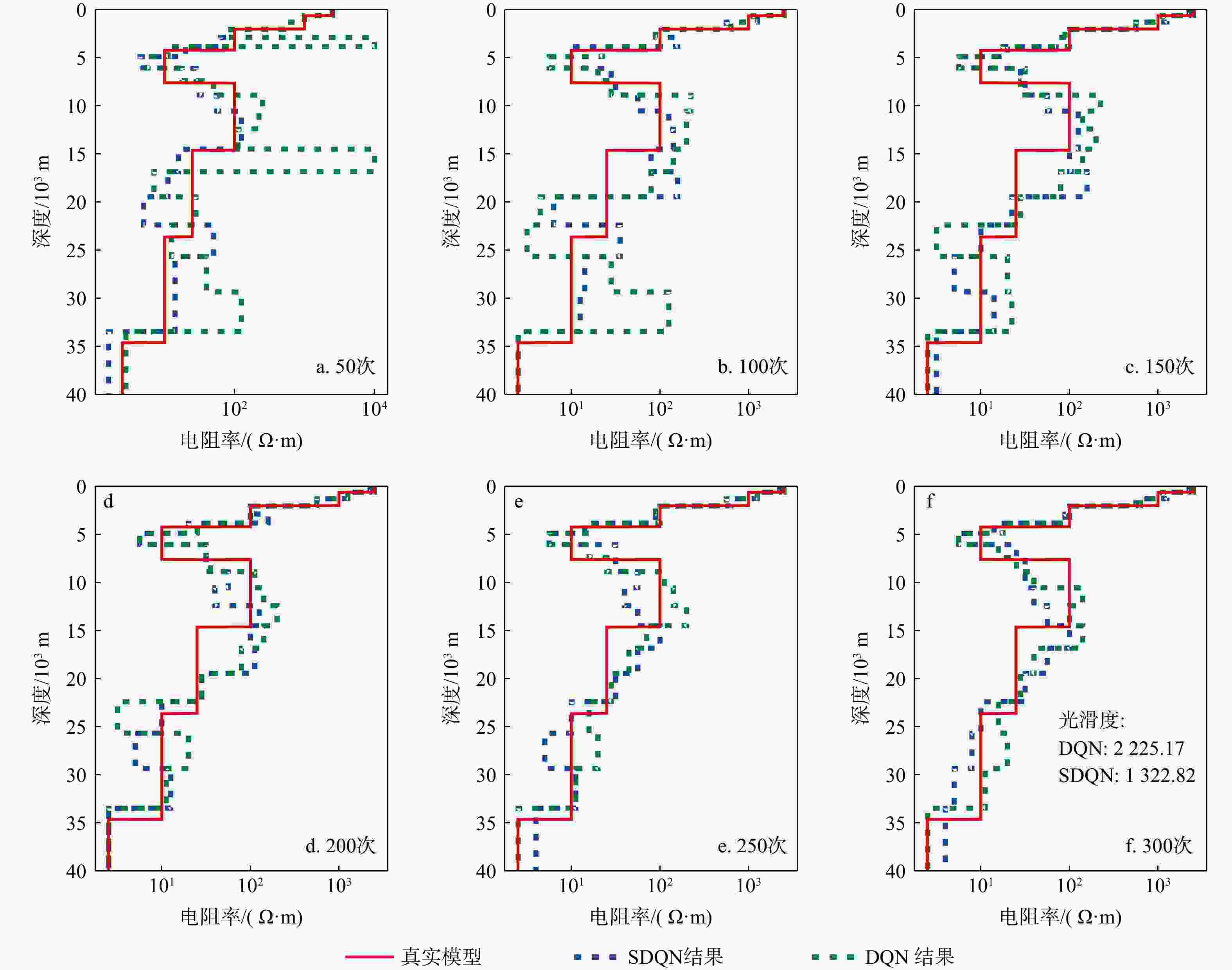 反演次数 最终结果的均方误差 所有结果的均方误差的方差 DQN SDQN DQN SDQN 100 99.97 14.23 2532.45 296.60 200 13.355 15.094 3019.32 427.82 300 25.332 12.0845 2134.51 201.47 表 5 8层理论模型电阻率和厚度