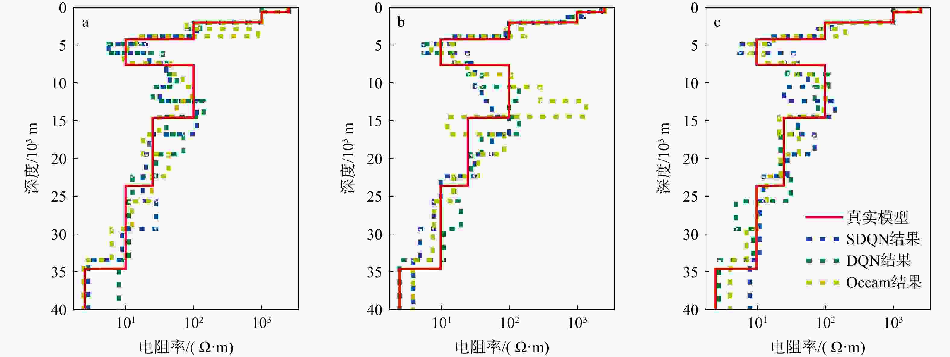 this paper proposes the use of deep reinforcement learning with a smooth constraint to invert magnetotelluric data (Smooth DQN, SDQN) . This method is based on the framework of reinforcement learning,considers the inversion problem as a Markov decision problem, and defines the termsenvironment ,reward ,agent , and so on. Then, the model constraint term of regularized inversion is introduced into the reward function,guiding the agent to continuously adjust the resistivity parameters of the prediction model to obtain results that are more consistent with the model constraints.Results The experimental results of the theoretical model inversion show that, compared with the DQN inversion and Occam inversion methods, the results of the proposed method are more stable when the observed data are inverted with the same number of iterations and different noise levels. The inversion results of the magnetotelluric measured data in the Tashi Kang Mine area of Tibet are