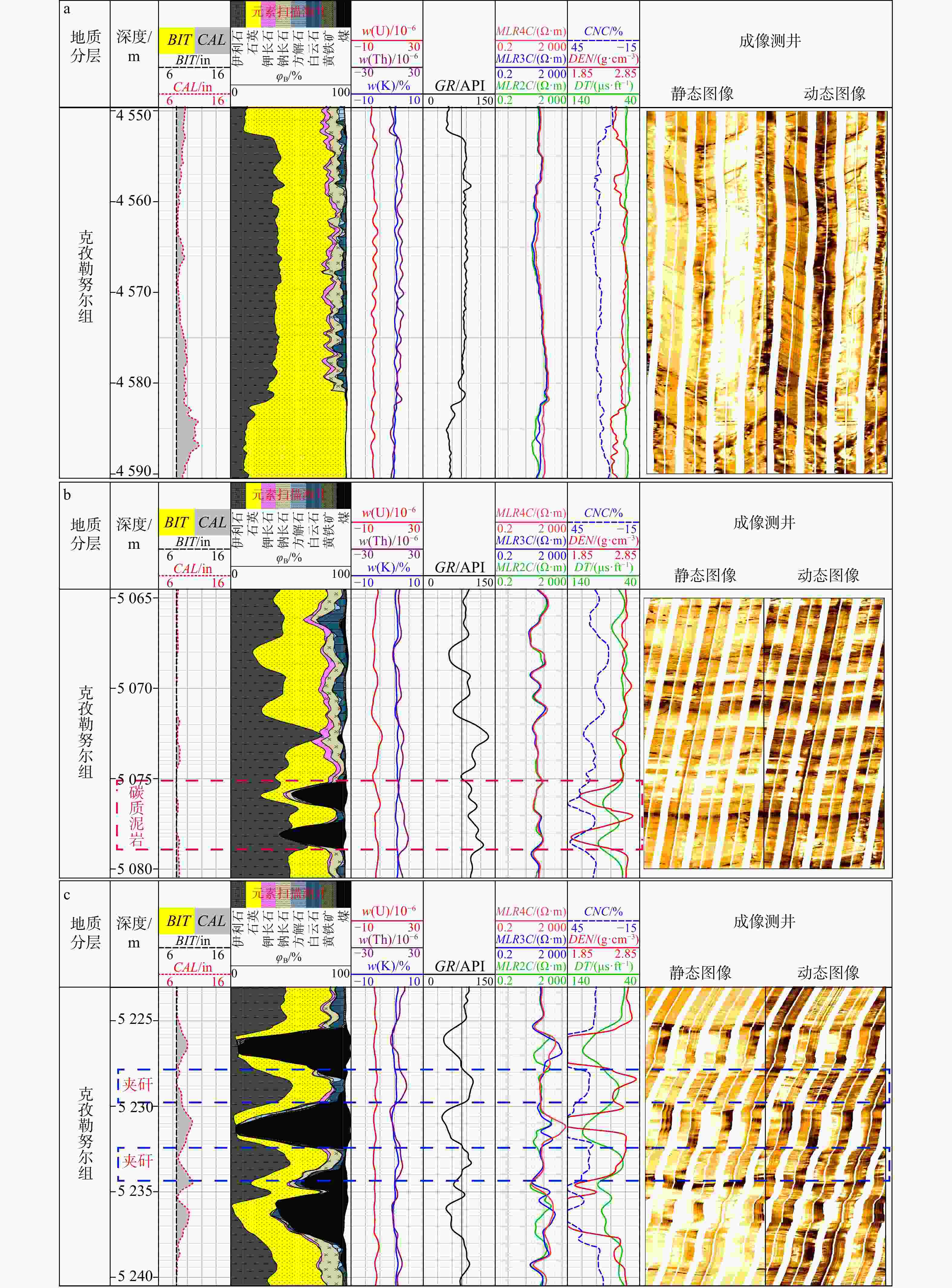 图 4 库车坳陷DB501井侏罗系克孜勒努尔组暗色泥岩(a)、碳质泥岩(b)和煤(c)常规−成像−元素扫描测井响应