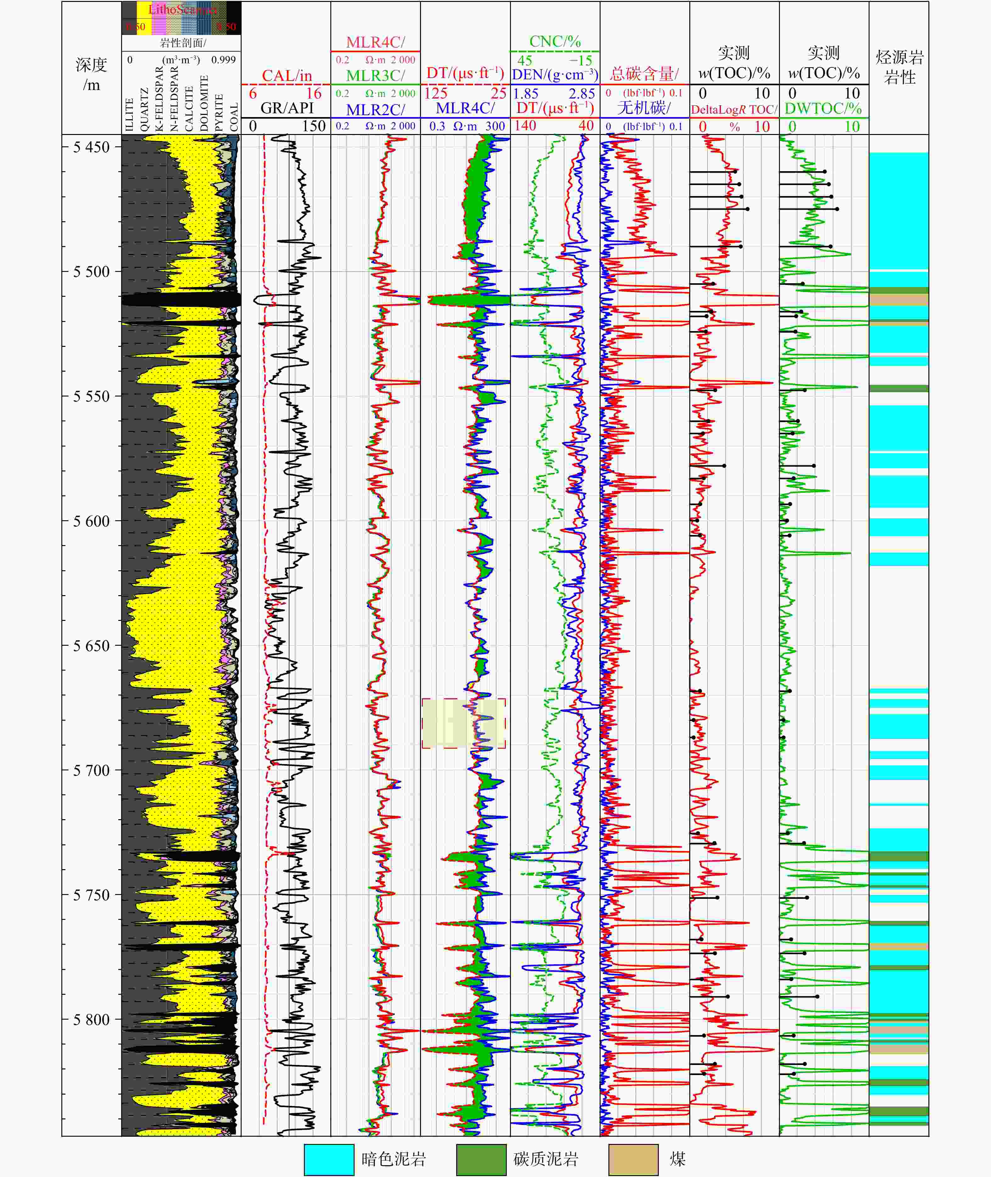 库车坳陷三叠系、侏罗系发育湖泊相和沼泽相间互沉积的5套烃源岩层系,按岩性可划分出煤、炭质泥岩和暗色泥岩,其烃源岩具有总有机碳(TOC)丰度较高、厚度大、分布范围广等特征。由于烃源岩纵向分布层系多,不同岩性分布及纵向非均质性强,导致常用的Δlg