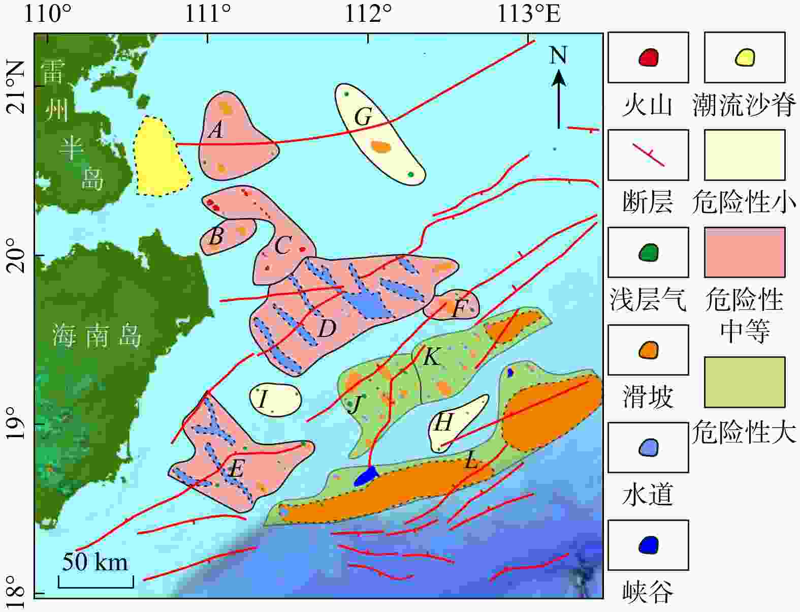 区域编号 东经/(°) 北纬/(°) 主要灾害类型 灾害危险性 A 110.94~111.45 20.43 ~20.96 滑坡 中等 B 110.95~111.31 19.99 ~ 20.21 滑坡 中等 C 110.96~111.68 19.81 ~ 20.40 海底火山 中等 D 111.26~112.57 19.27 ~ 19.98 水道浊流 中等 E 110.75~111.67 18.46 ~ 19.19 水道浊流/滑坡/