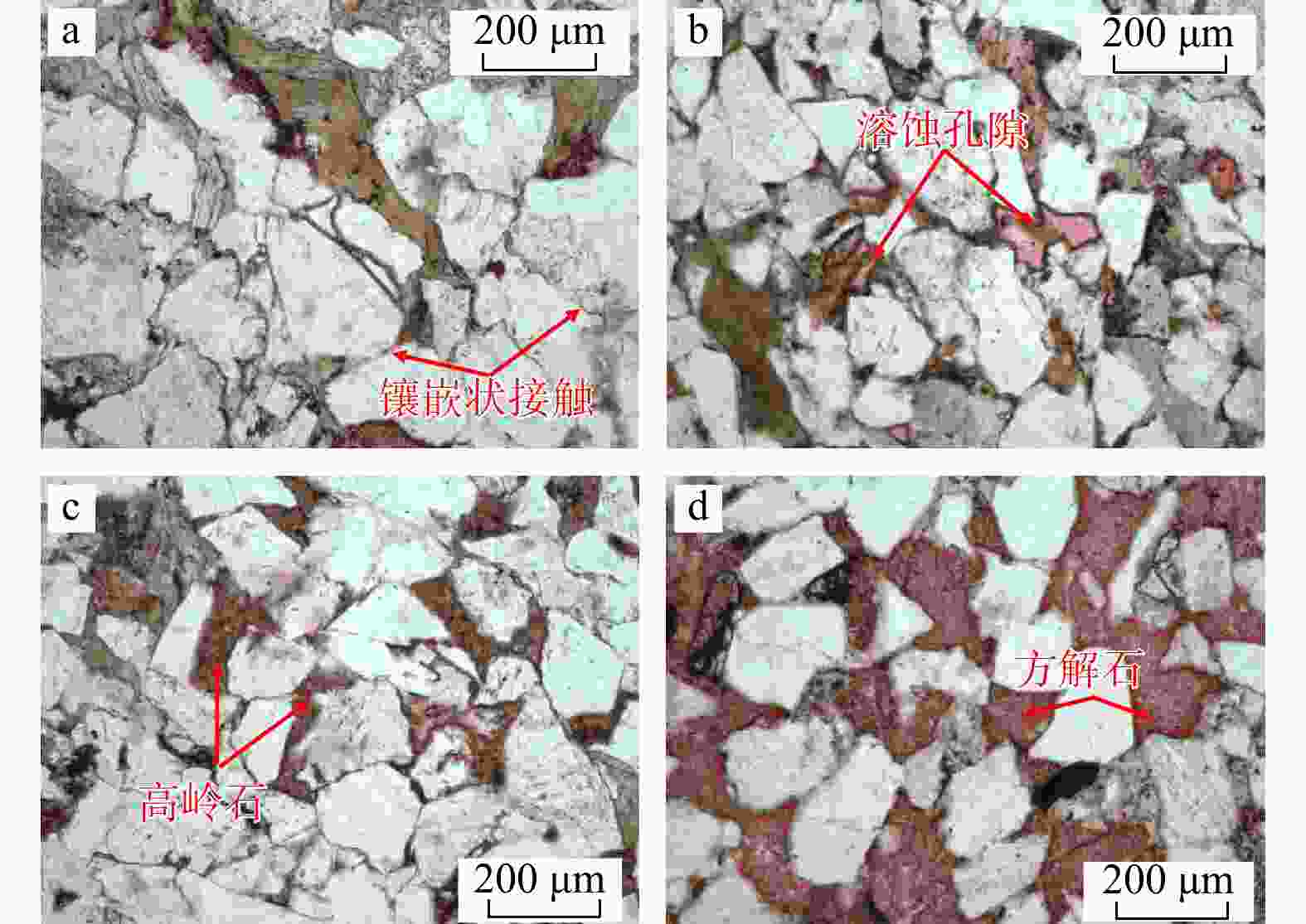 a. 样品X1,压实作用强烈,矿物颗粒镶嵌状接触;b. 样品X5,溶蚀孔隙发育;c. 样品X3,高岭石填充孔隙;d. 样品X7,方解石镶嵌状填充孔隙