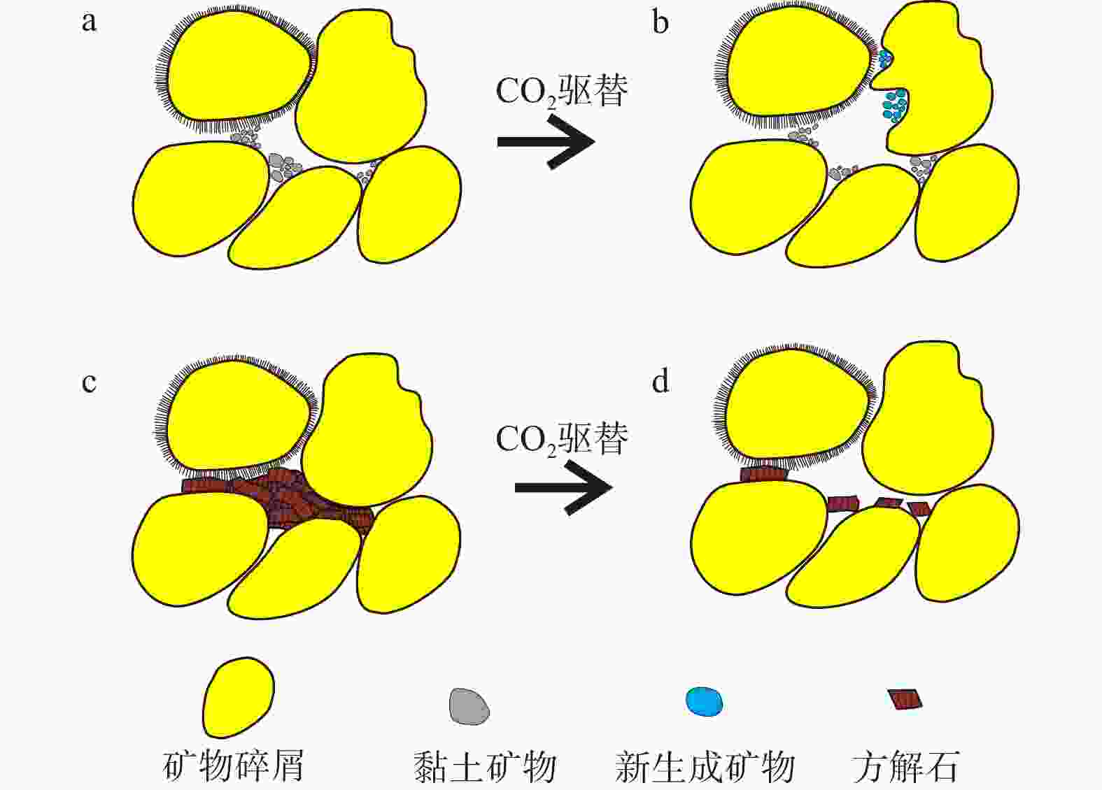 a. CO2驱替前黏土矿物分布;b. CO2驱替后形成的矿物填充孔隙;c. CO2驱替前方解石充填孔隙;d. CO2驱替后方解石溶蚀形成新的孔隙