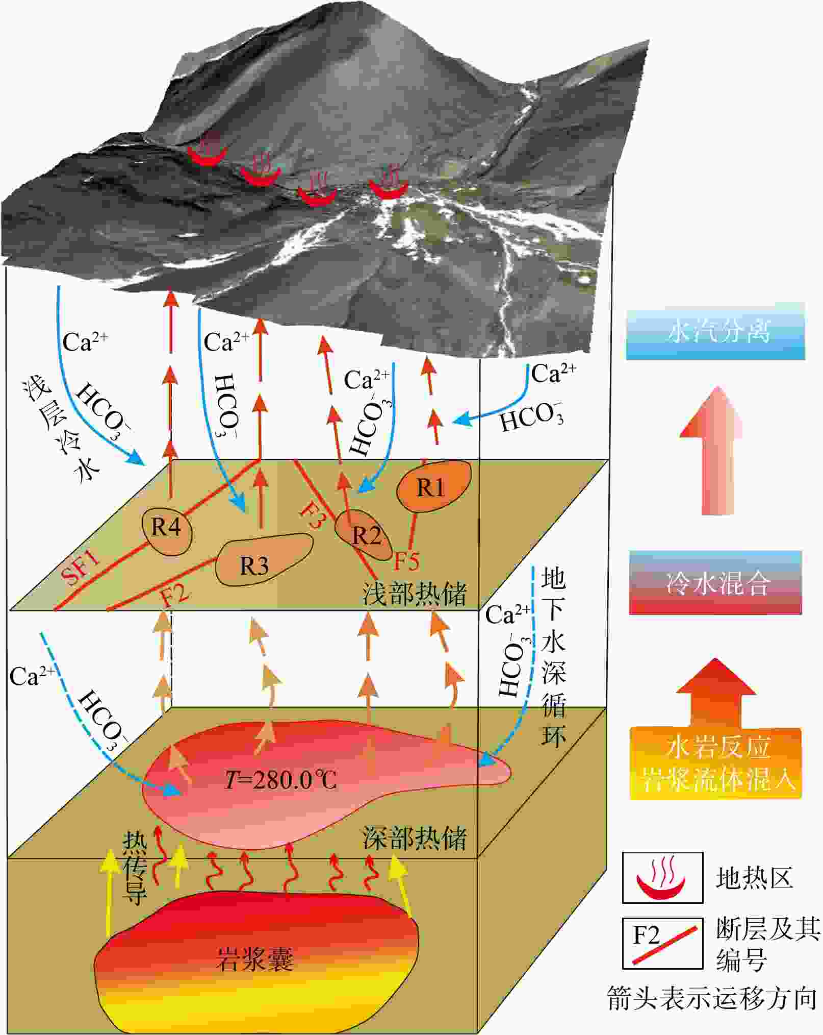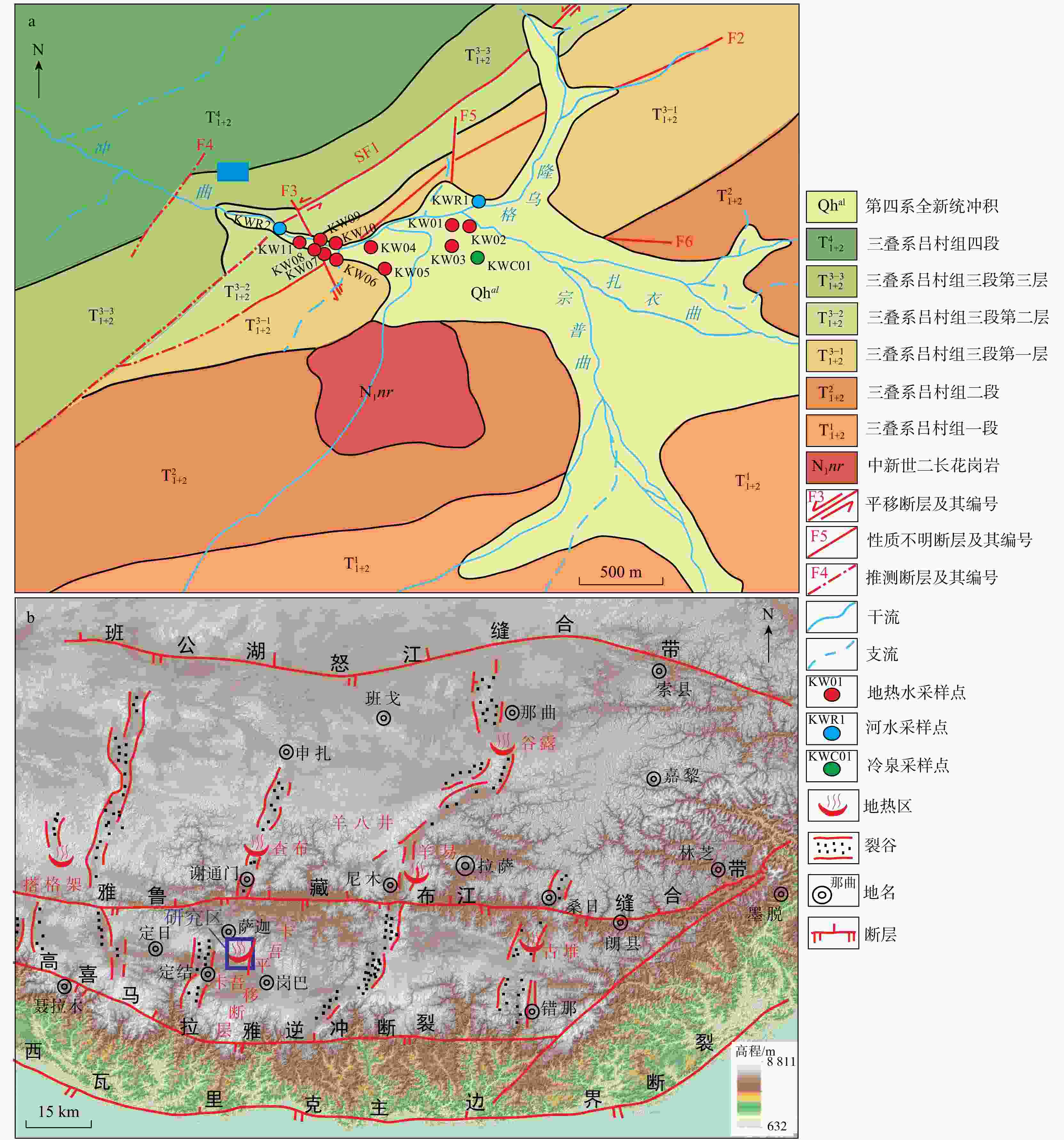 卡吾是藏南地区典型的高温水热系统,具有较大的开采潜力,而现阶段对其成因机制还远未充分认识,限制了地热资源的进一步开发利用。为了进一步探究卡吾地热区地热成因及热源,基于卡吾地热区地热水和浅层冷水的水文地球化学和氢氧同位素特征,评估了地热系统的热储温度,探讨了地热水形成过程中的水文地球化学过程(水-岩反应、冷水混合、水-汽分离等),识别了地热系统的深部热源,进而揭示了地热系统的成因机制。结果表明:地热水水化学类型主要为HCO3-Cl-Na 型,Na-K温标计算的深层统一热储温度为280℃,K-Mg温标和石英温标计算的浅层热储温度约175℃,冷水混合比例为50%~76%,还原的深部热储氘氧同位素范围分别为−207.20‰~−185.25‰,−22.26‰~−17.74‰。基于以上认识,提出了卡吾地热系统的成因模式:卡吾为一具有岩浆热源的的地热系统,深部统一的母地热流体沿区域内不同断裂向上运移并经过不同水文地球化学过程形成4个不同分布的浅部热储,最终出露形成卡吾地热水。研究成果为卡吾地热区地热资源的合理开发和高效利用提供了重要的指导作用,并可为藏南地区同类型地热系统成因机制的研究提供借鉴思路。