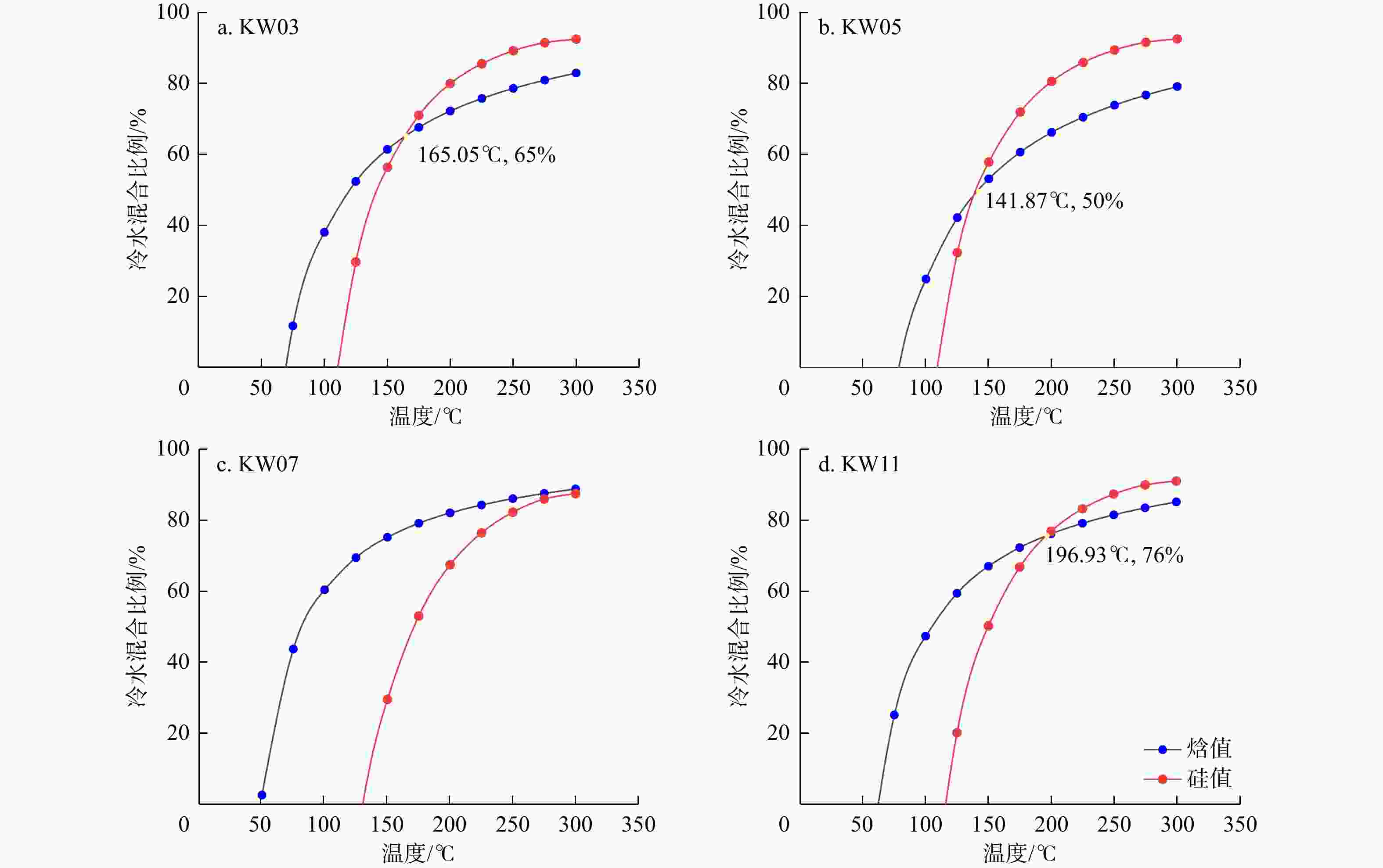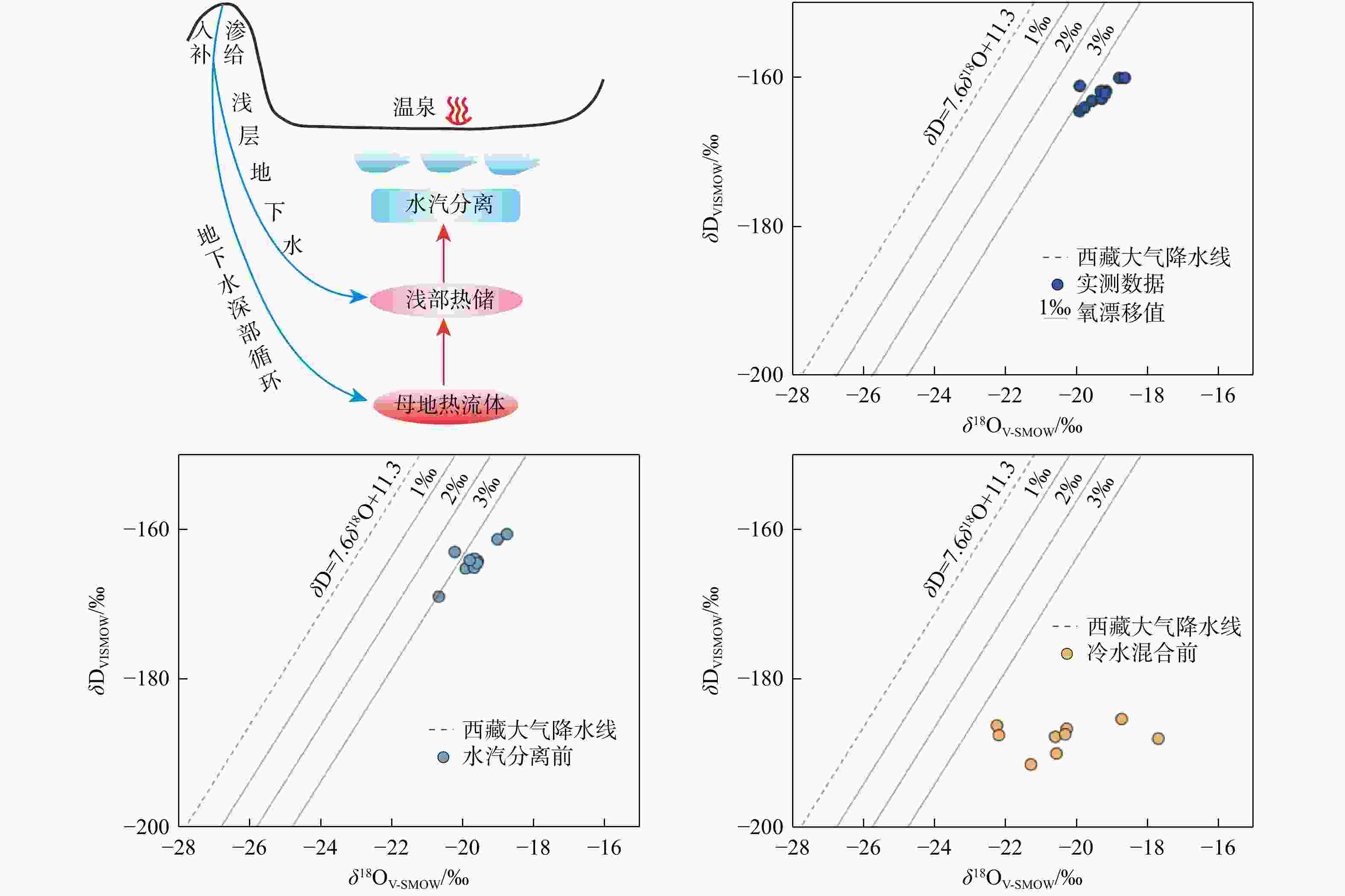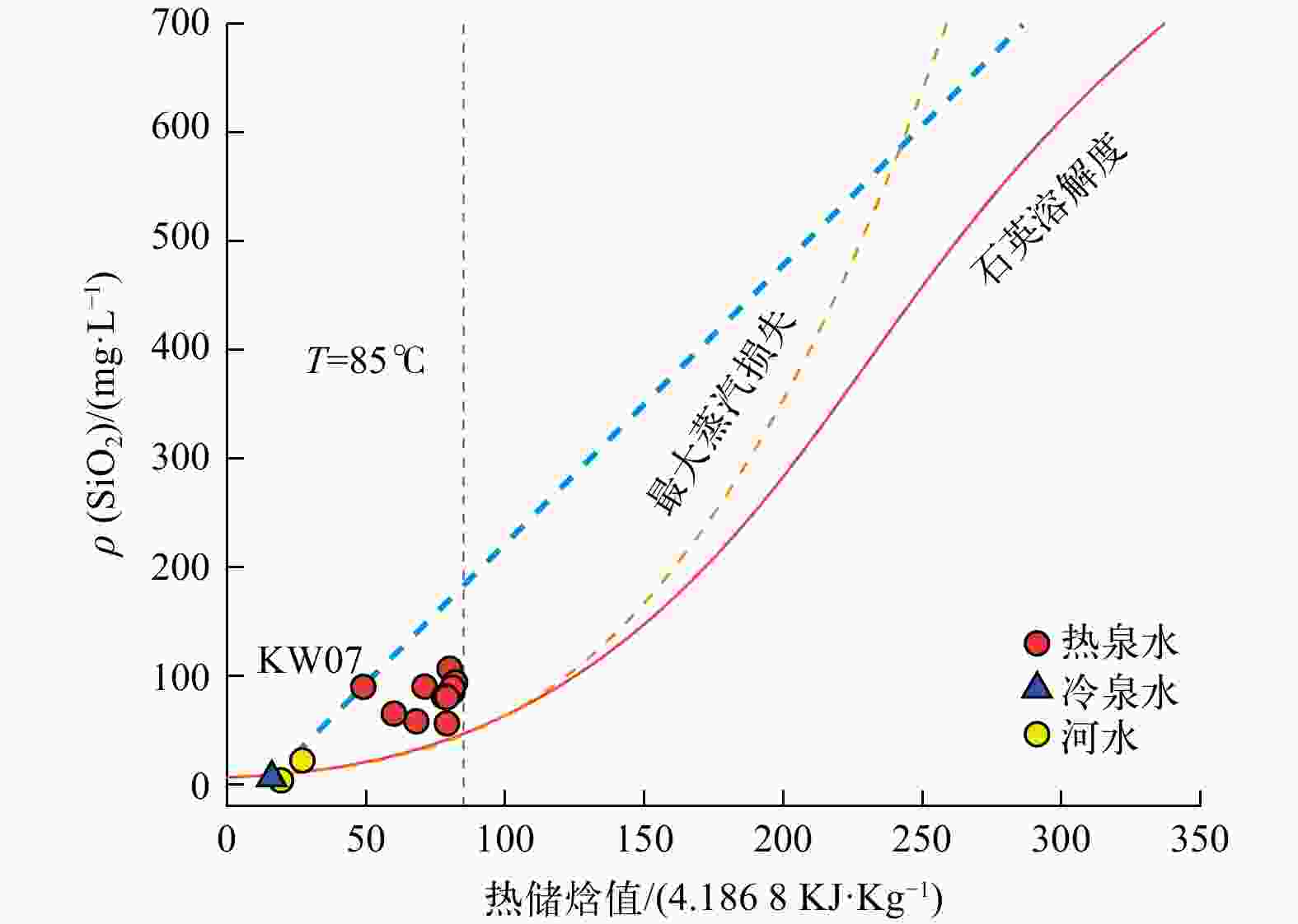 编号 KW01 KW02 KW03 KW04 KW05 KW06 KW08 KW09 KW10 KW11 H0/(kJ·kg−1) 438.55 515.39 478.63 494.33 654.31 505.63 392.39 492.23 513.84 359.68 fv/% 3.60 6.95 5.34 6.03 13.00 6.52 1.59 5.94 6.88 0.16 表 2 卡吾地区地热水氢氧同位素值偏移还原计算