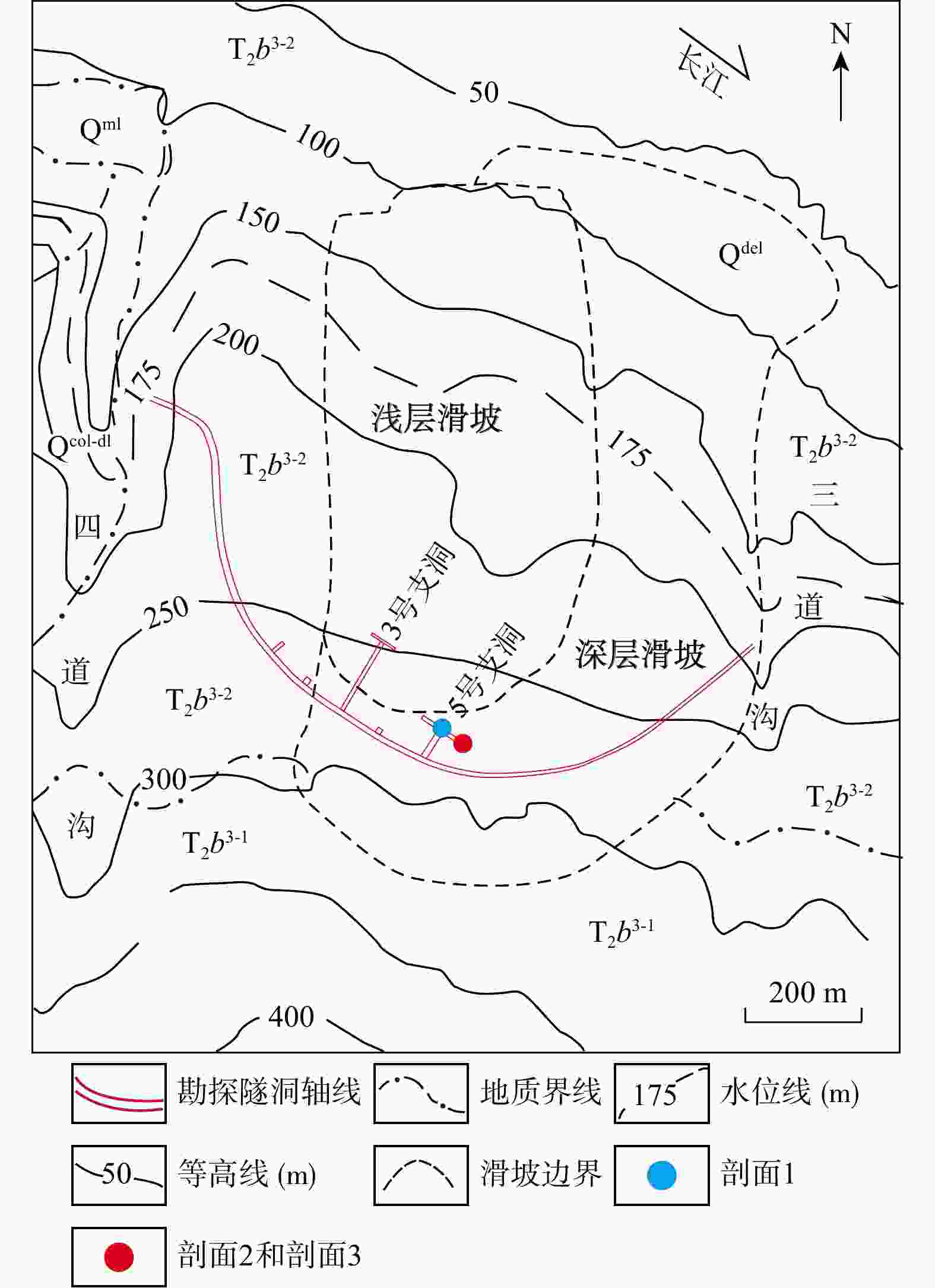Qml. 第四系人工填土;Qdel. 第四系滑坡堆积层;Qcol-dl. 第四系崩积-坡积层;T2b3-2. 中三叠统巴三-二段;T2b3-1. 中三叠统巴三-一段;