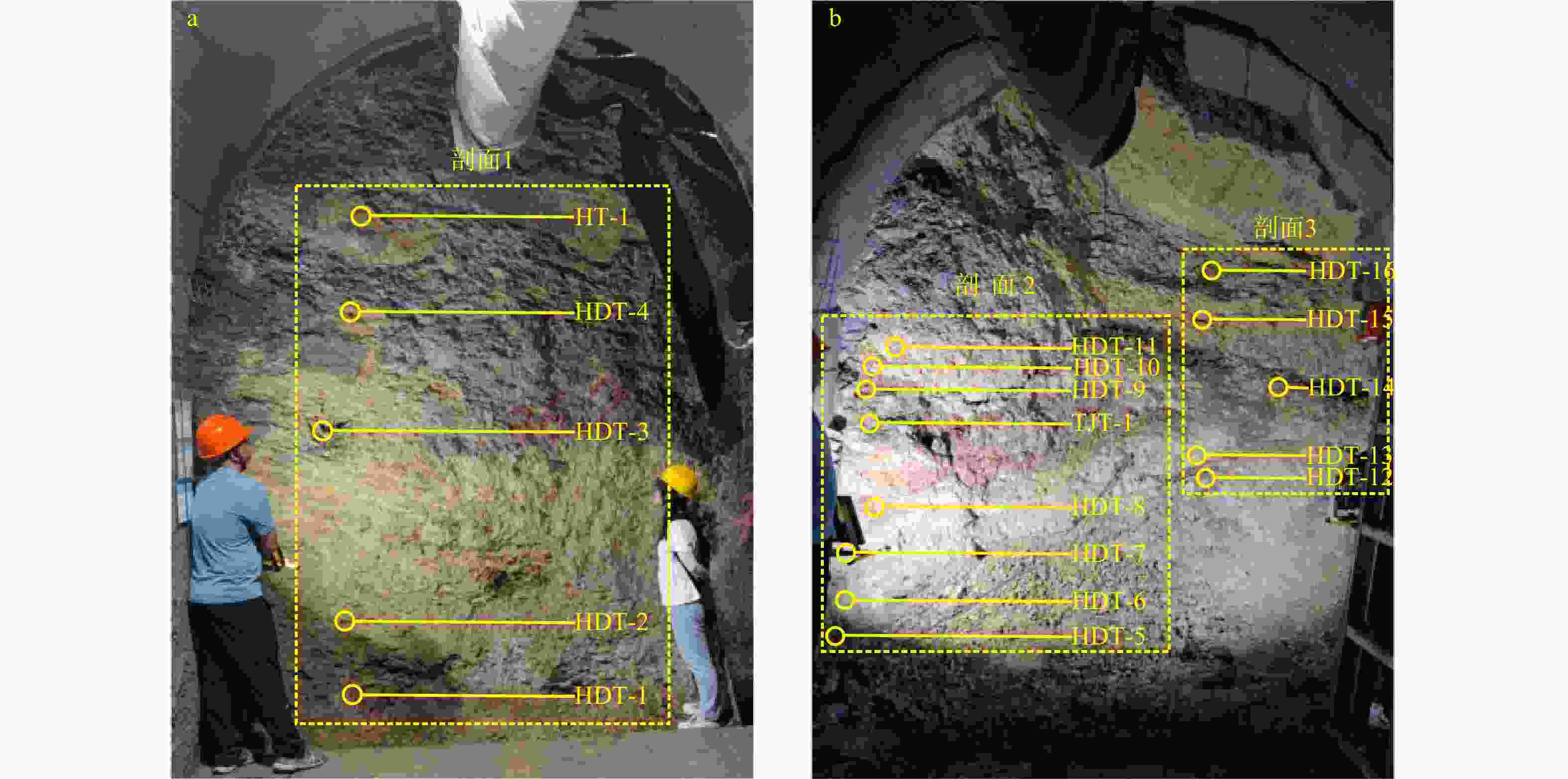a. 5号支洞直洞;b. 5号支洞右洞。HDT-1~16. 滑带土样品编号;TJT-1. 原岩(泥灰岩)样品编号;HT-1. 滑体样品编号;剖面1~3位置见图1;下同