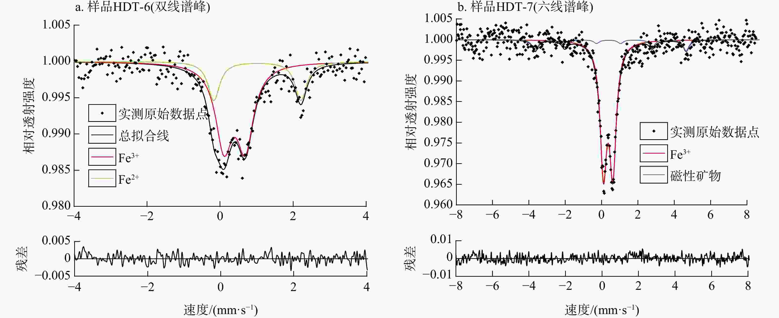 wB/% 样品编号 样品类型 SiO2 TiO2 Al2O3 TFe2O3 Fe2O3 FeO MnO MgO CaO Na2O K2O P2O5 损失量 总量 HDT-1 滑带土 44.06 0.59 13.38 6.79 4.85 1.75 0.03 2.50 14.11 0.09 3.11 0.13 14.75 99.51 HDT-2 滑带土 35.29 1.05 22.05 4.29 3.07 1.10 0.02 2.51 13.12 0.15 6.38 0.12 14.62 99.61 HDT-3 滑带土 32.21 1.00 18.80 4.61 3.00 1.45 0.03 2.87 17.23 0.12 4.96 0.12 17.58 99.55 HDT-4 滑带土 36.42 0.62 17.57 5.95 4.96 0.89 0.09 2.38 15.78 0.13 3.63 0.09 17.02 99.67 HT-1 滑体 28.11 0.51 14.07 4.78 3.84 0.84 0.06 2.11 23.96 0.11 3.28 0.09 22.57 99.65 HDT-5 滑带土 49.10 0.59 14.66 4.91 3.67 1.12 0.04 2.12 11.60 0.10 3.46 0.12 12.54 99.25 HDT-6 滑带土 36.48 0.43 11.56 3.98 2.97 0.91 0.03 1.85 22.16 0.10 2.64 0.08 20.22 99.56 HDT-7 滑带土 32.60 0.38 10.27 3.65 2.74 0.82 0.04 1.58 25.64 0.09 2.46 0.08 22.71 99.49 HDT-8 滑带土 45.43 0.60 22.70 9.01 8.16 0.77 0.06 2.08 5.29 0.19 3.49 0.08 10.41 99.34 TJT-1 残留原岩 1.82 0.02 0.58 0.43 0.43 0 0.01 0.35 53.72 0.05 0.12 0.01 42.81 99.91 HDT-9 滑带土 36.50 0.54 18.39 7.41 6.40 0.91 0.05 1.77 14.70 0.13 2.88 0.06 16.79 99.21 HDT-10 滑带土 39.77 0.57 14.36 5.34 3.77 1.41 0.02 2.22 16.97 0.09 3.47 0.13 16.51 99.46 HDT-11 滑带土 25.72 0.37 9.79 3.37 2.50 0.78 0.04 1.73 30.17 0.07 2.45 0.08 26.04 99.83 HDT-12 滑带土 50.76 0.61 14.95 5.01 3.80 1.13 0.04 2.08 10.86 0.09 3.44 0.12 11.85 99.81 HDT-13 滑带土 35.88 0.43 11.51 3.93 2.65 1.15 0.03 1.81 22.84 0.12 2.61 0.08 20.69 99.96 HDT-14 滑带土 36.41 0.42 11.42 3.85 2.74 1.00 0.03 1.78 22.59 0.10 2.62 0.08 20.72 100.03 HDT-15 滑带土 34.50 0.49 10.39 4.07 3.48 0.53 0.04 1.51 24.34 0.12 2.38 0.09 21.72 99.67 HDT-16 滑带土 51.52 0.63 13.11 4.72 3.82 0.81 0.04 2.25 11.63 0.27 2.75 0.12 12.34 99.39 表 3 黄土坡滑坡剖面样品穆斯堡尔谱测试分析结果(铁的各化学种以及全铁含量)