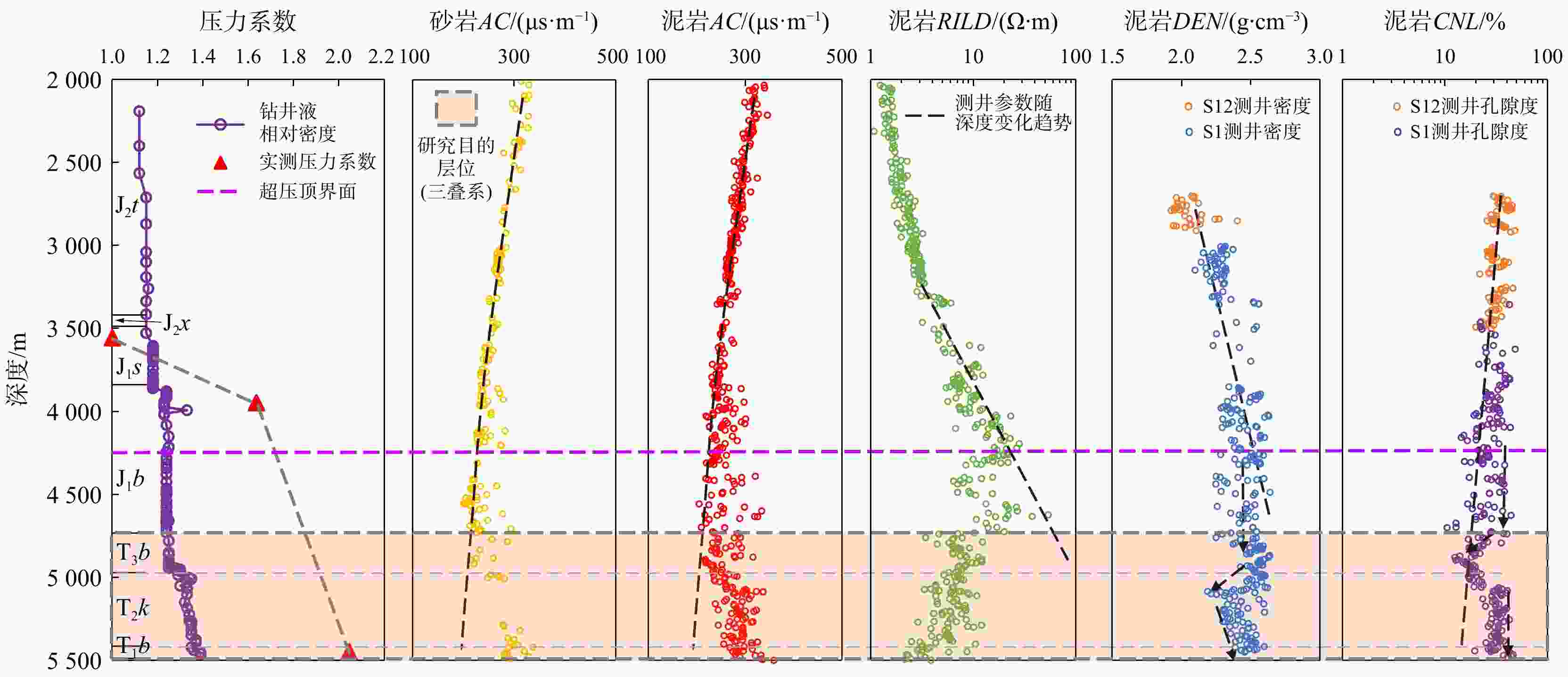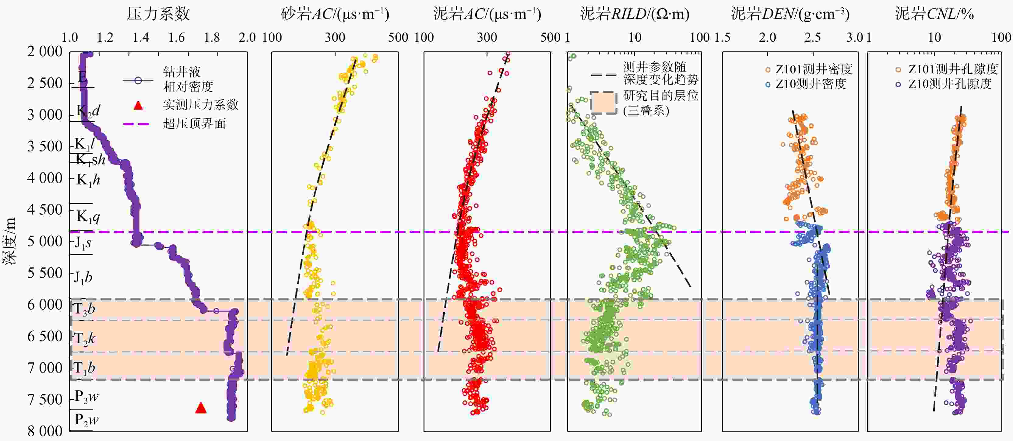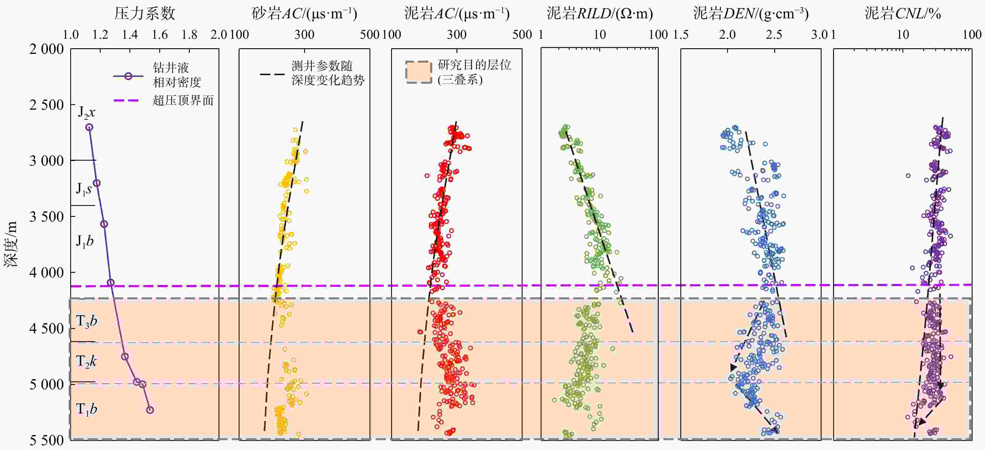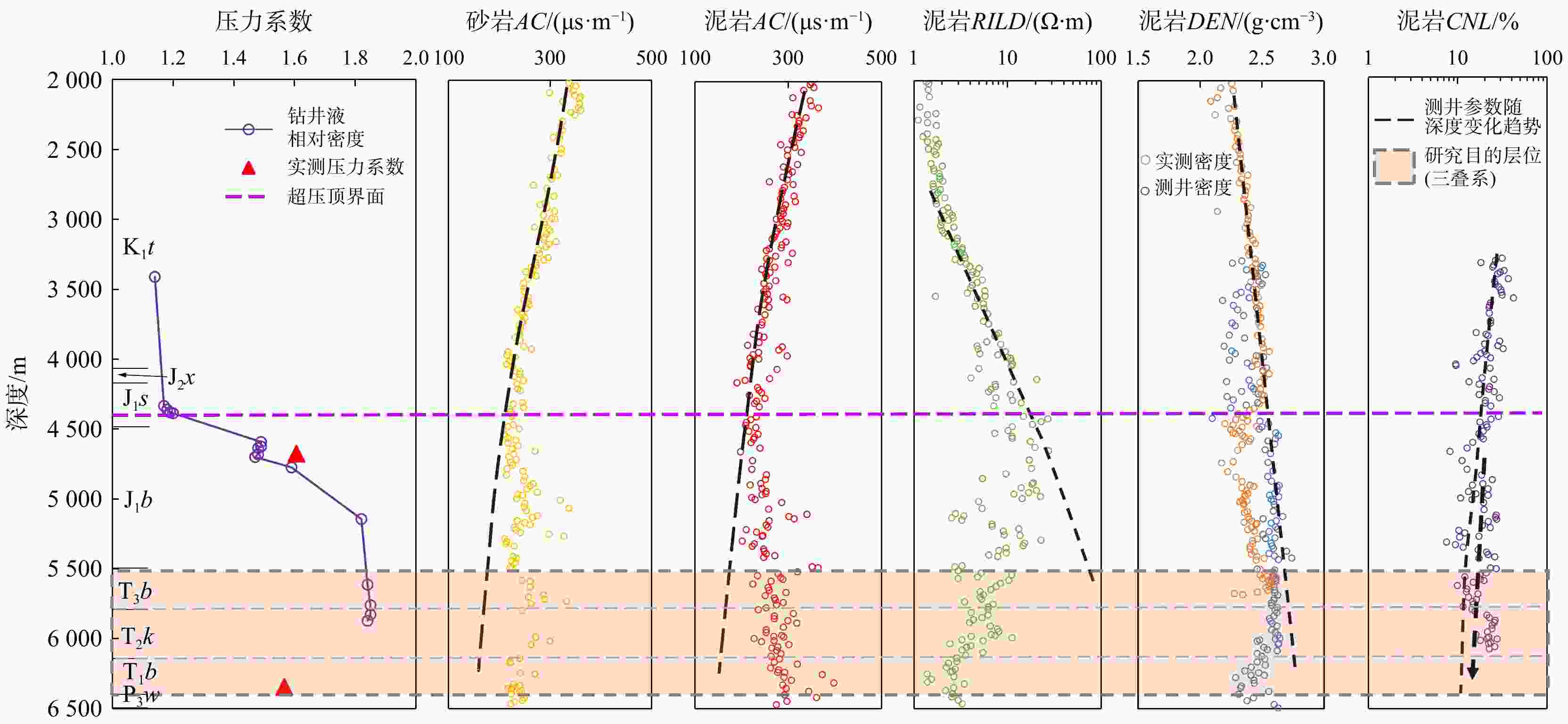 Results The mudstones of the Triassic overpressure section exhibit characteristics of elevated sonic time difference and reduced resistivity. The neutron density and neutron porosity of the mudstone deviate from the normal compaction trend line, but the degree of deviation spatially varies across different well areas.