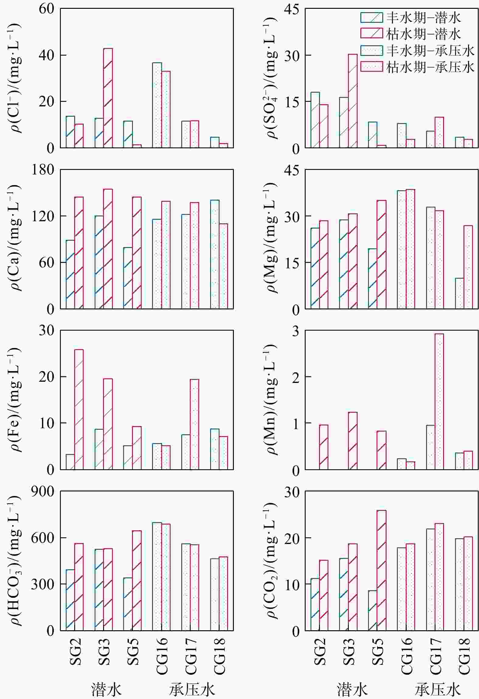 ρB/(mg·L−1) 采样期 承压水 潜水 CG16 CG17 CG18 SG2 SG3 SG5 枯水期 2.22 3.04 0.98 5.18 5.92 3.29 丰水期 2.35 2.80 1.13 3.76 3.13 1.76 -