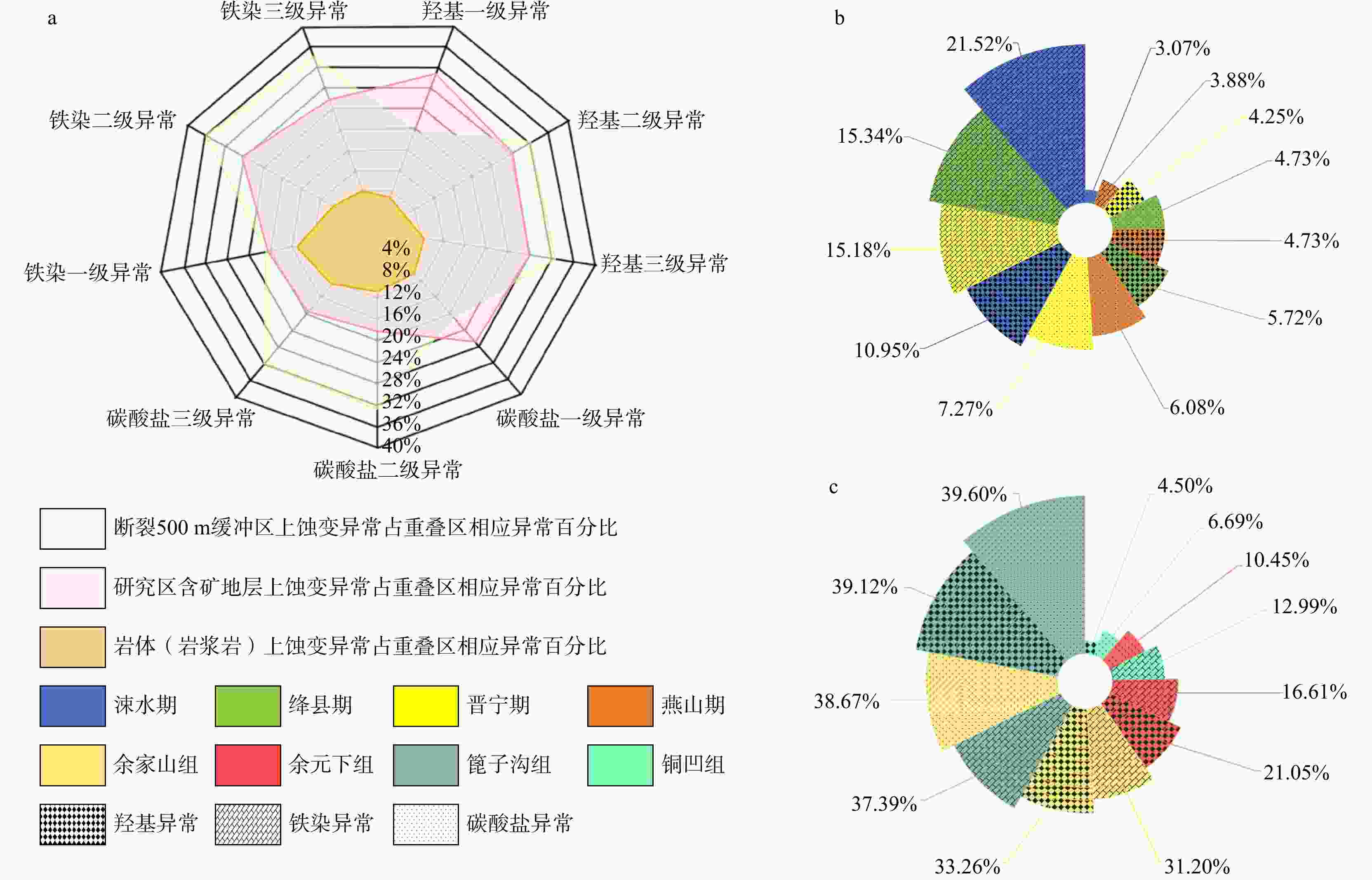 a. 蚀变异常面积与重叠区相应异常面积百分比雷达概率图;b. 蚀变异常面积与不同构造运动期岩体面积百分比玫瑰概率图;c. 蚀变异常面积与不同含矿地层面积百分比玫瑰概率图