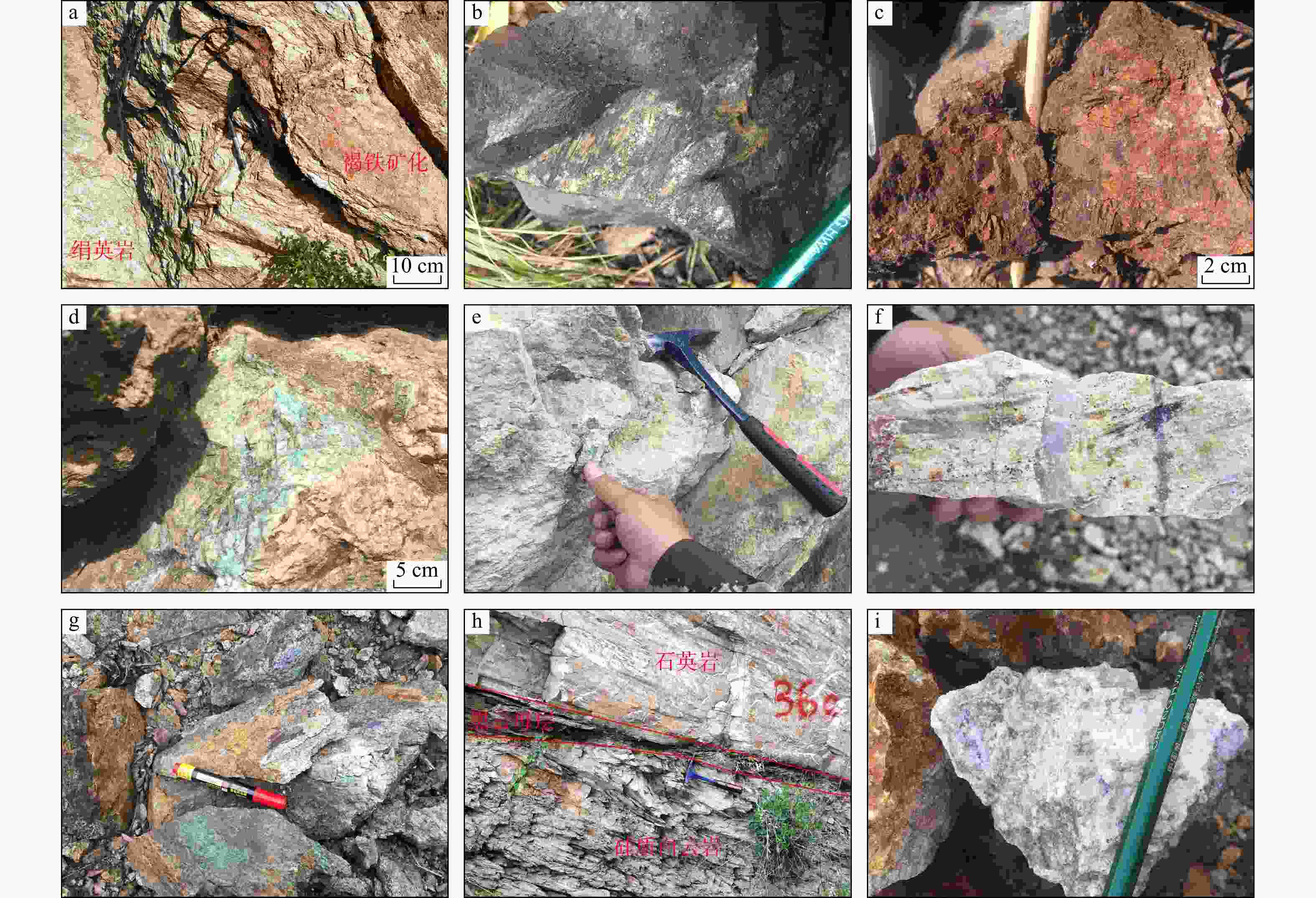 a. 褐铁矿化与绢英岩化;b. 黄铁矿化;c. 褐铁矿化与孔雀石化;d. 绿泥石化;e. 绿帘石化与碳酸盐化;f. 绿帘石化与硅化;g. 孔雀石化;h. 石英岩化与白云岩化;i. 碳酸盐化
