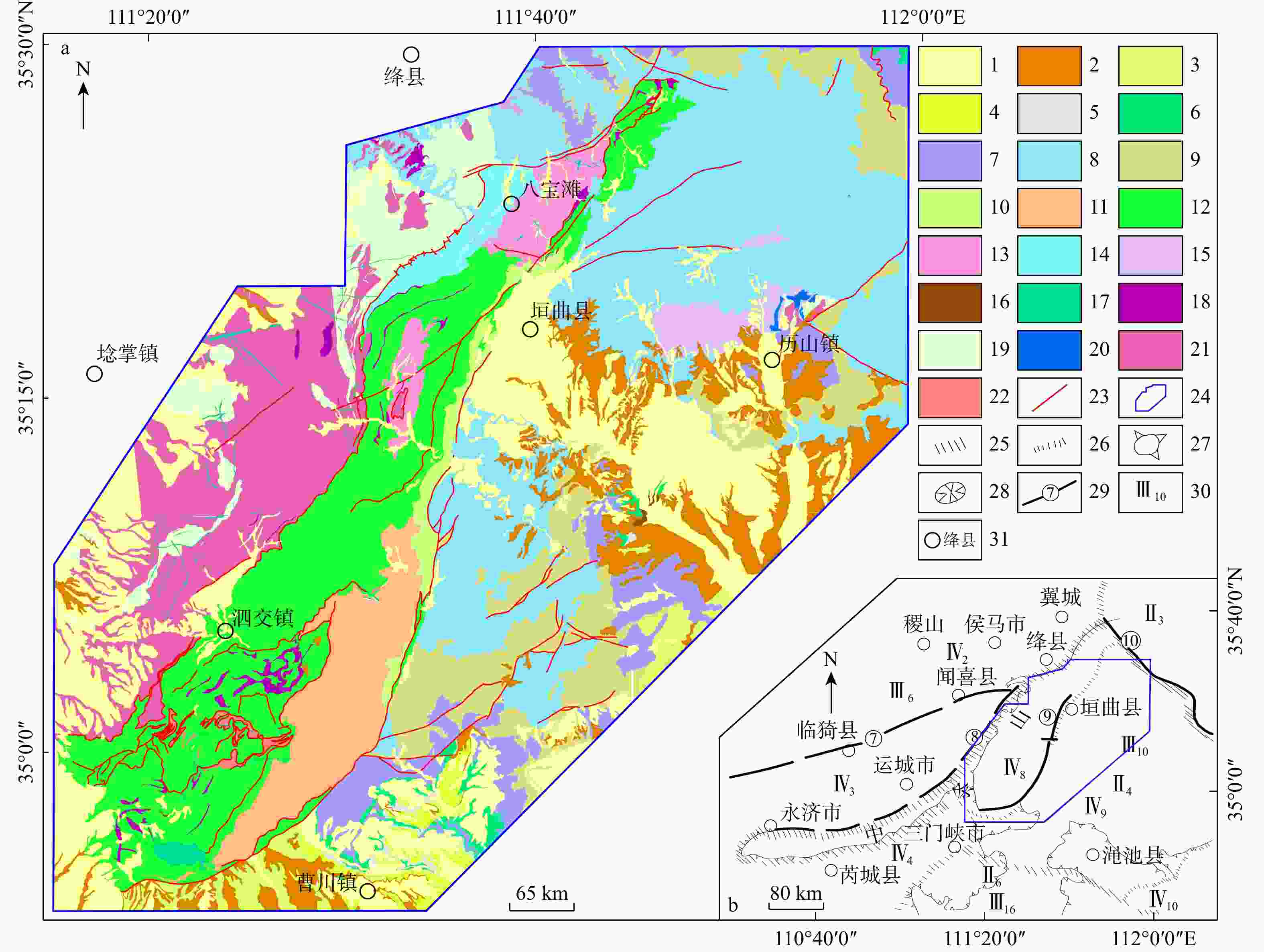 1. 第四系;2. 新近系;3. 古近系;4. 二叠系;5. 石炭系;6. 奥陶系;7. 寒武系;8. 长城系雄耳群;9. 长城系汝阳群;10. 长城系担山石群;11. 上中条亚群;12. 下中条亚群;13. 绛县群铜矿峪亚群;14. 绛县群横岭关亚群;15. 宋家山群;16. 燕山期;17. 晋宁期;18. 中条期;19. 绛县期;20. 宋家山期;21. 涑水期;22. 角砾岩;23. 断裂;24. 研究区范围;25. 三级构造单元;26. 四级构造单元;27. 隆起;28. 坳陷;29. 已知或推断的大断裂及编号;30. 构造单元分级编号;31. 地名;⑦. 涑渭大断裂;⑧. 中条北麓大断裂;⑨. 中条南东侧大断裂;⑩. 太行南麓大断裂;Ⅲ6. 汾渭断陷;Ⅳ2. 稷山台拱;Ⅳ3. 涑渭断凹;Ⅳ4. 黄河断凹;Ⅱ3. 山西中台隆;Ⅱ4. 嵩条断褶区;Ⅲ10. 中黄陷断褶束;Ⅳ8. 中条台穹;Ⅳ9. 黄金山凹断褶束;Ⅳ10. 洛阳台凹;Ⅱ6. 秦岭轴缘坳陷;Ⅲ16. 华露台拱