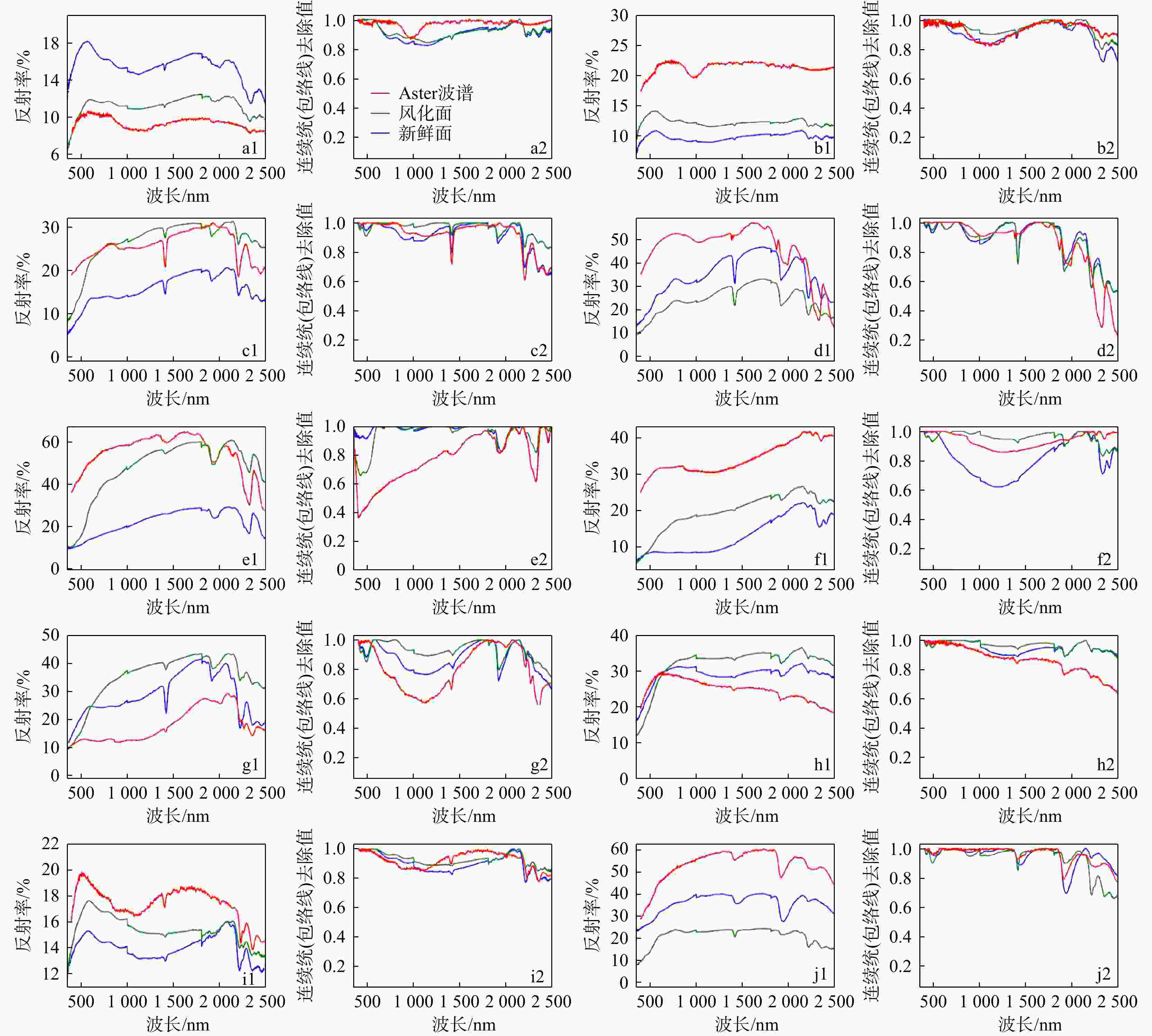 图 3  典型岩石波谱图(a1~j1)及连续统(包络线)去除图(a2~j2)