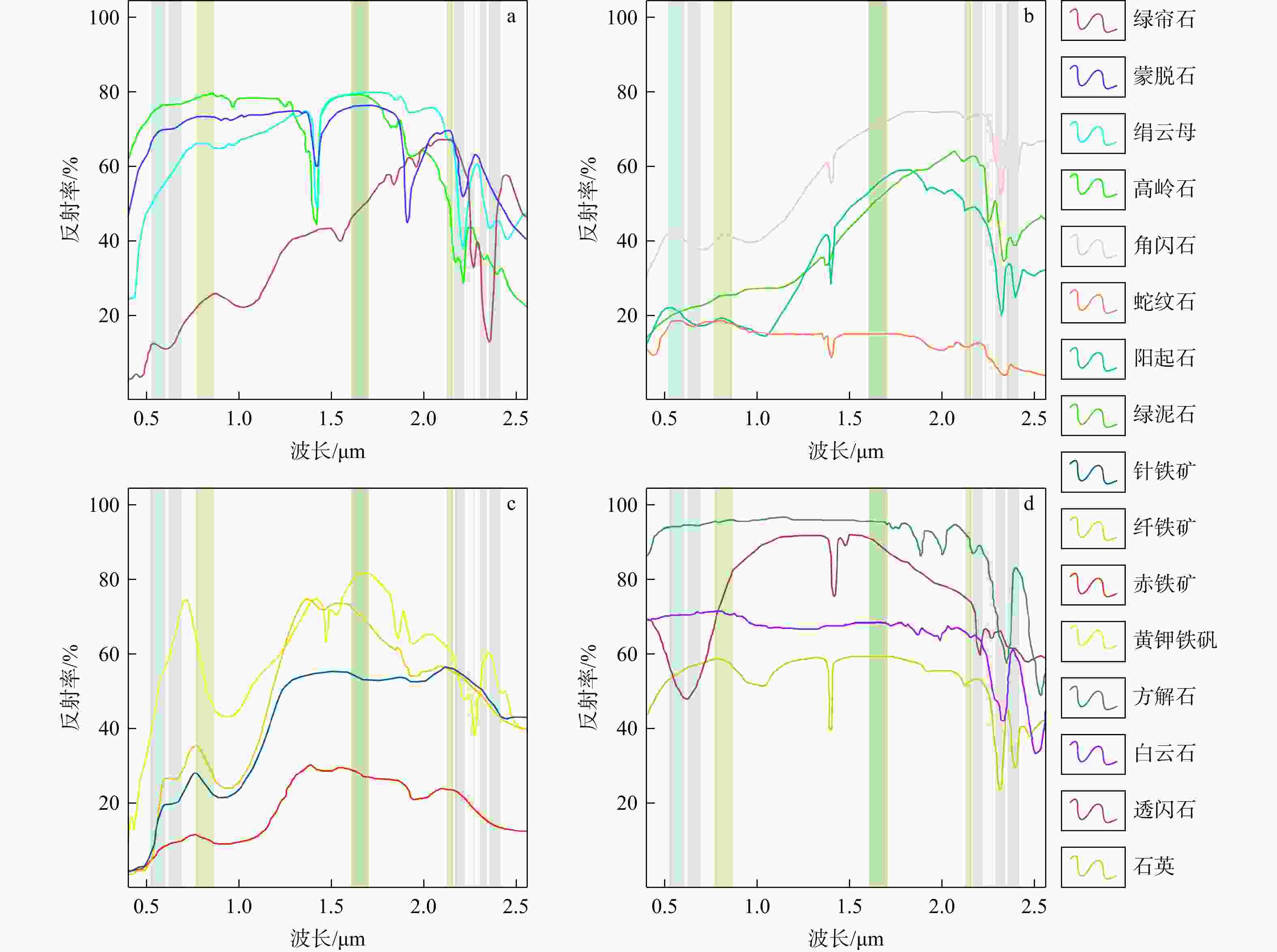 a. Al-OH;b. Mg-OH;c. Fe离子;d. CO32−。彩色柱状为Aster数据的各波段宽度