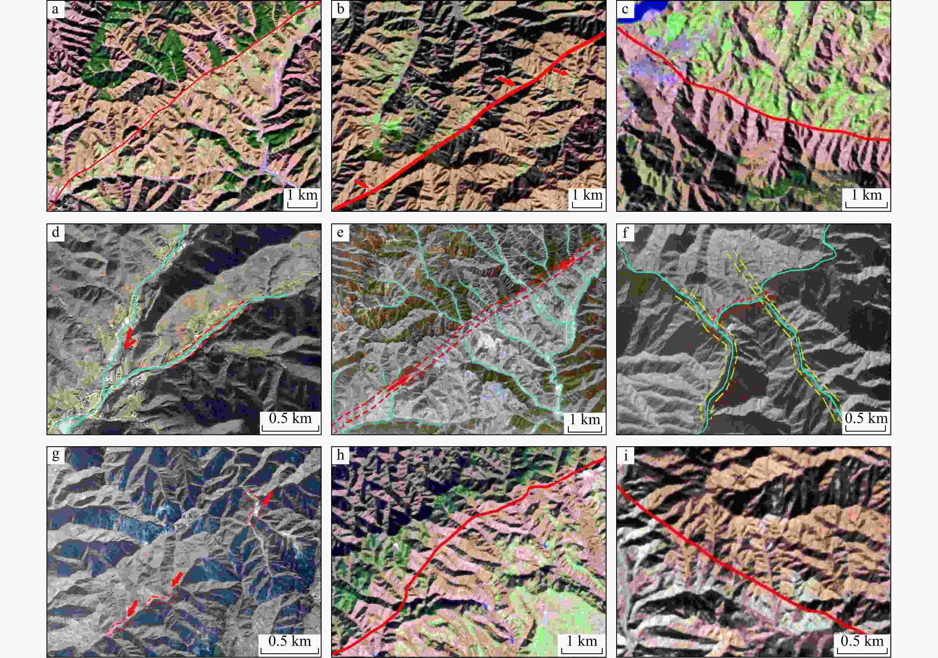 a. 不同地貌单元;b. 断层三角面;c. 色调差异明显;d. 河流汇聚和局部直线;e. 同步错动水系;f. 直角河和同向转弯河系;g. 山脊(规律)错动;h. 正负地形突变;i. 断裂切割地层。淡绿色线为山脊走向或者河流走向;其余线型均为辅助线,起区分和指示作用,无实际含义;下同