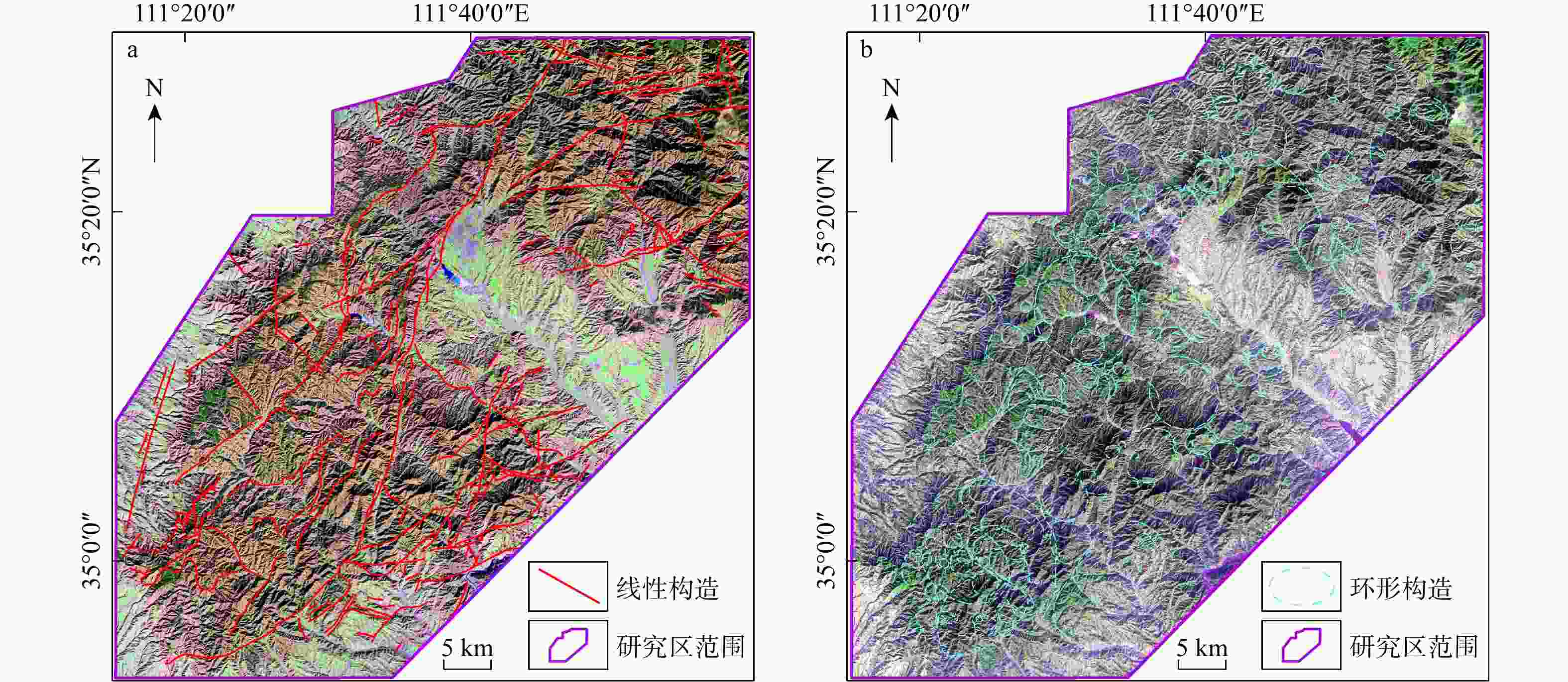 图 6  研究区主要断裂构造解译图(a)和环形构造解译图(b)
