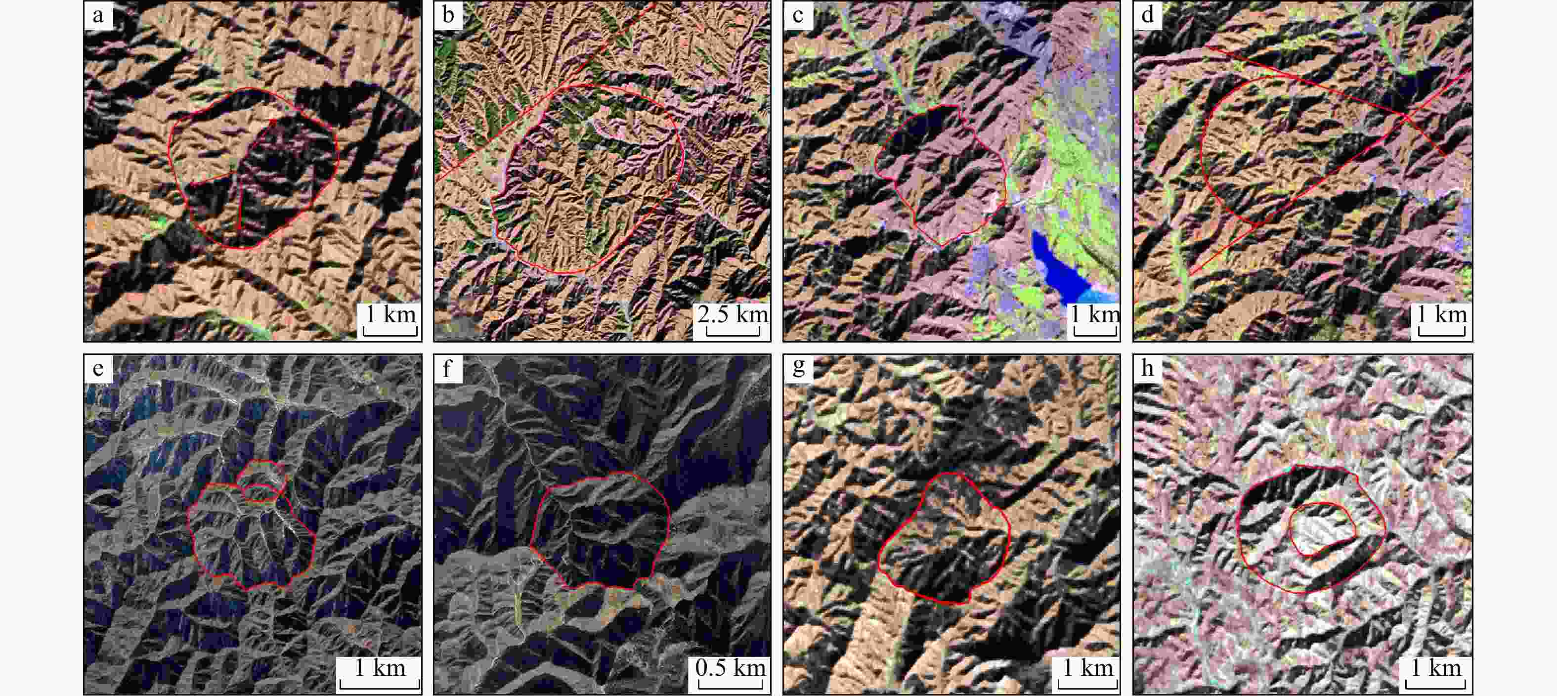 a. 放射状环要素;b. 线环相切型构造;c. 地貌突变型环要素;d. 线环相交型构造;e. 双环相交型构造;f. 火山口型环要素;g. 火山锥型环要素;h. 色调差异明显的双环套合环要素