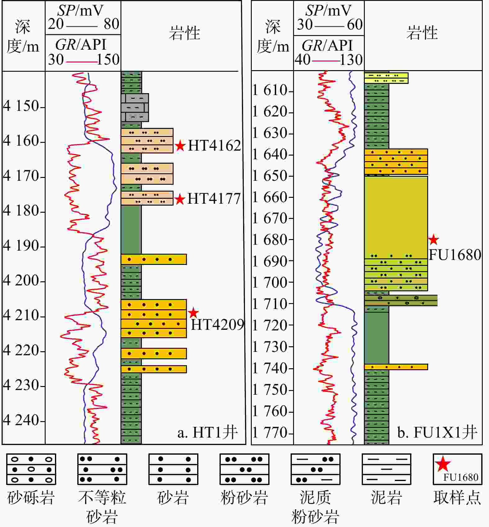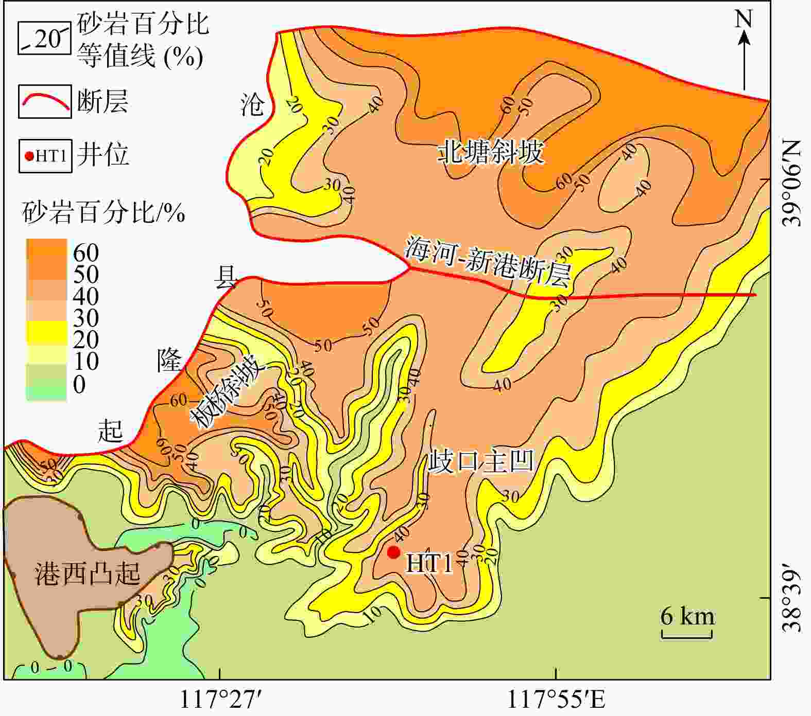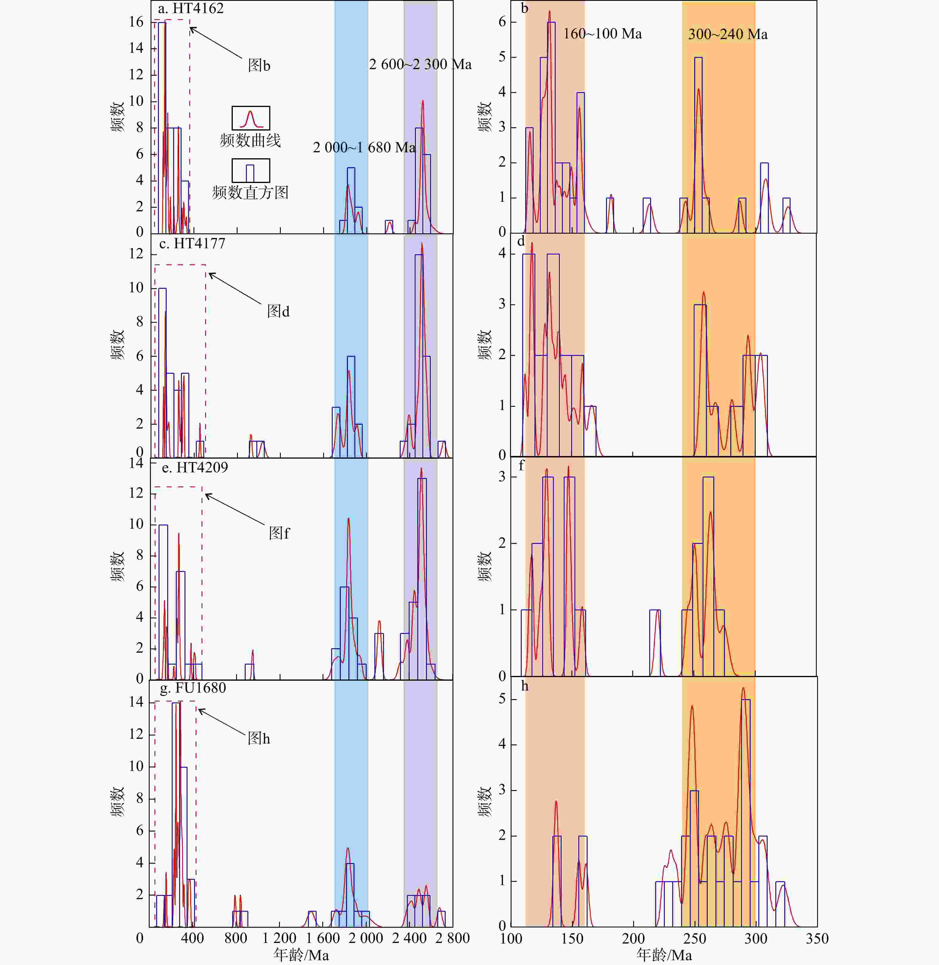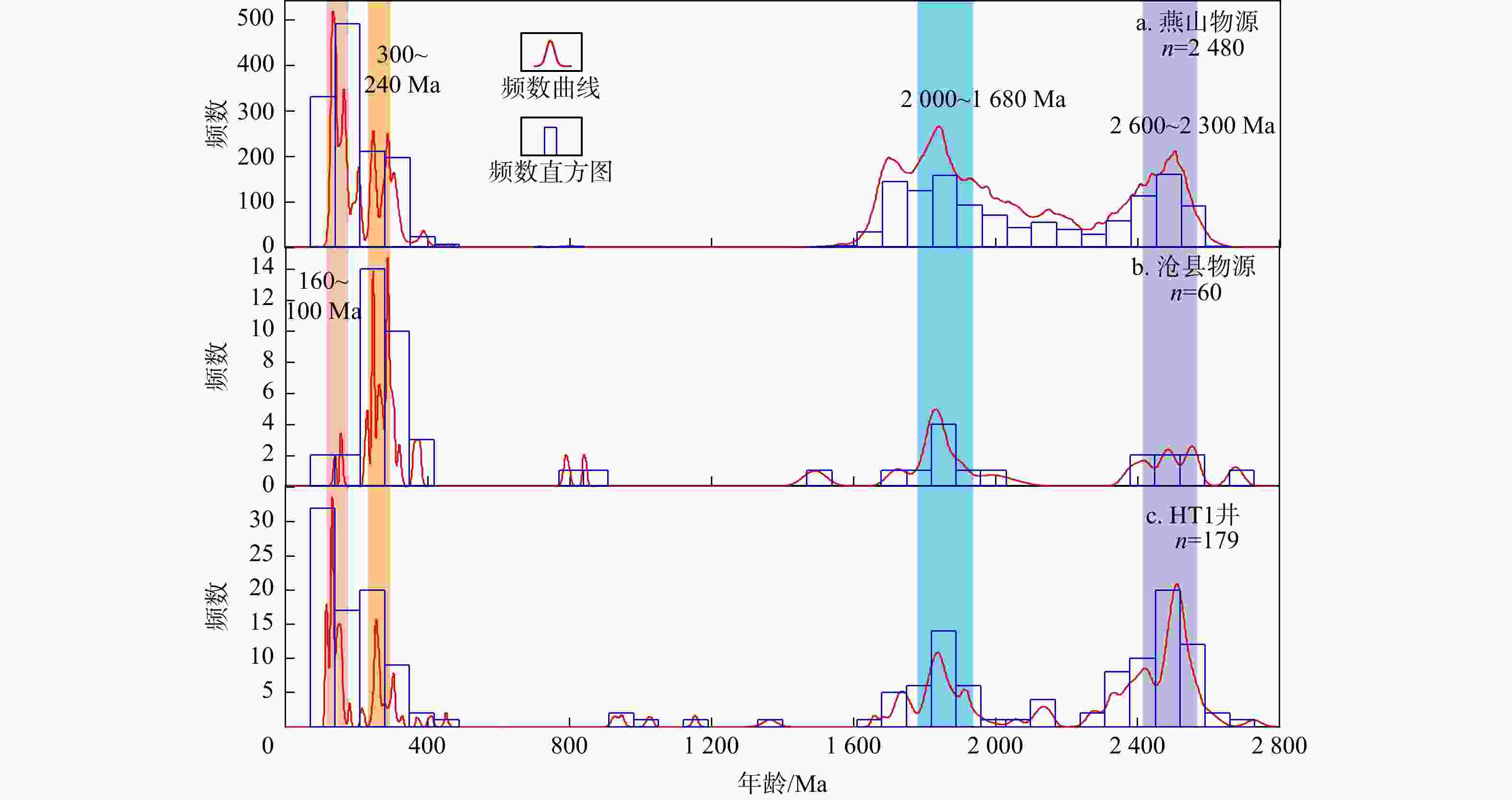 2000 ~1680 ,2600 ~2300 Ma 4个年龄区间内,其中160~100 Ma区间年龄峰值明显。盆外物源区沧县隆起FU1X1井东三段砂岩碎屑锆石年龄在二叠纪(300~240 Ma)具有明显峰值。北部燕山造山带发育有从太古宙到中生代的岩浆岩,中生代岩浆作用强烈,160~100 Ma区间的年龄峰值特征明显。HT1井东三段砂岩碎屑锆石年龄特征与燕山造山带年龄峰值特征具有较高一致性,表明北部燕山造山带为其物源区。结合前人轻重矿物研究成果和东三段沉积时期歧口主凹区北高南低的古地貌特征,构建了歧口主凹区东三段砂岩“远源供砂、沟槽输砂、深凹聚砂”的沉积模式。研究成果为后续主凹区井位部署提供了依据。Abstract:Objective The Qikou Sag, a significant hydrocarbon-bearing sub-basin within the Bohai Bay Basin of eastern China, has recently witnessed a critical exploration breakthrough. Well HT1, drilled in the main trough, encountered a sandstone reservoir within the Third Member of the Dongying Formation (E