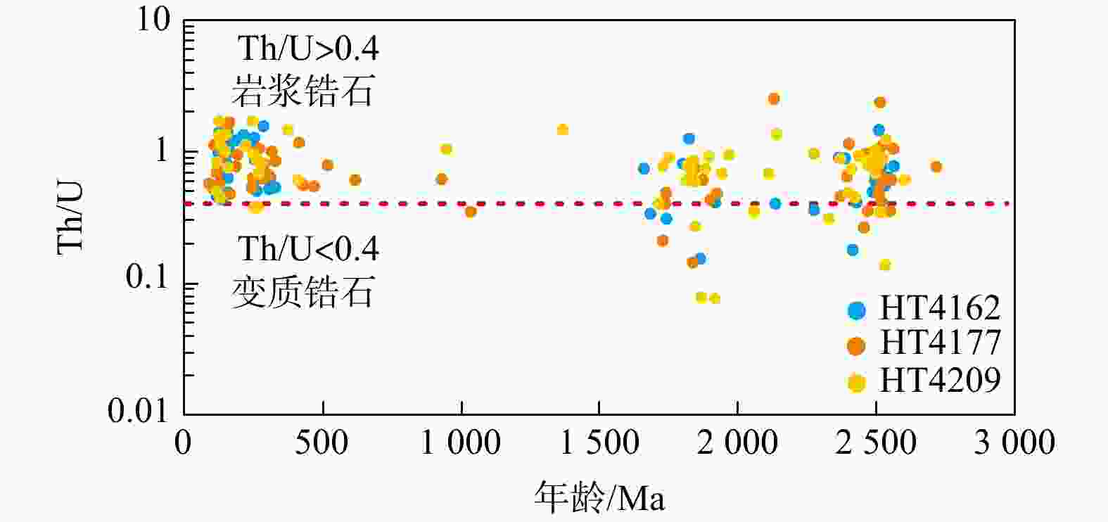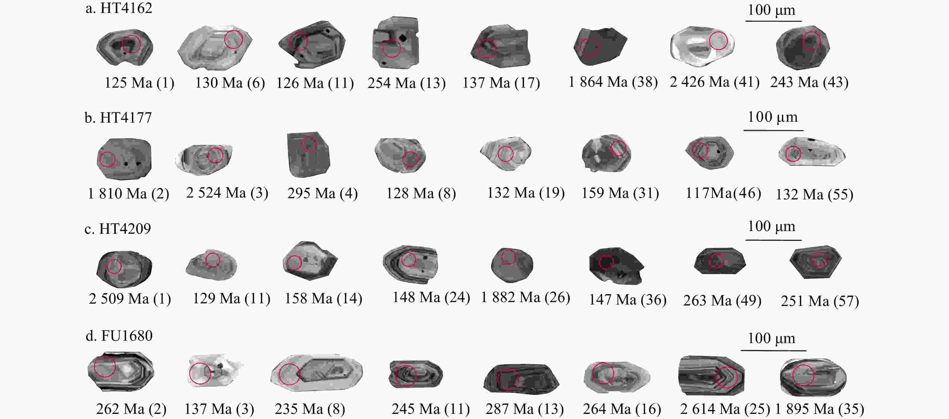 点编号Th U Th/U 同位素比值 年龄t/Ma 谐和度/% wB/10−6 207Pb/206Pb 1σ 207Pb/235U 1σ 206Pb/238U 1σ 207Pb/206Pb 1σ 207Pb/235U 1σ 206Pb/238U 1σ HT4162 1 664 578 1.15 0.0482 0.0007 0.1300 0.0021 0.0195 0.0002 108 34 124 2 125 1 99 2 312 223 1.40 0.0492 0.0011 0.1653 0.0039 0.0243 0.0002 158 54 155 3 155 2 100 3 816 528 1.55 0.0520 0.0006 0.3263 0.0042 0.0455 0.0004 286 28 287 3 287 2 100 4 721 544 1.33 0.0508 0.0010 0.2348 0.0041 0.0336 0.0004 233 45 214 3 213 3 100 5 46.1 60.9 0.76 0.1654 0.0017 10.9159 0.1018 0.4784 0.0035 2512 17 2516 9 2520 15 100 6 186 161 1.16 0.0488 0.0015 0.1370 0.0044 0.0204 0.0003 137 73 130 4 130 2 100 7 226 318 0.71 0.0517 0.0013 0.1557 0.0037 0.0219 0.0002 274 59 147 3 140 1 95 8 414 850 0.49 0.0493 0.0006 0.1668 0.0023 0.0245 0.0002 161 29 157 2 156 1 100 9 40.1 99.6 0.40 0.1387 0.0013 7.5183 0.0796 0.3925 0.0028 2211 17 2175 10 2135 13 98 10 77.0 187 0.41 0.1171 0.0015 5.6146 0.0758 0.3463 0.0026 1913 24 1918 12 1917 13 100 11 504 358 1.41 0.0488 0.0013 0.1332 0.0039 0.0198 0.0002 138 64 127 4 126 2 100 12 108 111 0.97 0.0490 0.0029 0.1317 0.0076 0.0197 0.0004 147 141 126 7 125 2 100 13 174 199 0.87 0.0510 0.0012 0.2838 0.0073 0.0403 0.0004 242 55 254 6 255 3 100 14 163 179 0.91 0.0491 0.0015 0.1521 0.0046 0.0225 0.0003 153 71 144 4 143 2 100 15 304 244 1.25 0.1178 0.0010 5.3014 0.0536 0.3269 0.0033 1923 16 1869 9 1824 16 98 16 480 433 1.11 0.0589 0.0019 0.1470 0.0037 0.0184 0.0003 561 69 139 3 117 2 84 17 291 246 1.18 0.0492 0.0015 0.1460 0.0047 0.0215 0.0002 158 70 138 4 137 1 99 18 230 344 0.67 0.0491 0.0011 0.1394 0.0031 0.0206 0.0002 152 53 133 3 132 1 99 19 44.3 30.3 1.46 0.1664 0.0015 10.9227 0.1250 0.4760 0.0043 2522 15 2517 11 2510 19 100 20 61.8 79.7 0.78 0.1703 0.0018 11.4655 0.1166 0.4885 0.0034 2561 17 2562 10 2564 15 100 21 324 316 1.03 0.0486 0.0013 0.1355 0.0041 0.0202 0.0002 127 62 129 4 129 2 100 22 84.4 142 0.59 0.1652 0.0018 10.7842 0.1139 0.4727 0.0045 2510 19 2505 10 2496 20 100 23 276 271 1.02 0.0485 0.0013 0.1380 0.0036 0.0207 0.0002 123 62 131 3 132 1 100 24 85.5 275 0.31 0.1115 0.0009 4.7631 0.0361 0.3100 0.0022 1824 14 1778 6 1741 11 98 25 305 243 1.26 0.0514 0.0011 0.2834 0.0069 0.0400 0.0004 260 50 253 5 253 2 100 26 184 375 0.49 0.1666 0.0008 10.8323 0.0744 0.4718 0.0034 2524 8 2509 6 2492 15 99 27 1.09 4.14 0.26 0.1731 0.0043 10.9248 0.2412 0.4639 0.0078 2588 42 2517 21 2457 34 98 28 87.2 164 0.53 0.0525 0.0010 0.3539 0.0079 0.0489 0.0005 306 45 308 6 308 3 100 29 60 74.7 0.80 0.1664 0.0018 10.9573 0.1128 0.4780 0.0032 2521 18 2520 10 2519 14 100 30 102 127 0.80 0.1108 0.0008 4.9213 0.0470 0.3219 0.0026 1813 12 1806 8 1799 13 100 31 493 519 0.95 0.0493 0.0009 0.1593 0.0027 0.0235 0.0002 162 42 150 2 150 1 100 32 93.9 206 0.46 0.0483 0.0016 0.1198 0.0040 0.0181 0.0002 112 79 115 4 115 1 100 33 187 230 0.81 0.0498 0.0014 0.1579 0.0039 0.0231 0.0003 187 66 149 4 148 2 99 34 29.2 32.5 0.90 0.1591 0.0016 9.7166 0.1111 0.4431 0.0036 2446 17 2408 11 2364 16 98 35 71.3 61.8 1.15 0.0497 0.0024 0.1347 0.0062 0.0199 0.0003 180 111 128 6 127 2 99 36 39 61 0.64 0.1652 0.0021 11.0167 0.1527 0.4840 0.0048 2510 22 2525 13 2545 21 99 37 88.1 118 0.75 0.1115 0.0010 4.5109 0.0397 0.2935 0.0015 1825 16 1733 7 1659 8 96 38 34.4 222 0.15 0.1131 0.0013 5.2332 0.0762 0.3353 0.0034 1849 21 1858 12 1864 16 100 39 84 100 0.84 0.0492 0.0024 0.1383 0.0066 0.0205 0.0003 157 112 132 6 131 2 100 40 113 223 0.51 0.0519 0.0013 0.2935 0.0071 0.0412 0.0004 280 59 261 6 260 2 100 41 52.1 128 0.41 0.1661 0.0019 10.4526 0.1464 0.4570 0.0046 2519 19 2476 13 2426 20 98 42 90.2 109 0.83 0.1137 0.0010 5.1511 0.0561 0.3288 0.0028 1859 15 1845 9 1833 14 99 43 594 549 1.08 0.0513 0.0008 0.2713 0.0047 0.0383 0.0004 256 35 244 4 243 2 99 44 90.3 86.4 1.05 0.0484 0.0025 0.1365 0.0072 0.0205 0.0003 119 120 130 6 131 2 99 45 50.8 117 0.43 0.0489 0.0019 0.1392 0.0055 0.0207 0.0003 145 93 132 5 132 2 100 46 102 201 0.51 0.0488 0.0019 0.1205 0.0049 0.0180 0.0002 140 93 116 4 115 2 99 47 80.4 129 0.62 0.0526 0.0013 0.3550 0.0094 0.0490 0.0005 310 55 308 7 308 3 100 48 29.8 28.2 1.06 0.0863 0.0064 0.2906 0.0197 0.0249 0.0007 1345 144 259 16 158 5 61 49 88.9 101 0.88 0.1658 0.0015 10.2421 0.0923 0.4482 0.0035 2515 15 2457 8 2387 15 97 50 260 84.9 3.06 0.1654 0.0011 10.8862 0.0941 0.4767 0.0032 2512 11 2514 8 2513 14 100 51 247 282 0.88 0.0512 0.0011 0.2832 0.0061 0.0402 0.0003 251 48 253 5 254 2 100 52 30.8 172 0.18 0.1649 0.0015 10.3224 0.1364 0.4546 0.0065 2507 16 2464 12 2416 29 98 53 75.9 210 0.36 0.1649 0.0017 9.5995 0.1226 0.4229 0.0039 2507 18 2397 12 2274 18 95 54 114 210 0.54 0.1665 0.0018 11.0031 0.1495 0.4801 0.0045 2523 18 2523 13 2528 20 100 55 97.3 155 0.63 0.0501 0.0019 0.1684 0.0065 0.0246 0.0003 199 89 158 6 156 2 99 56 78.9 233 0.34 0.1119 0.0013 4.5996 0.0614 0.2987 0.0022 1831 22 1749 11 1685 11 96 57 59.6 111 0.54 0.0525 0.0014 0.3745 0.0099 0.0519 0.0005 307 58 323 7 326 3 99 58 517 428 1.21 0.0497 0.0010 0.1955 0.0042 0.0286 0.0002 179 46 181 4 182 2 100 59 310 303 1.02 0.0515 0.0010 0.2840 0.0061 0.0401 0.0004 261 43 254 5 254 3 100 60 230 392 0.59 0.0514 0.0013 0.2819 0.0077 0.0398 0.0004 257 60 252 6 252 3 100 HT4177 1 113 101 1.12 0.0482 0.0021 0.1341 0.0057 0.0202 0.0003 108 104 128 5 129 2 99 2 84.5 108 0.78 0.1119 0.0011 5.0003 0.0495 0.3241 0.0031 1831 17 1819 8 1810 15 99 3 39.7 66 0.60 0.1695 0.0014 11.2128 0.1116 0.4793 0.0044 2553 14 2541 9 2524 19 99 4 223 278 0.80 0.0521 0.0008 0.3370 0.0061 0.0468 0.0004 289 34 295 5 295 3 100 5 175 277 0.63 0.0521 0.0009 0.3201 0.0060 0.0446 0.0004 291 40 282 5 281 3 100 6 94 123 0.76 0.1870 0.0022 13.5432 0.1569 0.5267 0.0051 2716 19 2718 11 2727 21 100 7 89.8 188 0.48 0.0493 0.0018 0.1491 0.0053 0.0220 0.0002 162 83 141 5 140 2 99 8 151 219 0.69 0.0483 0.0014 0.1331 0.0040 0.0200 0.0002 116 67 127 4 128 1 100 9 21.2 43.1 0.49 0.1065 0.0014 4.6094 0.0760 0.3142 0.0038 1740 24 1751 14 1762 19 99 10 301 520 0.58 0.0485 0.0010 0.1170 0.0024 0.0175 0.0002 125 47 112 2 112 1 100 11 151 229 0.66 0.05