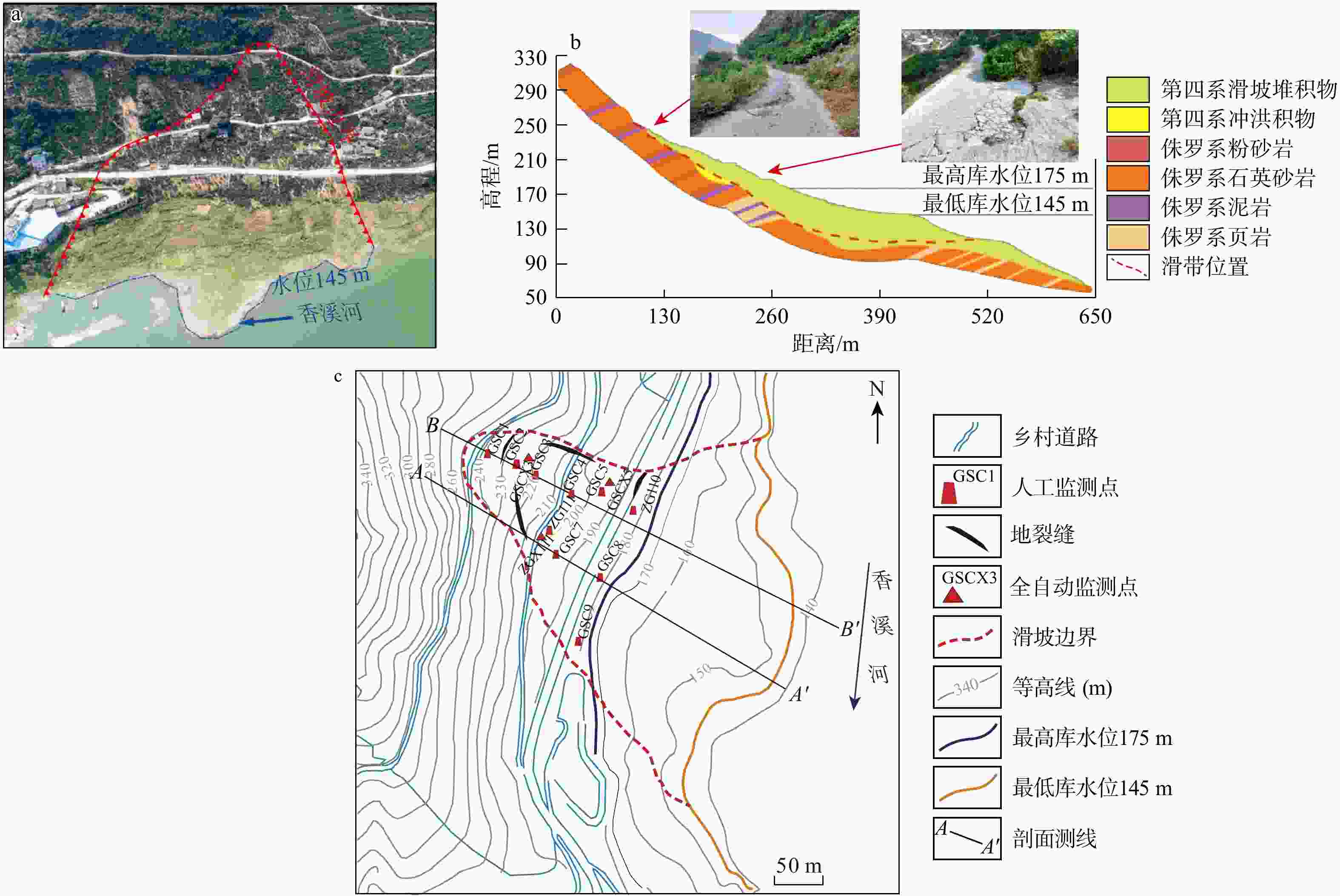 为探究动水压力型滑坡对降雨的响应规律,以三峡库区八字门滑坡为例,结合地质勘察数据、相关性分析及有限元数值模拟,系统研究了降雨对滑坡变形的影响,揭示其对降雨的响应规律及变形机制。研究表明,库水位涨落和降雨是八字门滑坡变形的主要驱动因素。降雨对滑坡变形的影响表现为:在库水位下降阶段,降雨通过补给坡体内部水头,进一步增强动水压力作用,显著加剧坡体变形;而在库水位上升阶段,降雨入渗至次级滑带后缘,导致孔隙水压力升高,从而引发滑坡后缘变形并推动滑坡整体变形,足够的降雨是库水位上升期间滑坡变形的主要触发因素。滑坡变形呈现一定的滞后性,其中库水位下降引发的变形滞后时间约为20 d,降雨引发的变形滞后时间为9 d。长时间持续降雨条件下的滑坡稳定系数(1.029)衰减程度高于暴雨条件下的稳定系数(1.039)。研究成果深化了对动水压力型滑坡变形机制的认识,可为该类滑坡的预警预测提供参考。