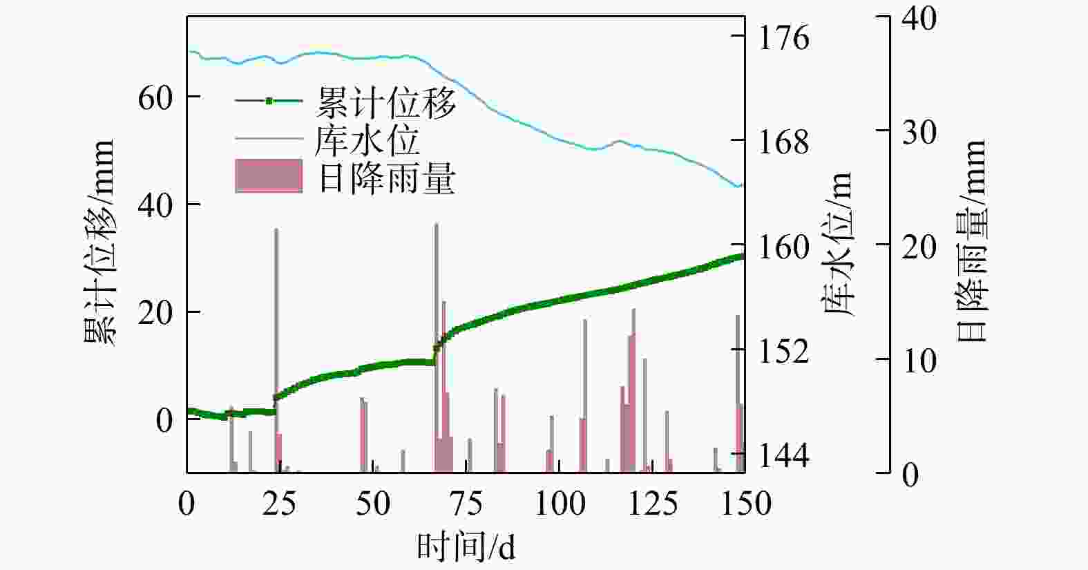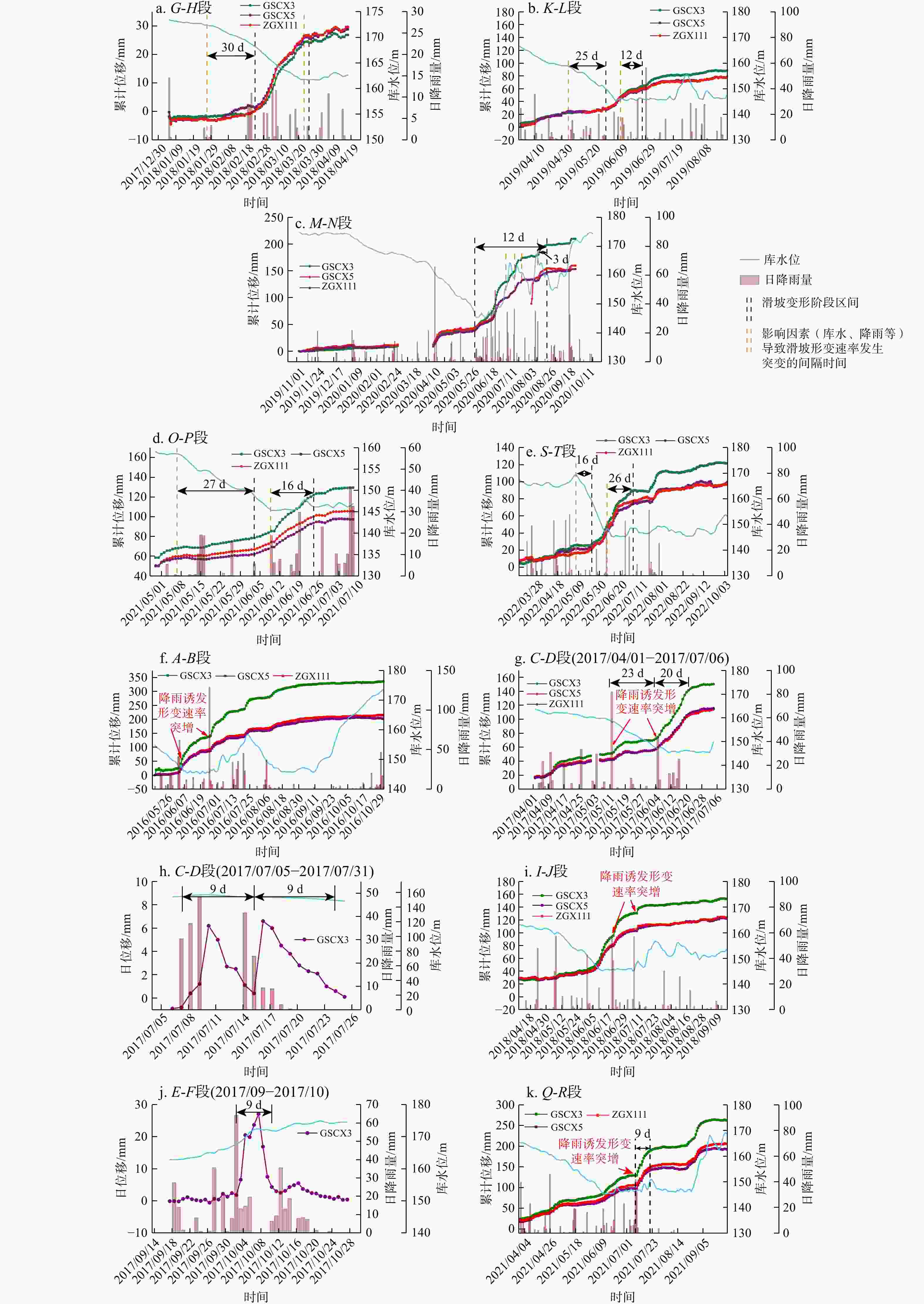 变形时间 库水位 降雨 GSCX3监测点平均形变速率/(mm·d−1) 水位/m 升降速率/(m·d−1) 降雨时间 降雨量/mm 2016/06/25−2016/07/09 146.5~150.53 0.27 2016/06/24−2016/07/01 153.8 5.93 2017/07/07−2017/07/23 154.6~150.42 −0.25 2017/07/07−2017/07/17 198.6 2.8 2017/09/27−2017/10/26 164.26~174.59 0.34 2017/09/27−2017/10/14 260.8 5.85 2018/07/07−2018/07/14 148.26~148.18 −0.01 2018/07/05 57 1.48 2021/07/09−2021/07/17 146.63~146.9 0.003 2021/07/02−2021/07/09 111 5.87 表 2 GSCX3监测点形变速率与有效降雨相关性分析