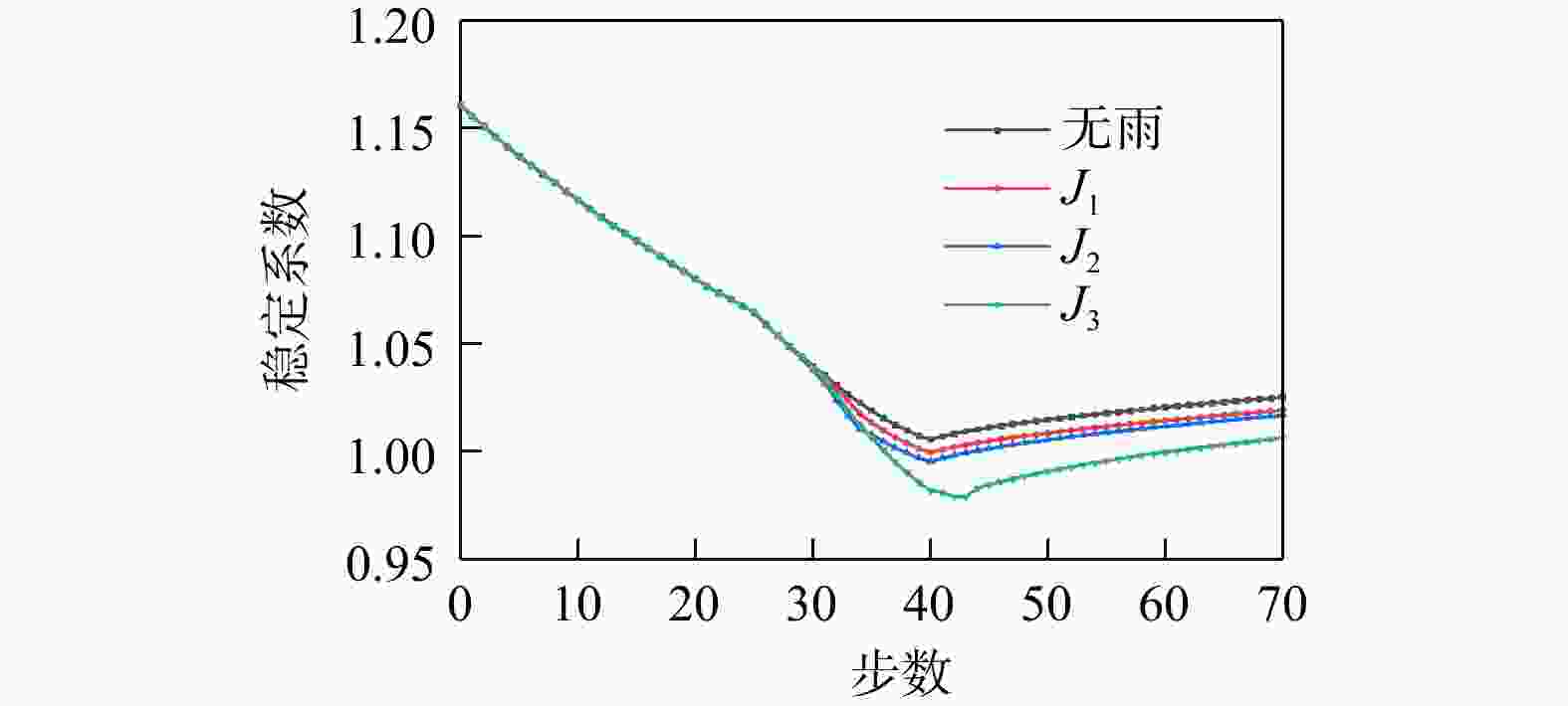 图 9 稳定系数(J1, J2, J3. 降雨工况编号,见表4)