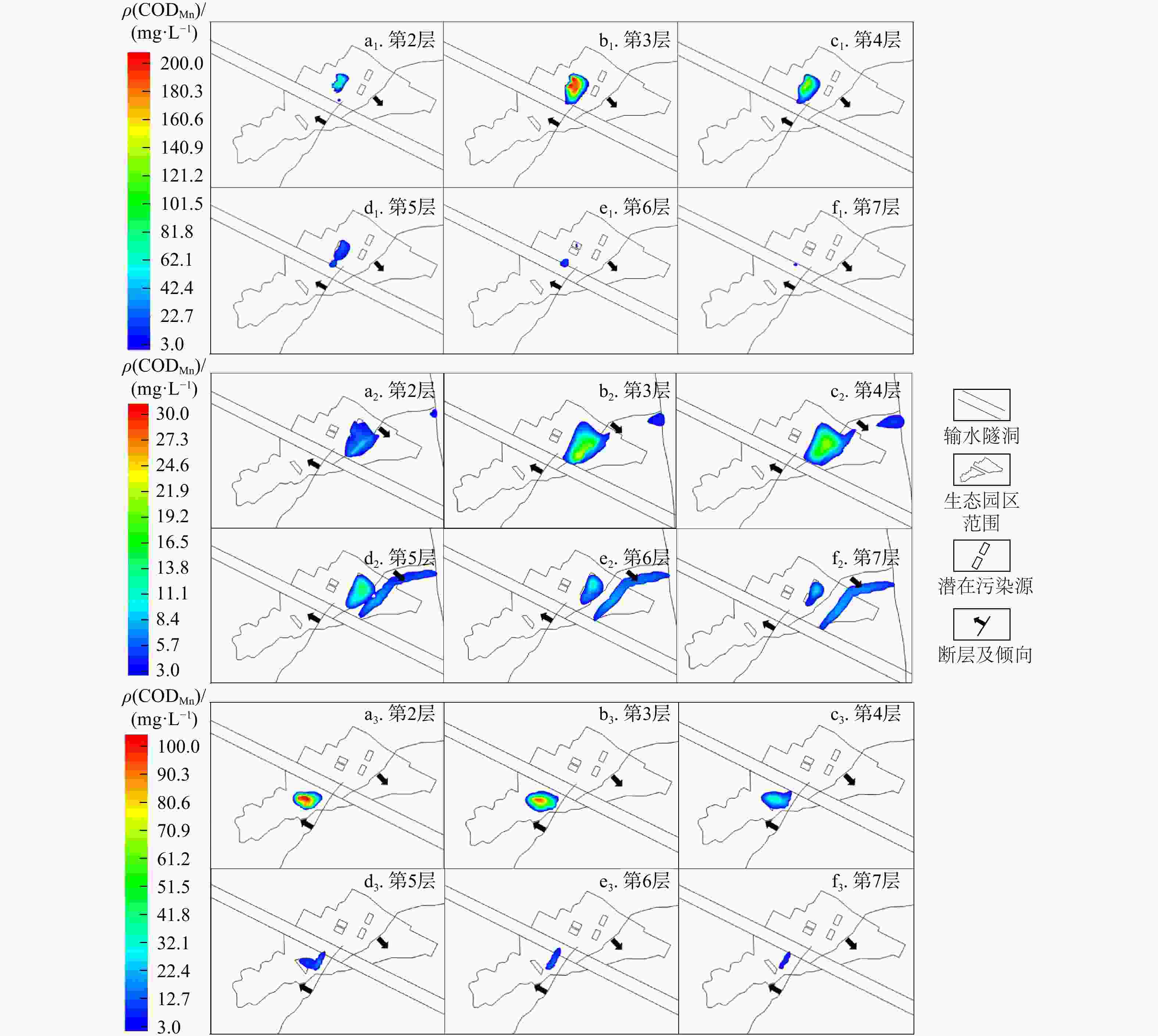 Figure 10.  CODMn distribution in the pollution plume at 2nd layer to 7th layer of leakage source scenarios No.1 (a1-f1), No.2 (a2-f2) and No.3 (a3-f3) on the 450th day