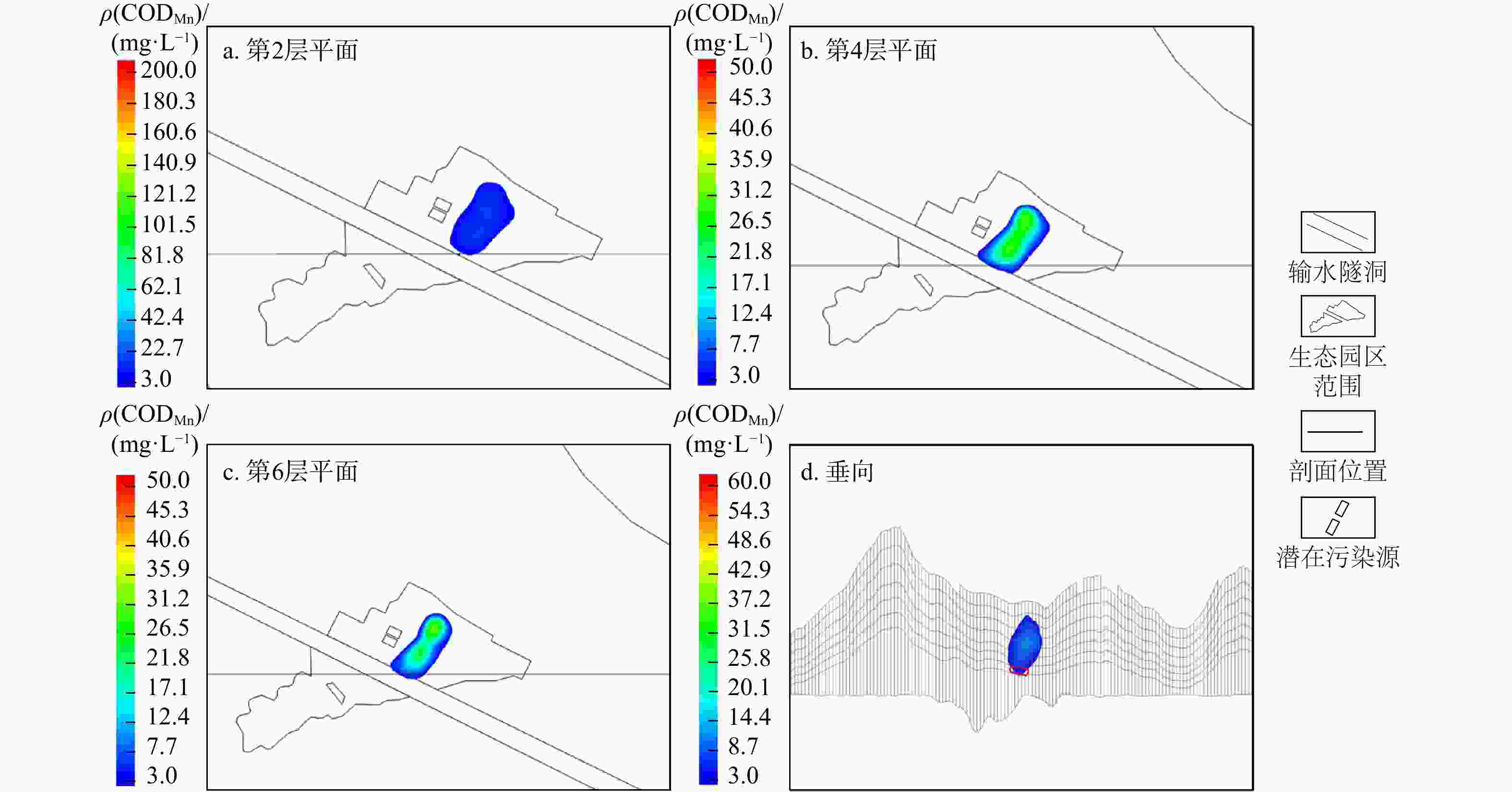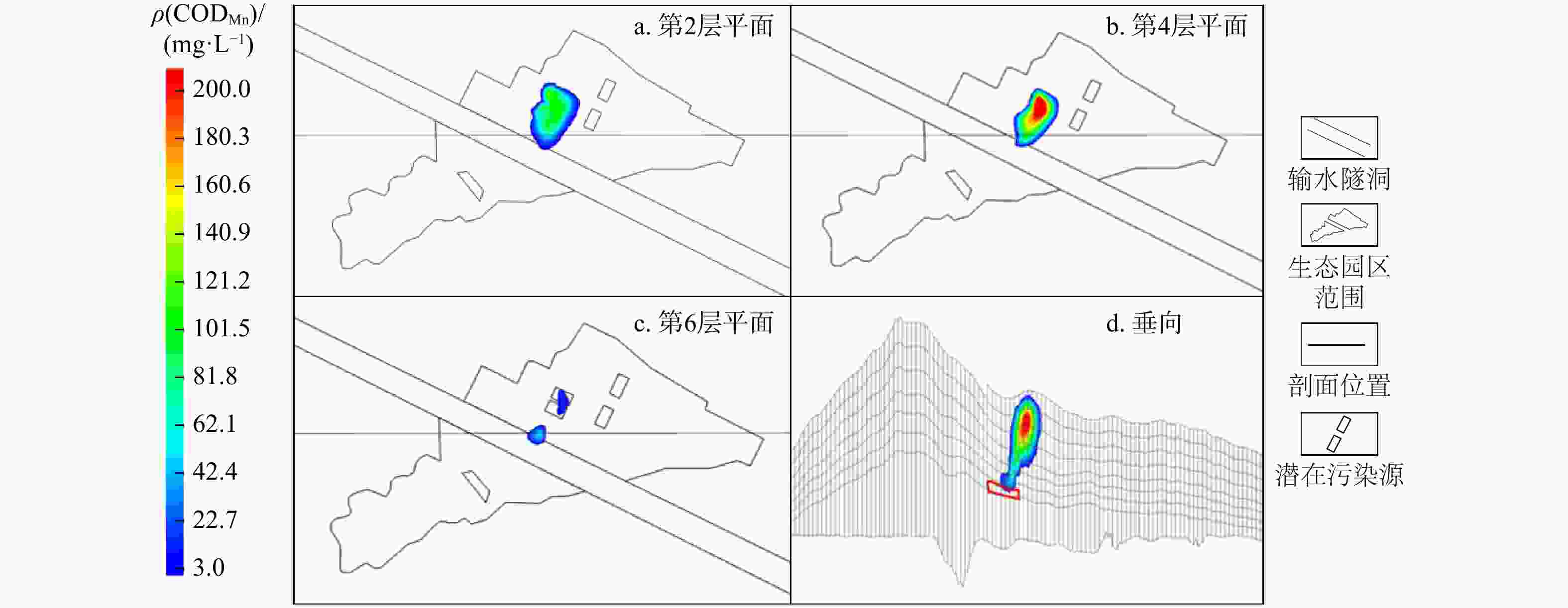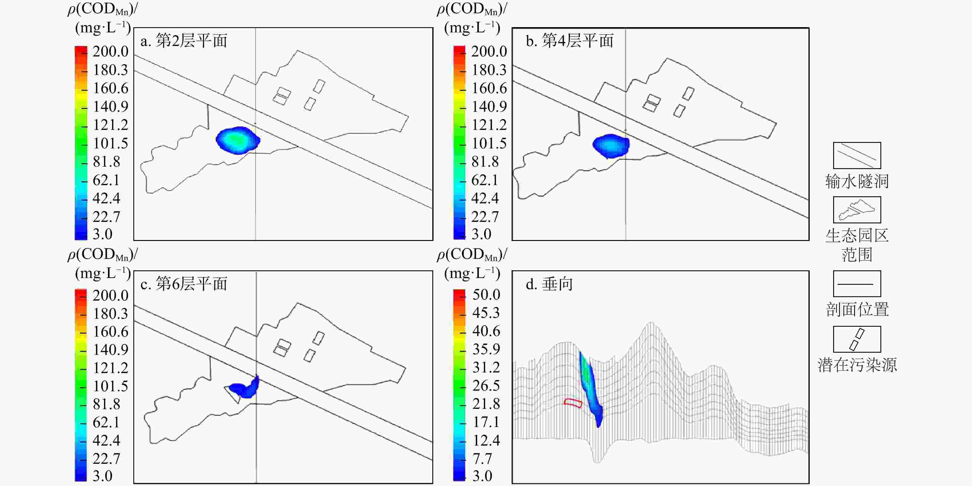 Figure 9.  CODMn distribution in the plane pollution plume at 2nd(a), 4th(b), and 6th(c) layers and in the vertical pollution plume (d) of leakage source area No.3 on the 1095th day