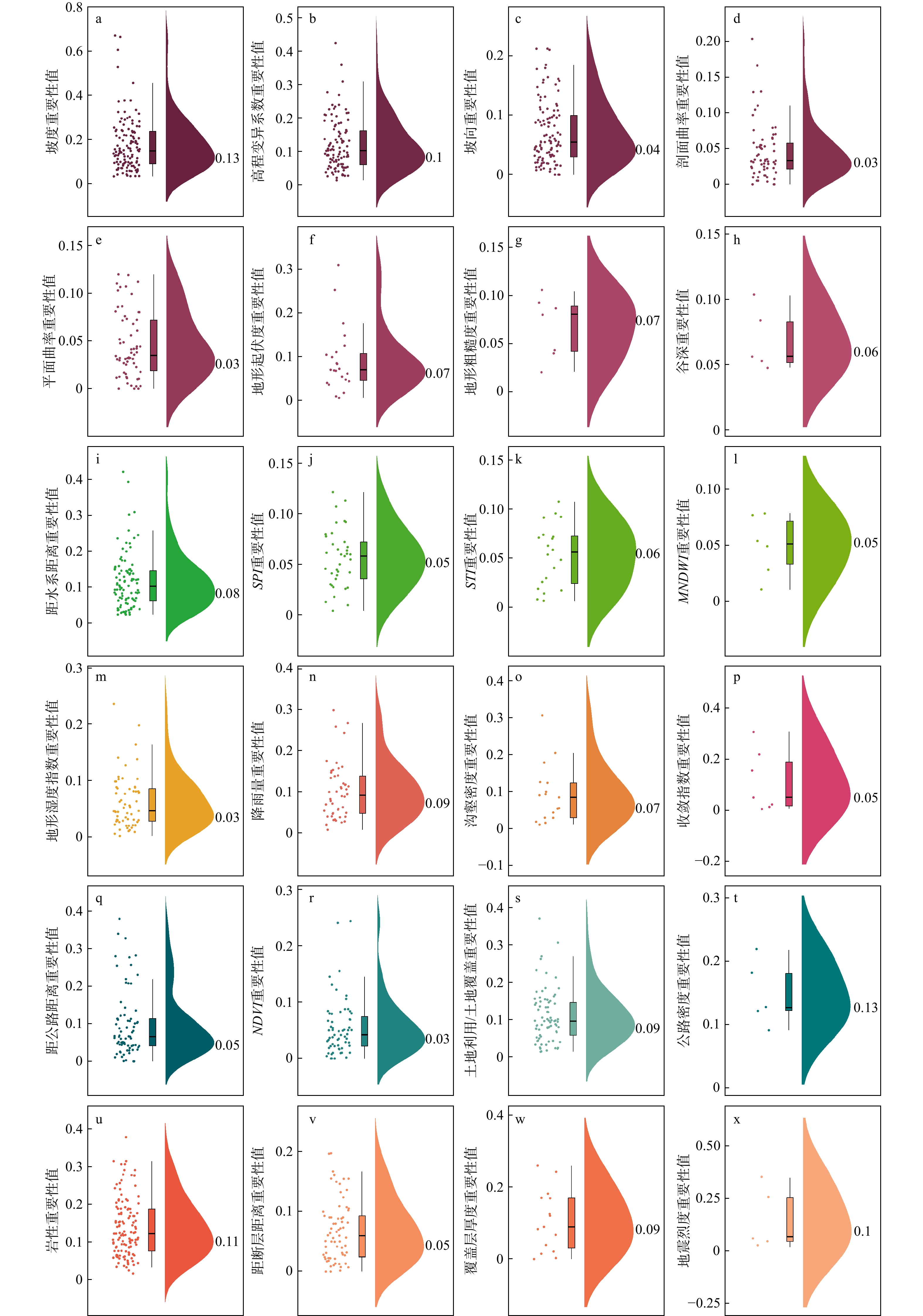 LULC. 土地利用/土地覆盖;TWI. 地形湿度指数;SPI. 水流强度指数;STI. 沉积物运移指数;NDVI. 归一化差异植被指数;NDBI. 归一化差异建筑指数;MNDWI. 修正的归一化差异水体指数;TPI. 地形位置指数;TRI. 地形韧性指数;LS. 坡长陡度;PGA. 地面峰值加速度;TST. 地形表面纹理;TSC. 地形表面凸度;CI. 收敛指数;下同