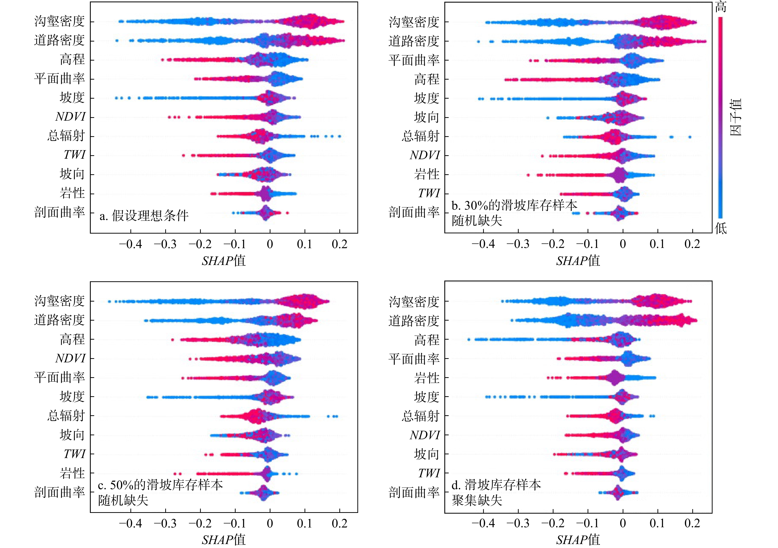 图 9 基于SHAP法解释不同滑坡样本缺失条件下的滑坡易发性预测结果[115]
