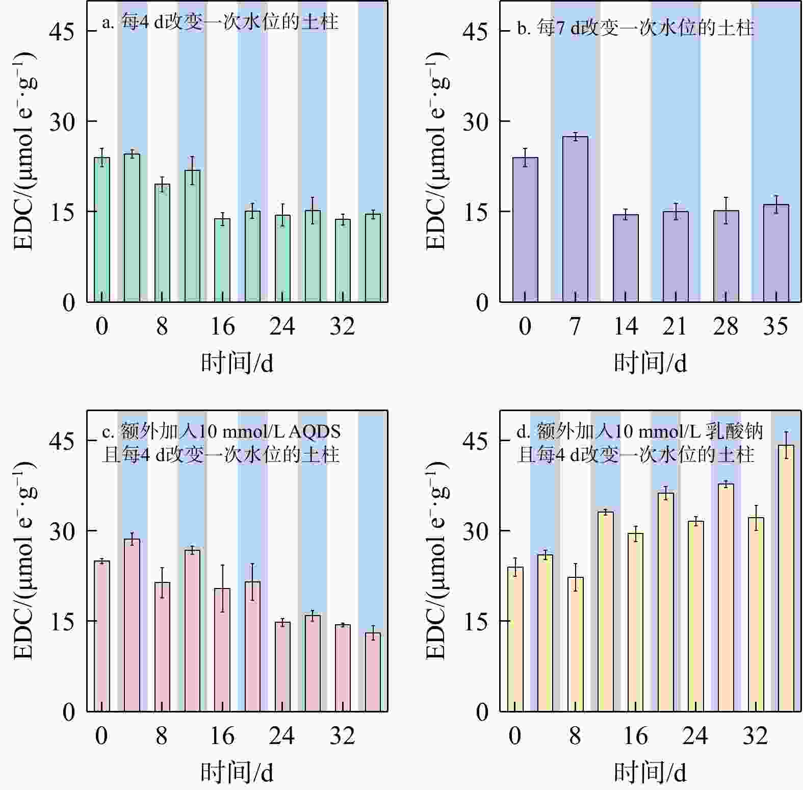 图 3  不同水位波动模式下沉积物给电子容量EDC变化(背景中的蓝色带表示在高水位时采集的样本,白色带表示在低水位时采集的样本)