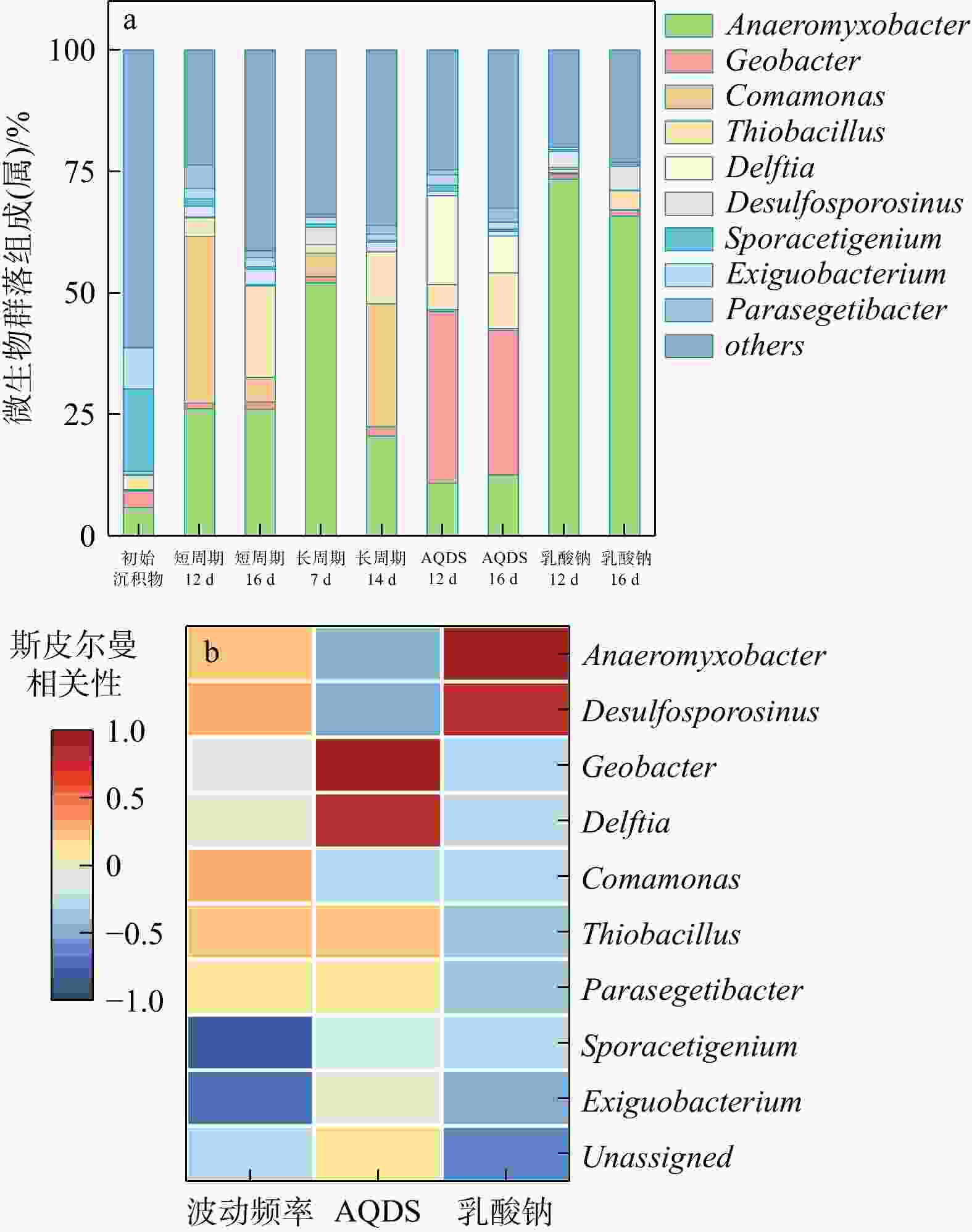 a. 沉积物中丰度前10 的属;b. 微生物与环境因子相关性分析