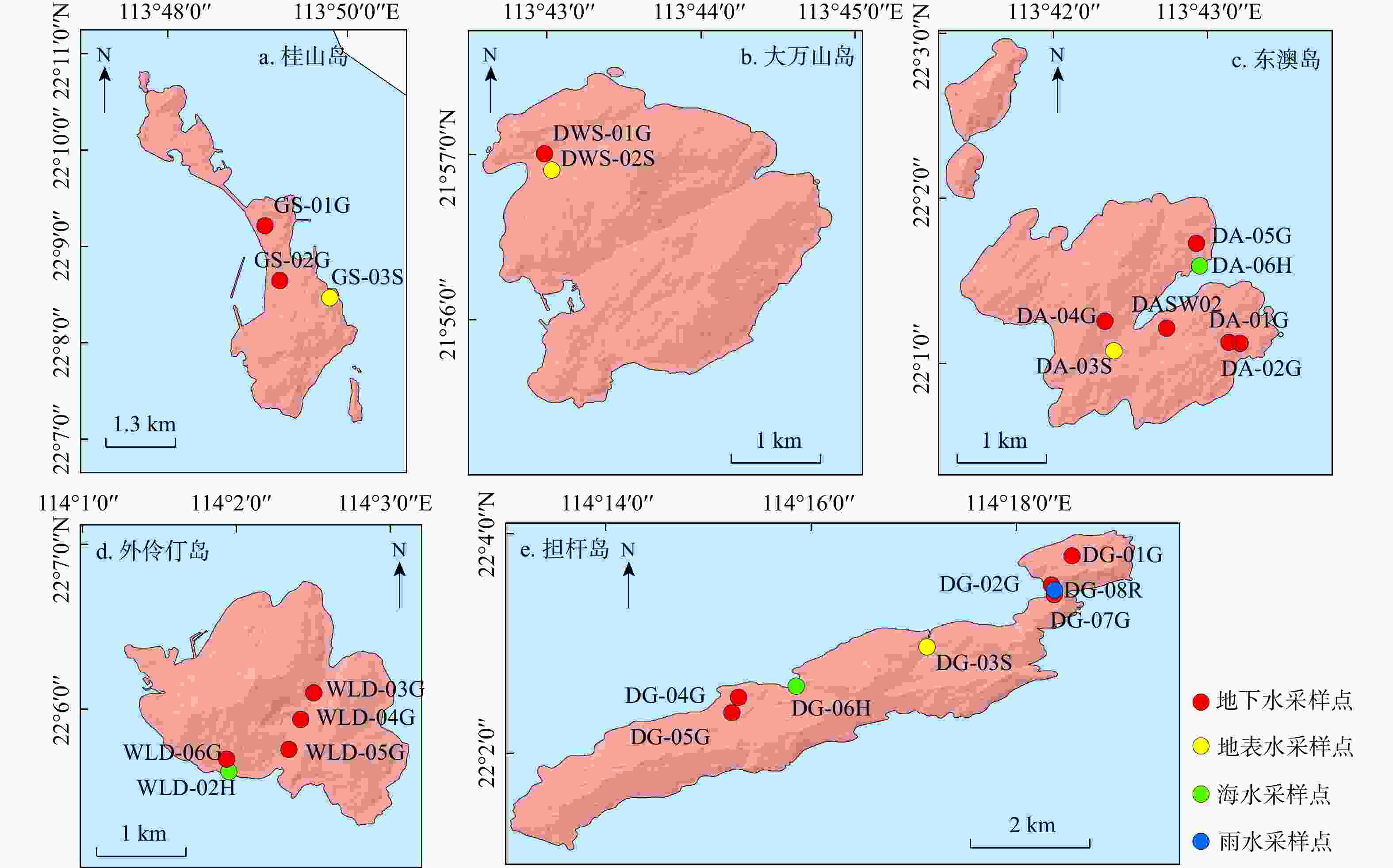 岛屿 样品编号 水样类型 经度 纬度 井深/m 担杆岛 DG-01G 地下水 114°18' 29.7342 "22°03' 42.5085 "5 DG-02G 地下水(泉) 114°18' 20.4065 "22°03' 27.0176 "5 DG-03S 地表水(水库) 114°17'08.4697" 22°03'00.0888" − DG-04G 地下水(泉水) 114°15' 13.9114 "22°02' 23.8950 "5 DG-05G 地下水 114°15' 18.7394 "22°02' 30.5898 "5 DG-06H 海水 114°15' 52.0525 "22°02' 37.2308 "− DG-07G 地下水 114°18' 20.4644 "22°03' 29.9798 "5 DG-08R 雨水 114°18' 21.0535 "22°03' 28.4943 "− 外伶仃岛 WLD-02H 海水 114°01' 50.1017 "22°05' 39.6276 "− WLD-03G 地下水 114°02' 30.3187 "22°06'05.2956" 150 WLD-04G 地下水 114°02' 22.6905 "22°05' 57.6910 "100 WLD-05G 地下水 114°02' 18.2391 "22°05' 46.6330 "150 WLD-06G 地下水 114°02' 19.2144 "22°05' 51.6610 "150 桂山岛 GS-01G 地下水 113°49'05.9199" 22°09'06.8039" 150 GS-02G 地下水 113°49' 13.7799 "22°08' 38.3458 "100 GS-03S 地表水(水库) 113°49' 42.5353 "22°08' 32.7470 "− 东澳岛 DA-01G 地下水 113°43' 10.7354 "22°01'08.1517" 290 DA-02G 地下水 113°43' 15.0613 "22°01'07.4580" 150 DA-03S 地表水(水库) 113°42' 21.9921 "22°01'04.5532" − DA-04G 地下水 113°42' 19.0857 "22°01' 21.2389 "150 DA-05G 地下水 113°42' 54.7355 "22°01' 40.6720 "103 DA-06H 海水 113°42' 54.8031 "22°01' 38.4253 "− DASW02 地下水 113°42′45.89″ 22°1′14.28″ 310 大万山岛 DWS-01G 地下水 113°42' 58.3178 "21°56' 59.1636 "300 DWS-02S 地表水(河流) 113°43' 24.7751 "21°55' 54.4524 "− -