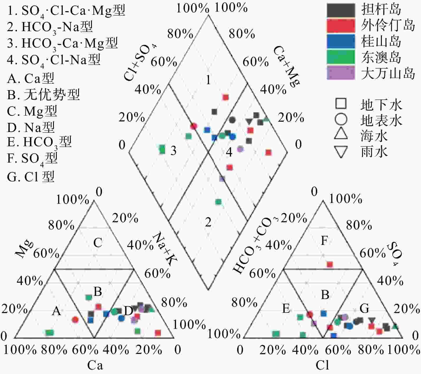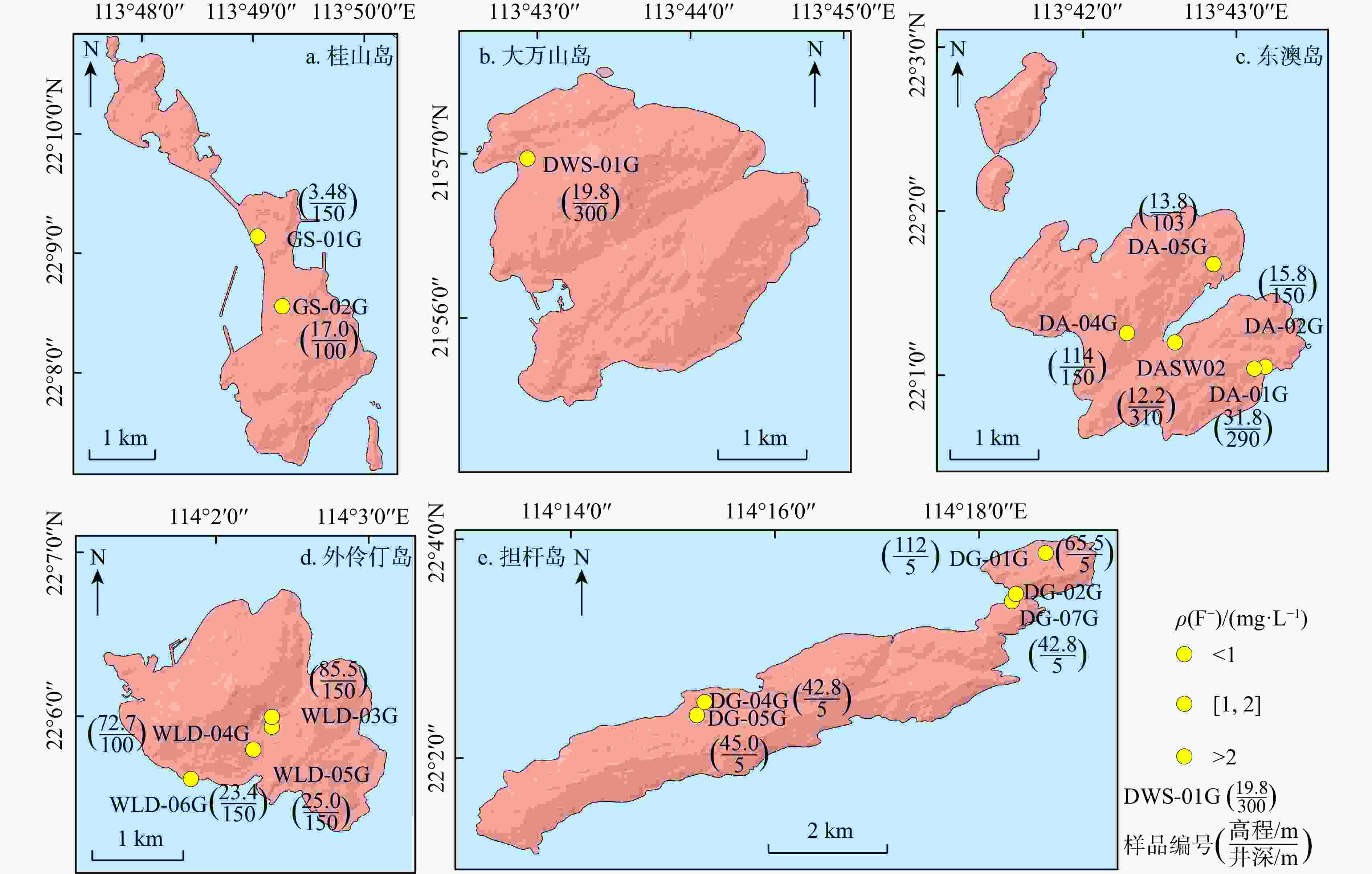 纪 世 阶段期次 代号 岩性 岛屿 白垩纪 晚白垩世 不明 γπK2 花岗斑岩 东澳岛、大万山岛 早白垩世 第二阶段第一次侵入 γK12a 细粒(含斑)黑云母花岗岩 桂山岛 侏罗纪 晚侏罗世 第一阶段第三次侵入 ηγJ31c 中细−中粗粒黑云母二长花岗岩 桂山岛、外伶仃岛、东澳岛、大万山岛、担杆岛 表 2 研究区采样点分布、样品编号、水样类型、经纬度及井深