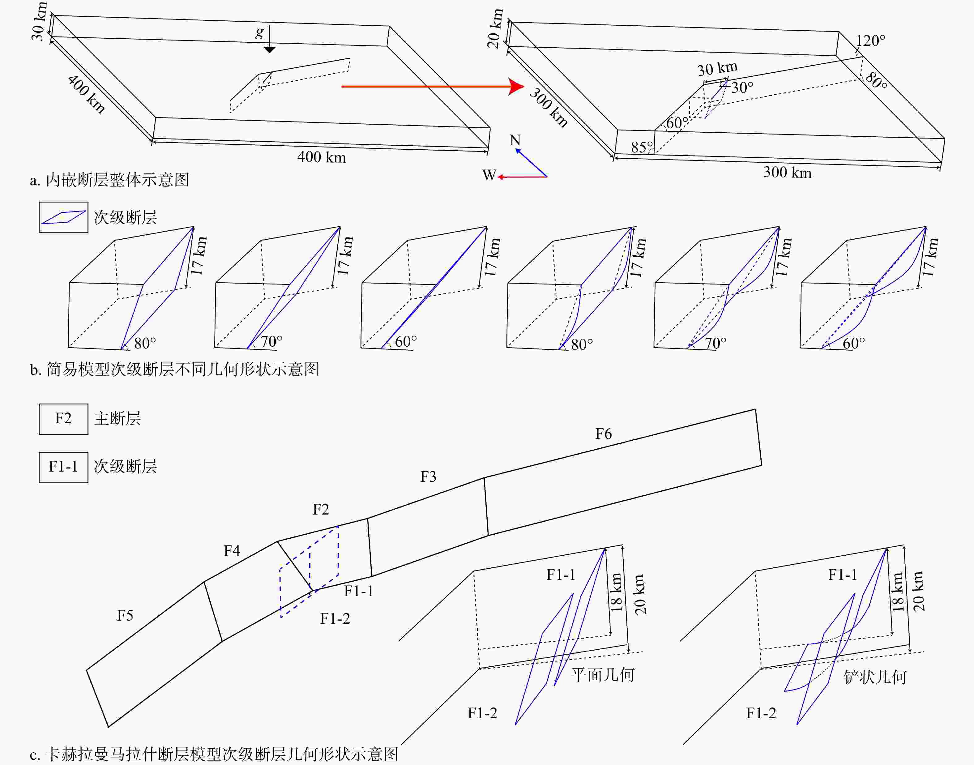 模型参数及单位 取值 重力加速度g/(m·s−2) 9.81 密度ρ/(kg·m−3) 2700 杨氏模量E/Pa 3.40×1010 泊松比r 0.3 时间子步/s 0.005 摩擦系数μ 0.6 $ \alpha $(逆冲型参数) 3 $ \alpha $(走滑型参数) 1.2 $ \alpha $(正断层型参数) 0.75 -