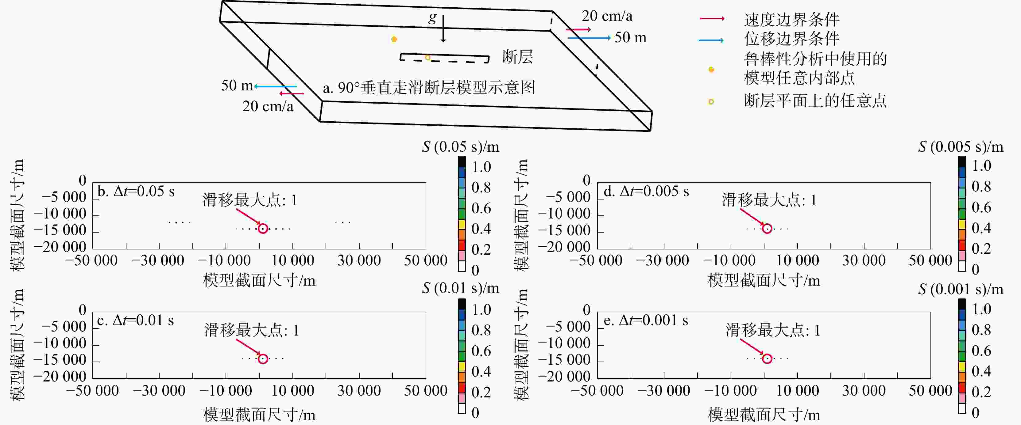 a. 有无矫正误差动态模拟初始子步(0.005 s)的滑动量及稳定后(100 s)断层的右旋滑动分布;b. 断层模型内任意点有无矫正误差的垂直位移和整体位移变形模式曲线图,其中所有模型的滑移量和地表垂直变形量都进行了归一化处理;c. t = 20, 40, 60, 80 s时断面上的横向滑动