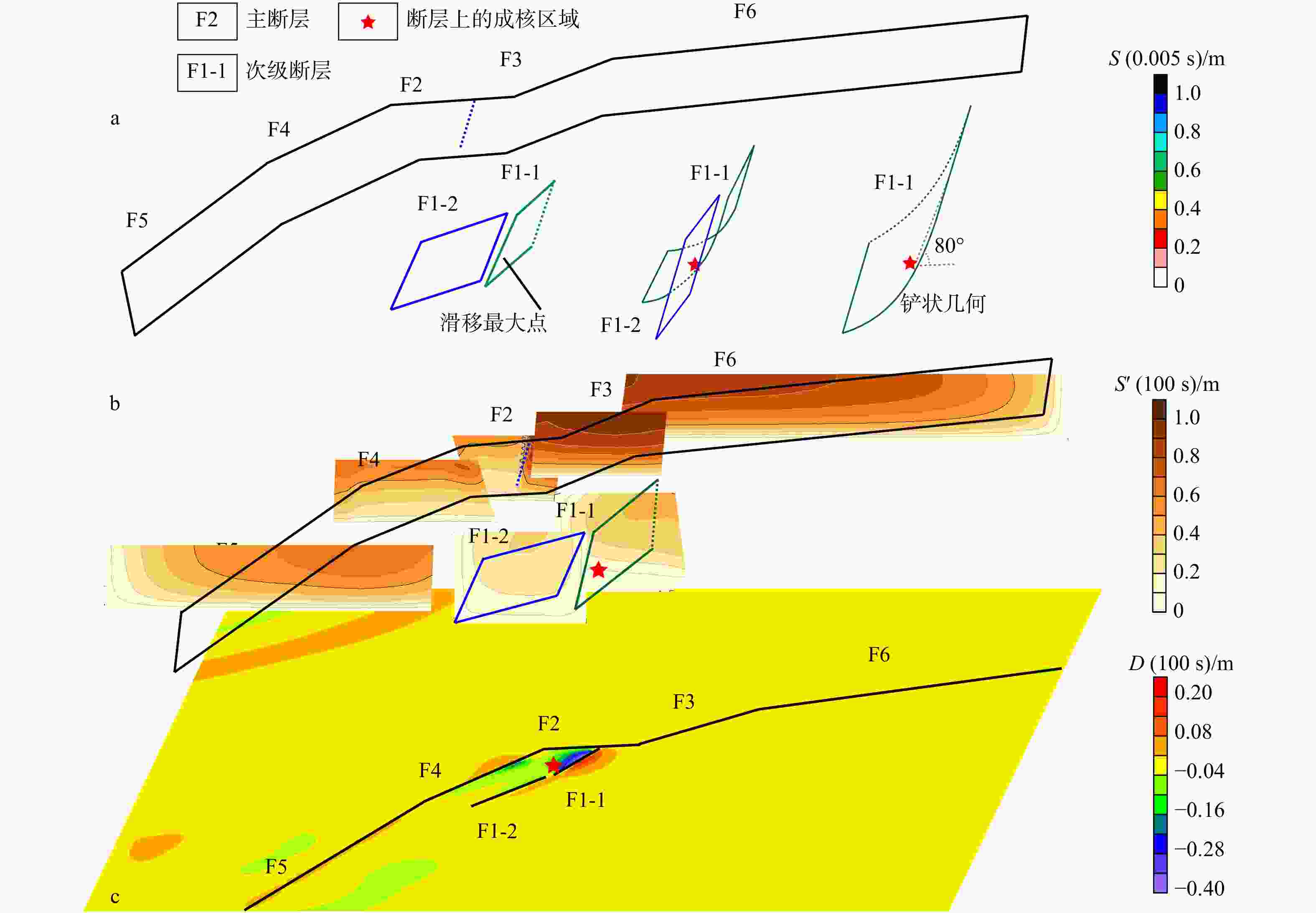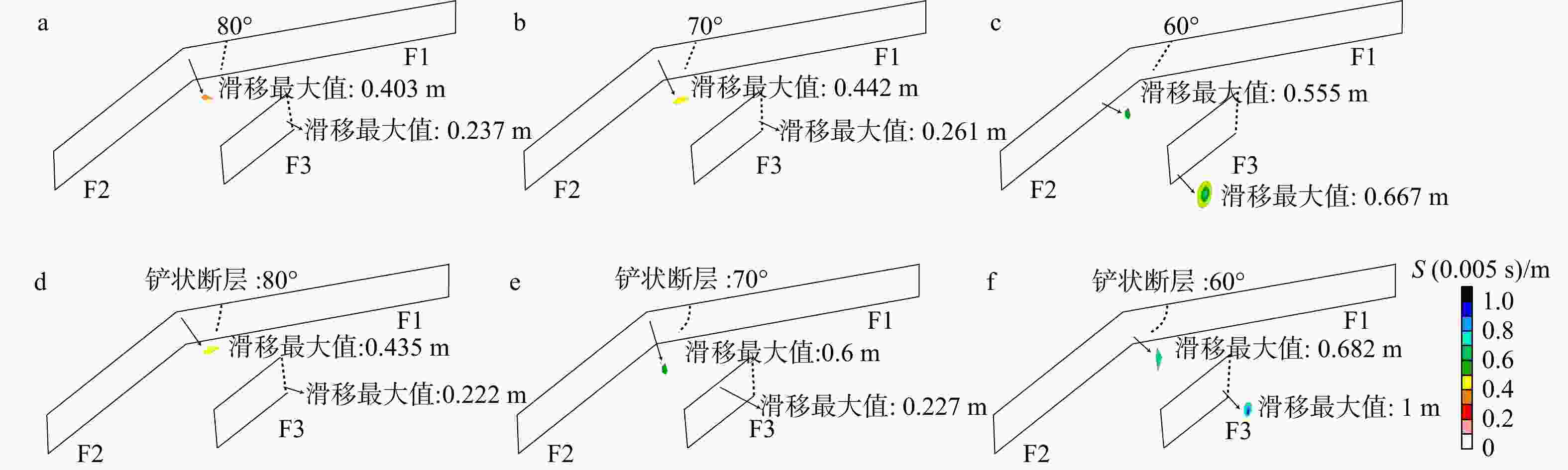 断层部位 F1-1 F1-2 F2 F3 F4 F5 F6 走向/(°) 202 210 248 231 31 23 247 倾向/(°) 80 铲状 80 80 80 80 70 表 2 模型参数