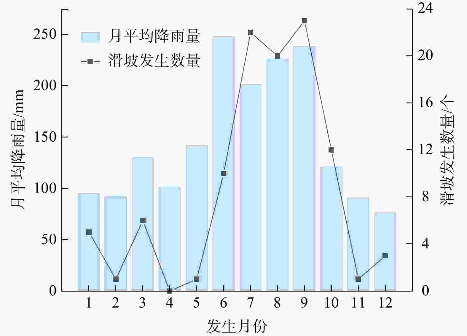 图 2  研究区(2010−2022年)月平均降雨量与滑坡灾害频次图