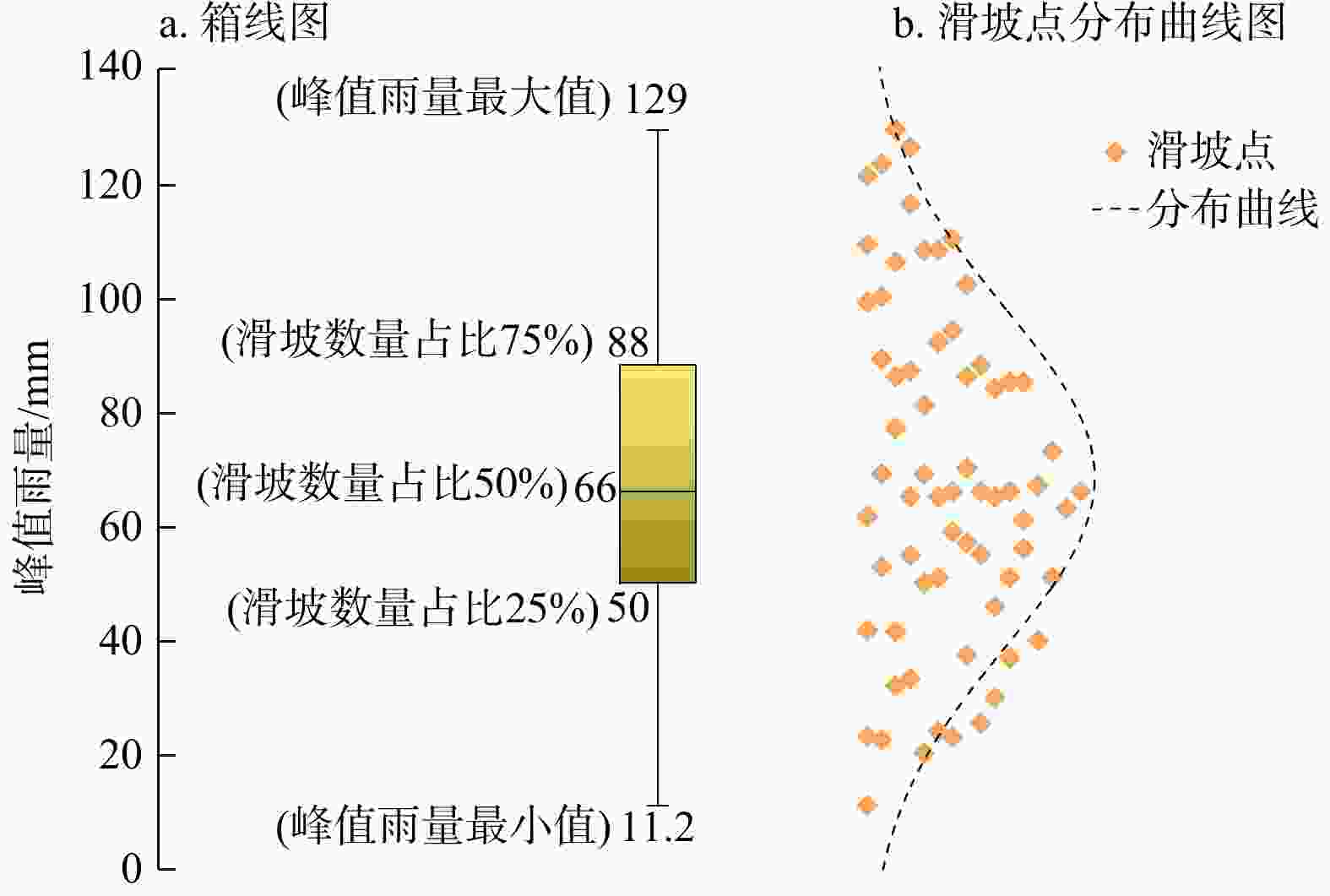 图 4  研究区滑坡发生时峰值雨量分布图(2010-2022年66起滑坡,下同)