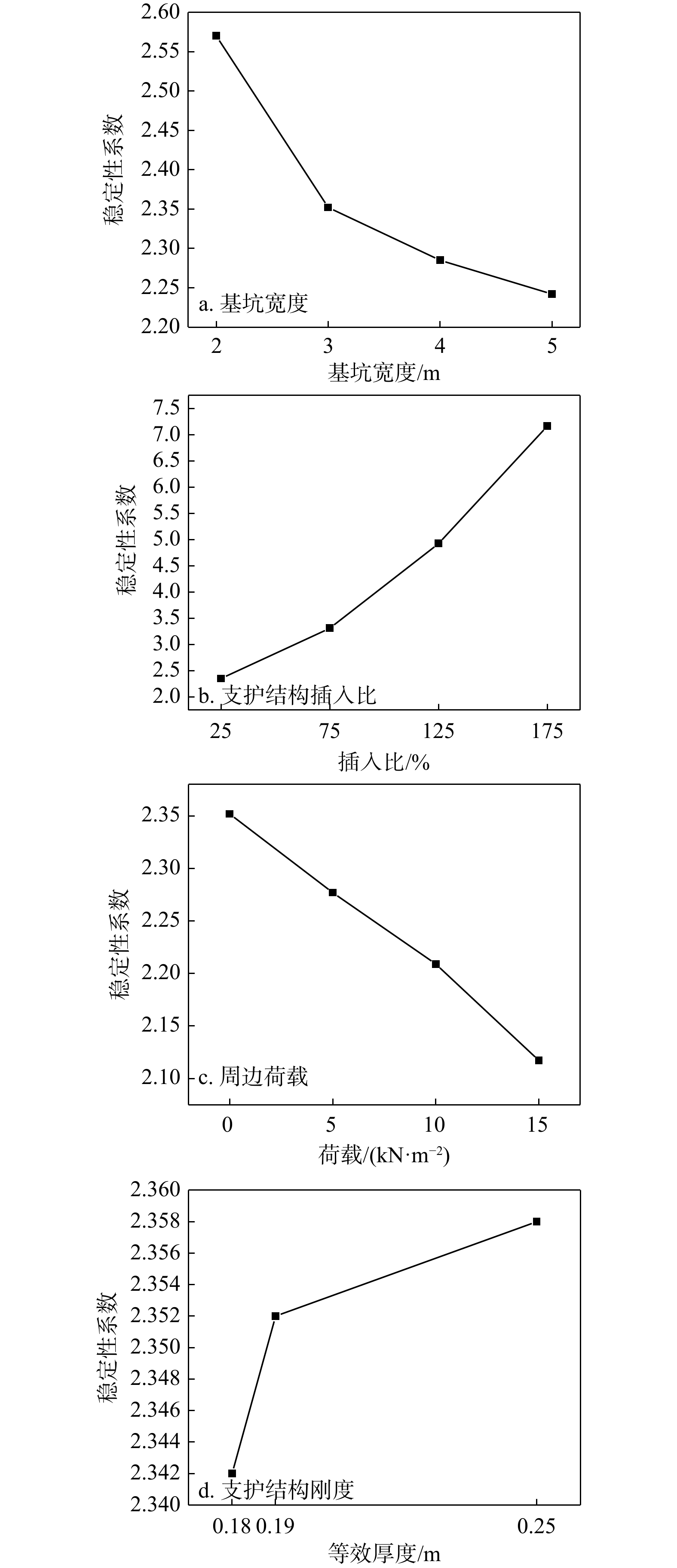 图 12 基坑宽度(a)、支护结构插入比(b)、周边荷载(c)和支护结构刚度(d)对狭窄基坑抗隆起稳定性的影响