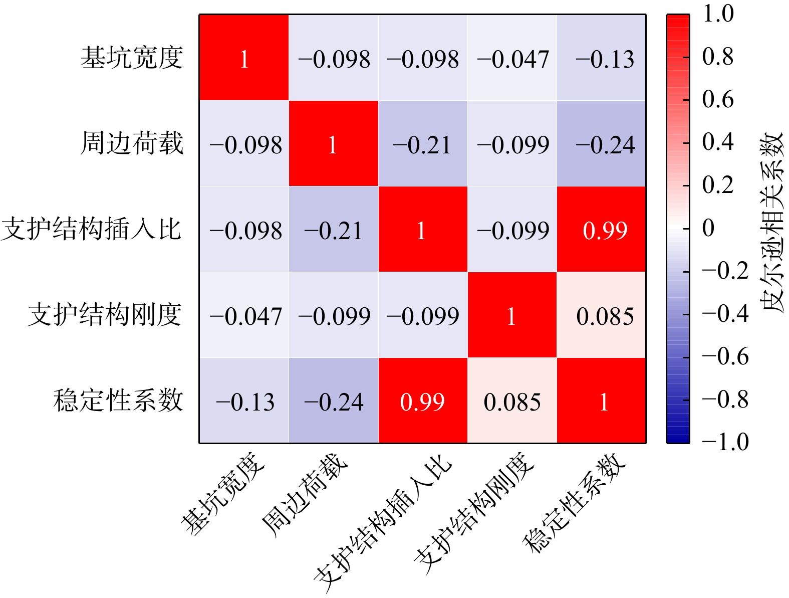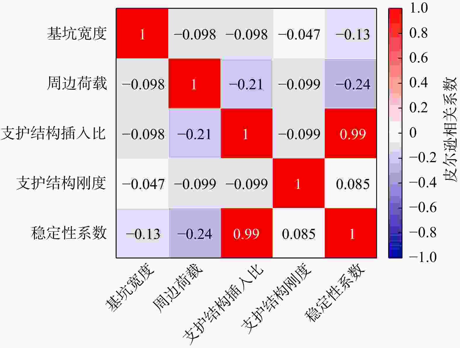 影响因素 皮尔逊相关系数 重要程度 排列顺序 基坑宽度 −0.13 3 周边荷载 −0.24 2 支护结构插入比 0.99 1 支护结构刚度 0.085 4 -